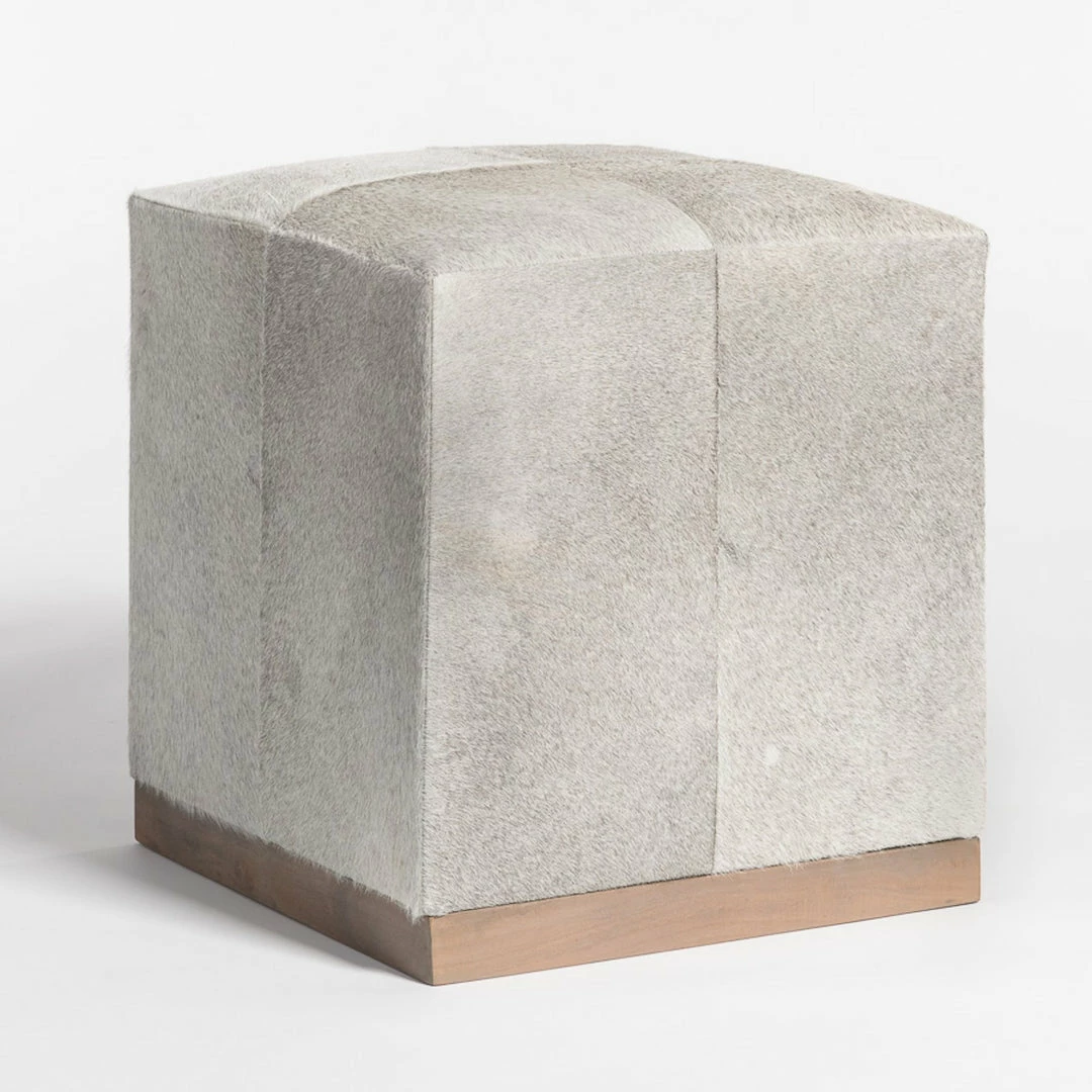 A clean-lined square on a wooden plinth is a showcase for luxe materials and sleek design. Made with hide (note: Hides naturally vary in tone and color since this is a natural product) With a perfectly cushioned top suitable for seating or as a second coffee table surface, it’s an understated complement to any contemporary space.