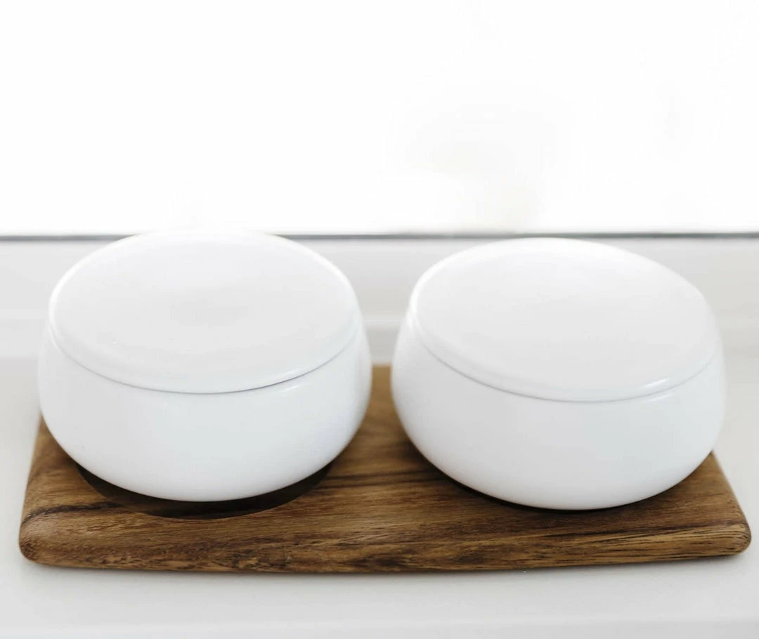 Set of 2, Acacia wood tray and stoneware containers. Microware and dishwasher safe.Β