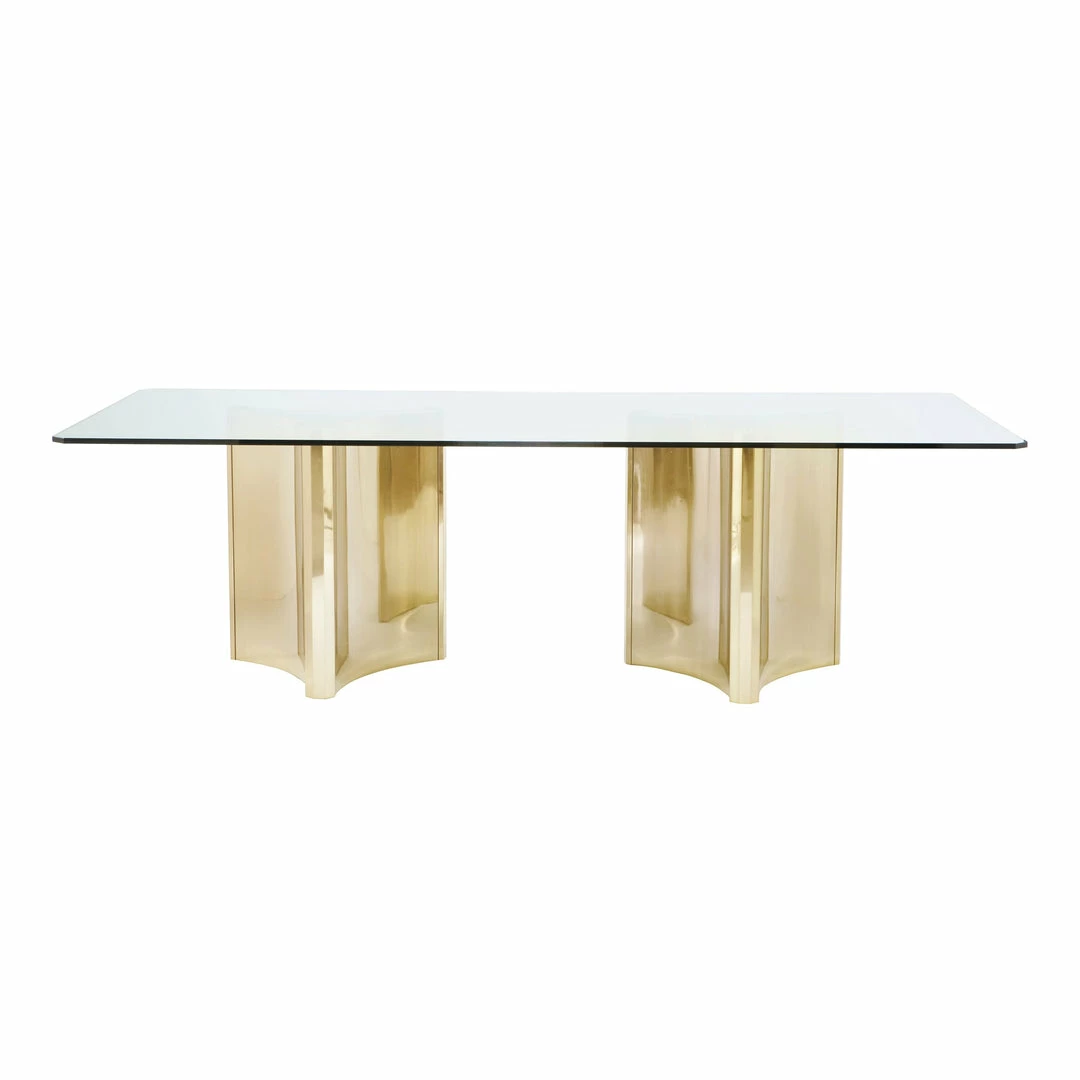 Steel base in Patinated Brass finish sold separately. 5/8″ clear glass top with clipped corners and eased edge and adjustable glides. Pop-in glass bumpers included.