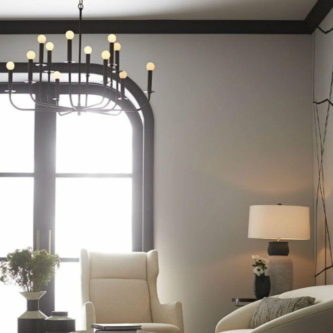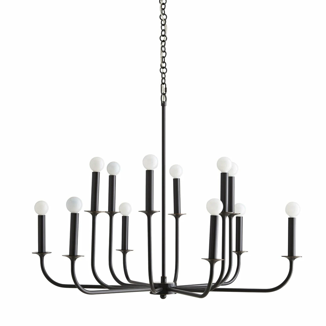 This chandelier features steel arms that curve upwards reaching from a center point at two different heights to create a double tier effect. The entire structure is finished in bronze and is constructed with a seamless design. It holds twelve exposed bulbs for maximum light. Damp-rated, although limited covered outdoor conditions may affect the finish. Available in Antique Bronze and Antique Brass.