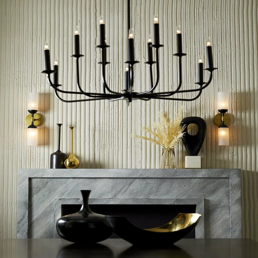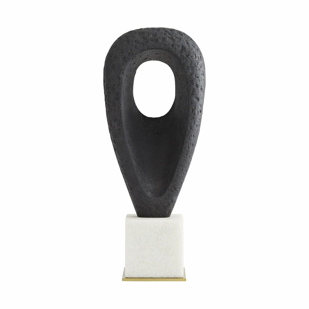 Mid-century modern style takes shape in this sculptural form. Rice stone aptly finished in bold charcoal features additional texture along its exterior to create an aspect that is both visual and tangible. Mounted on a white rice stone platform this sculpture shows like a work of art. A thin antique brass base adds a slightly upscale element to its overall organic composition. Finish may vary.
