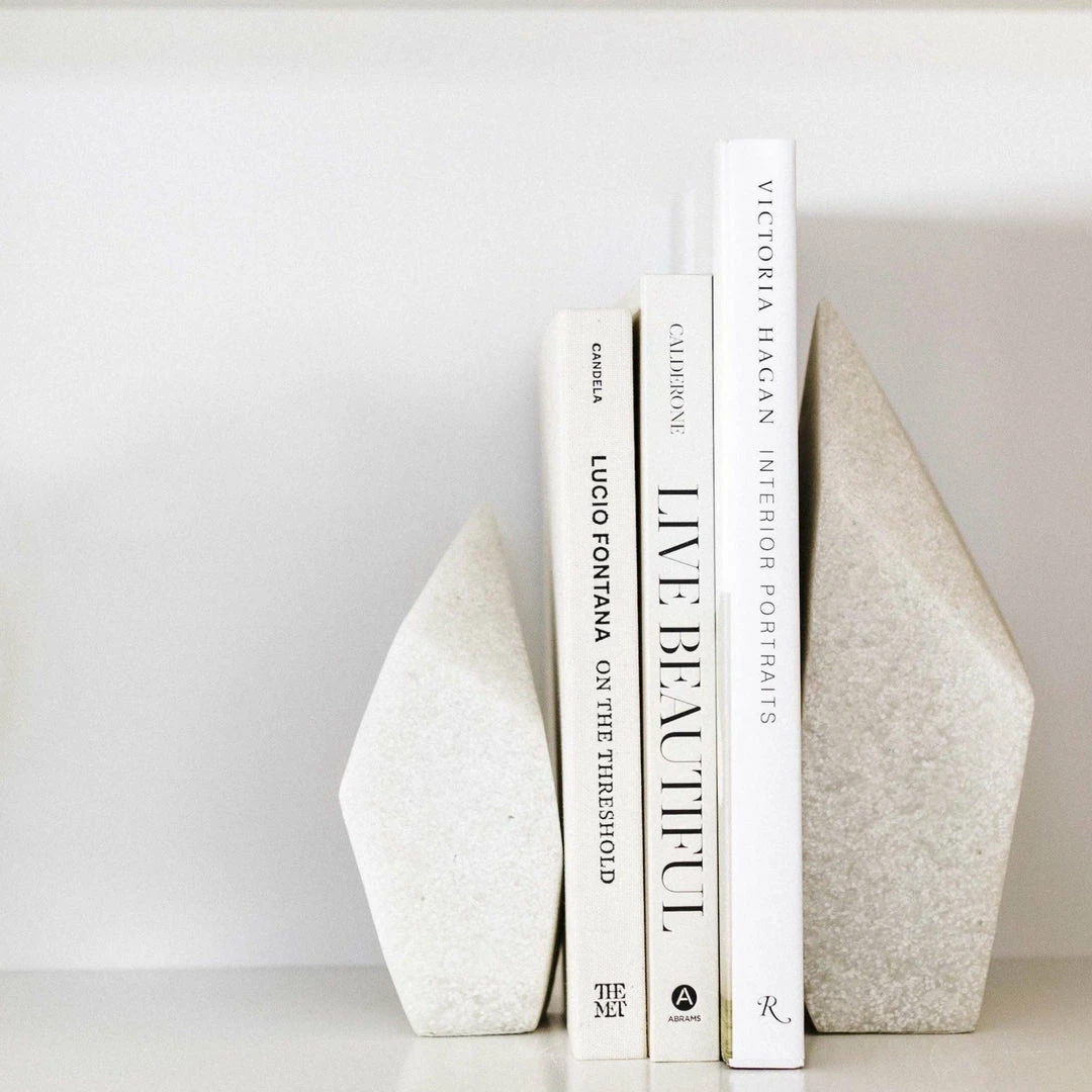 Like geometric pillars, these sculptures add a bit of modern sophistication to a table, desk, or shelf. The ivory finish makes them almost identical to marble, with even, prism surfaces and clean lines with modern class. They provide form or function, whether as bookends and paperweights or simply as decorative accents to elevate a look.
