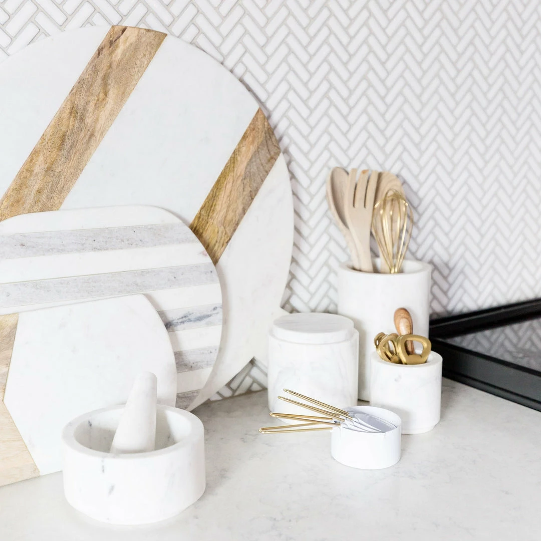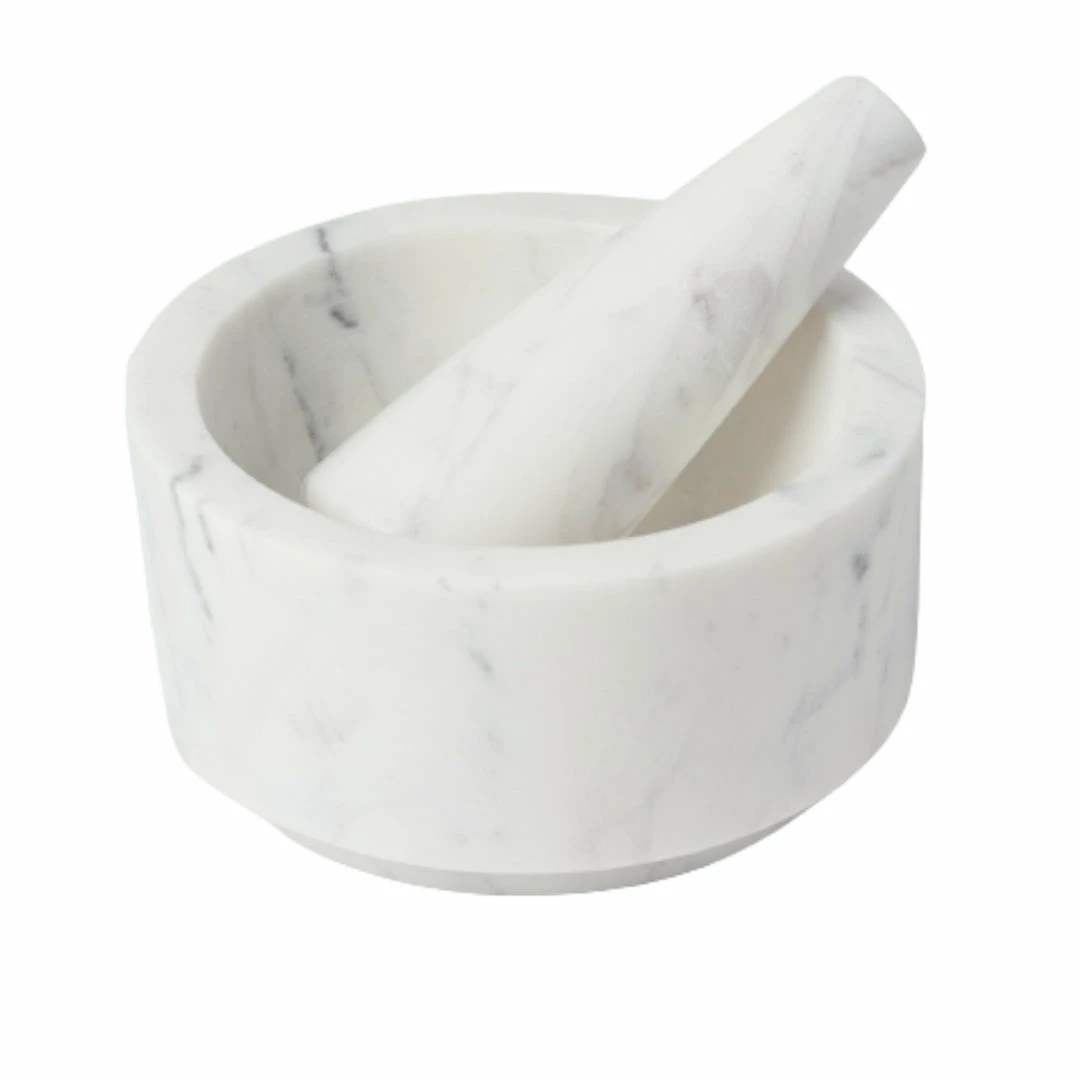 White marble mortar and pestle is perfect for crushing herbs, spices and pill. All pieces constructed from solid and of beautiful white marble with grey accents.