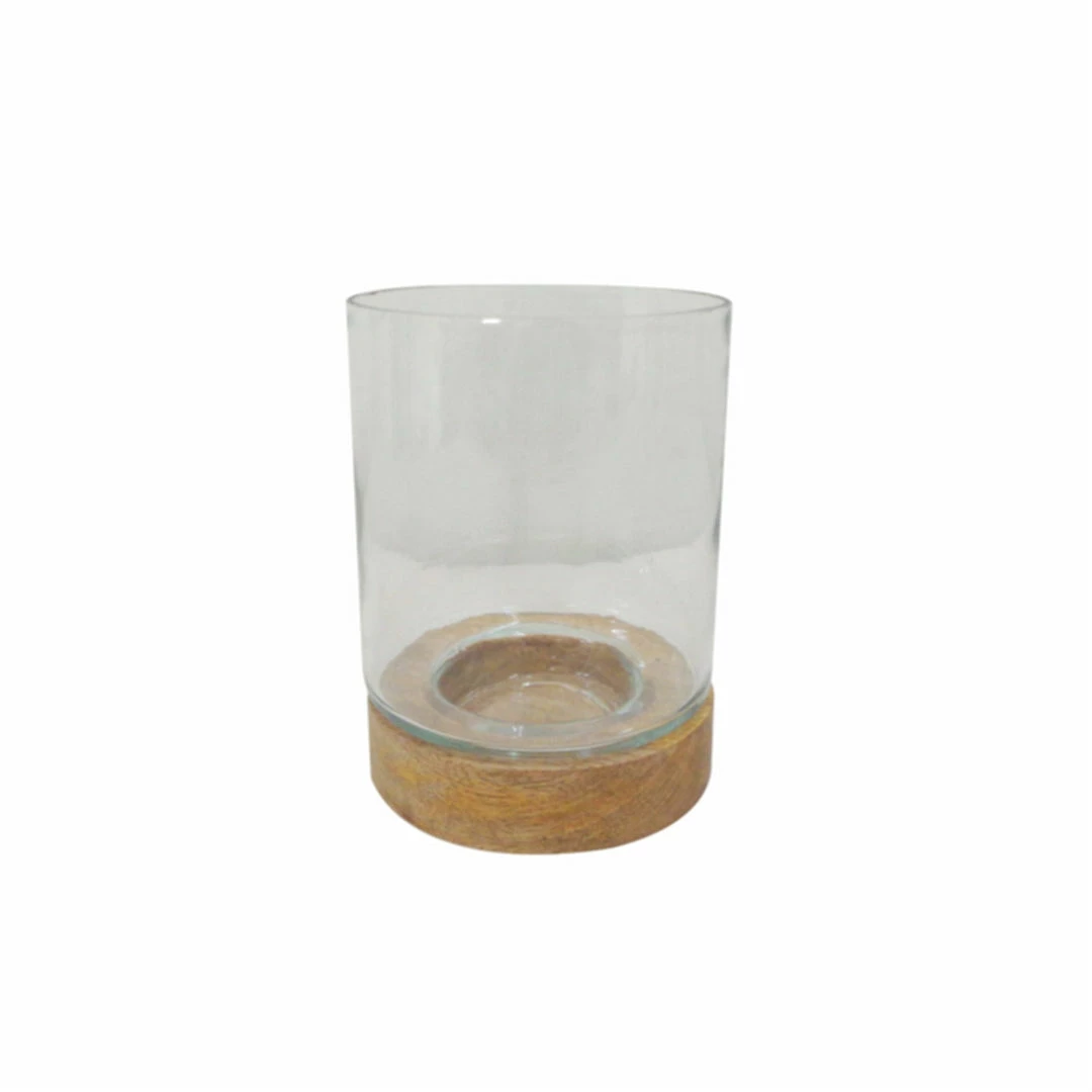 Clear/natural glass with mango wood base. Perfect for dressing up your standard candles.