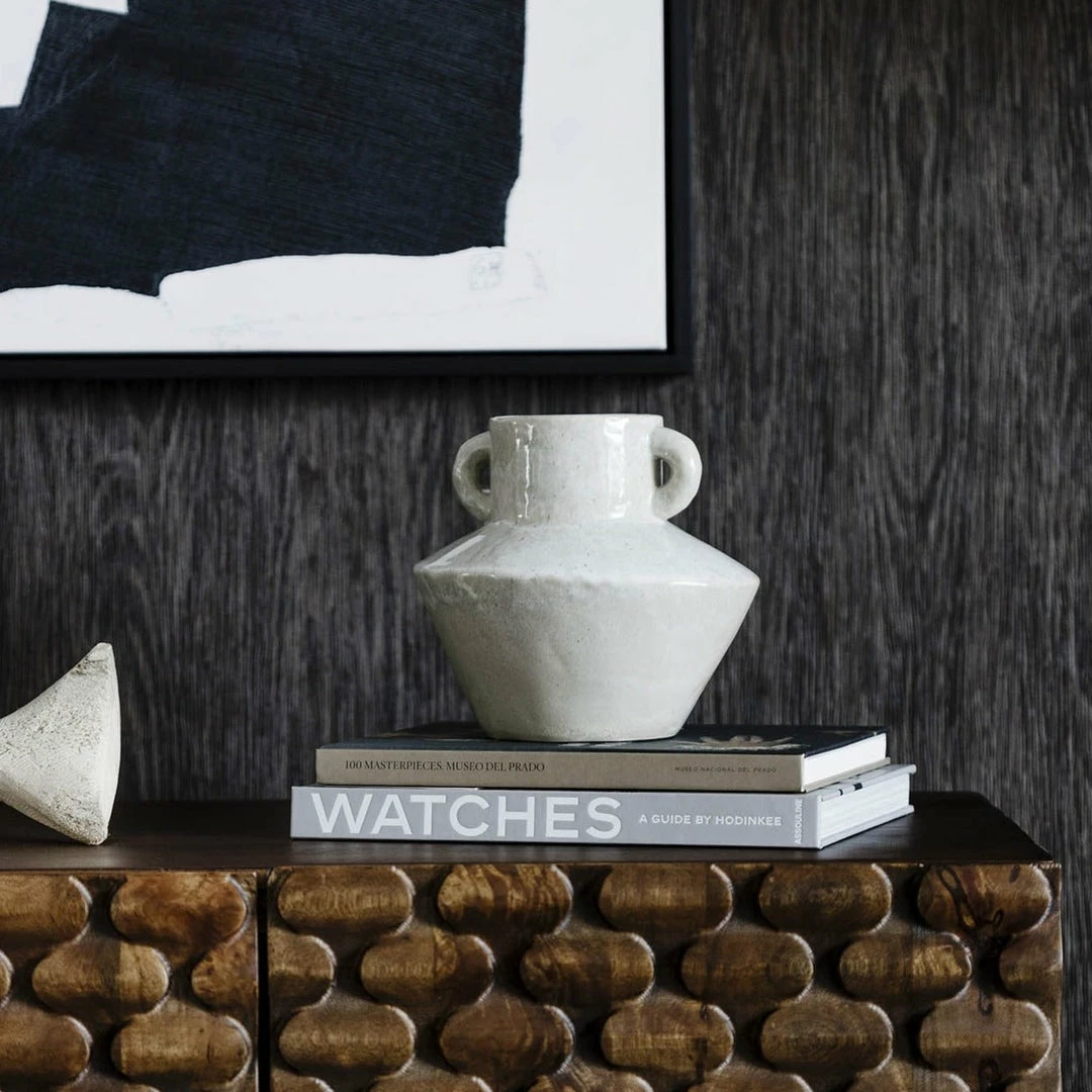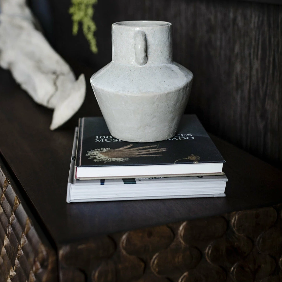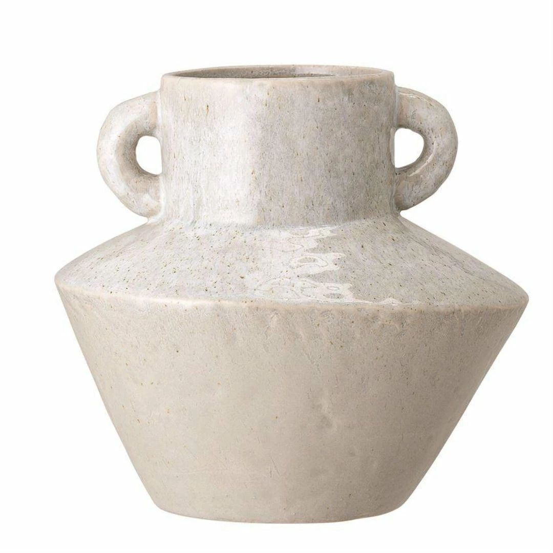 The Anita Vase is a stoneware vase with handles. It is finished with a reactive glaze. The color of the vase is off-white/grey.