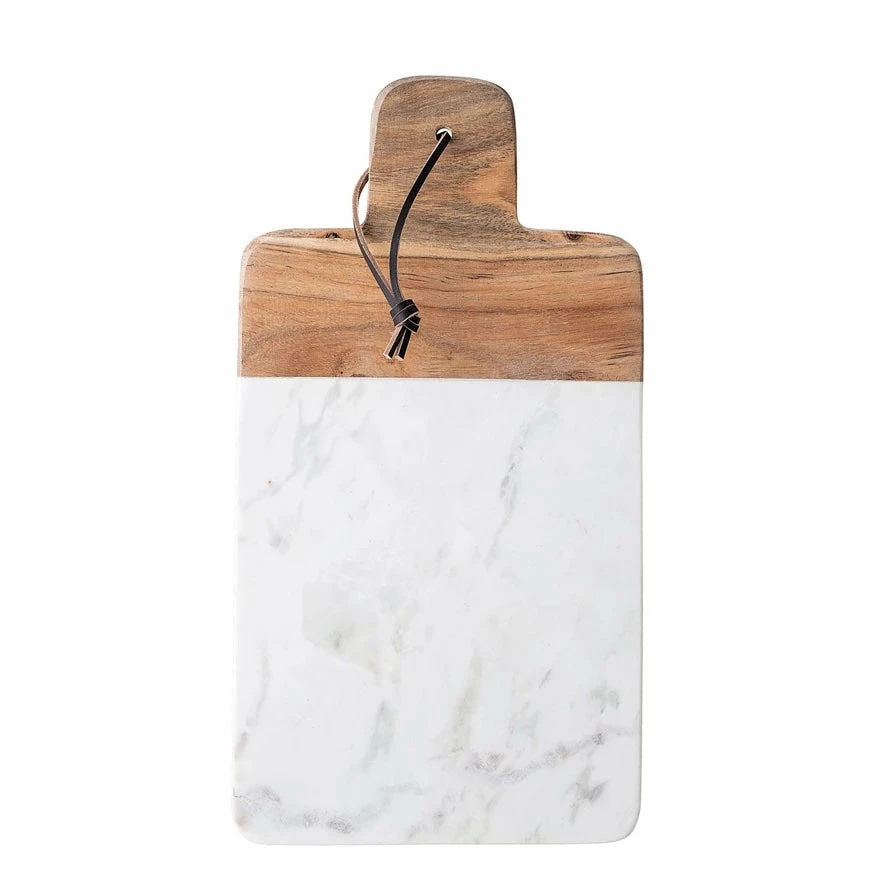 Prep and present special treats, snacks and other foods with this marble and mango wood cutting board. The board is perfect for a special cheese or hors d oeuvre and can be easily transported from counter to table or buffet. When not in use, display it on a shelf or hang on a wall for an amazing decorative accent.