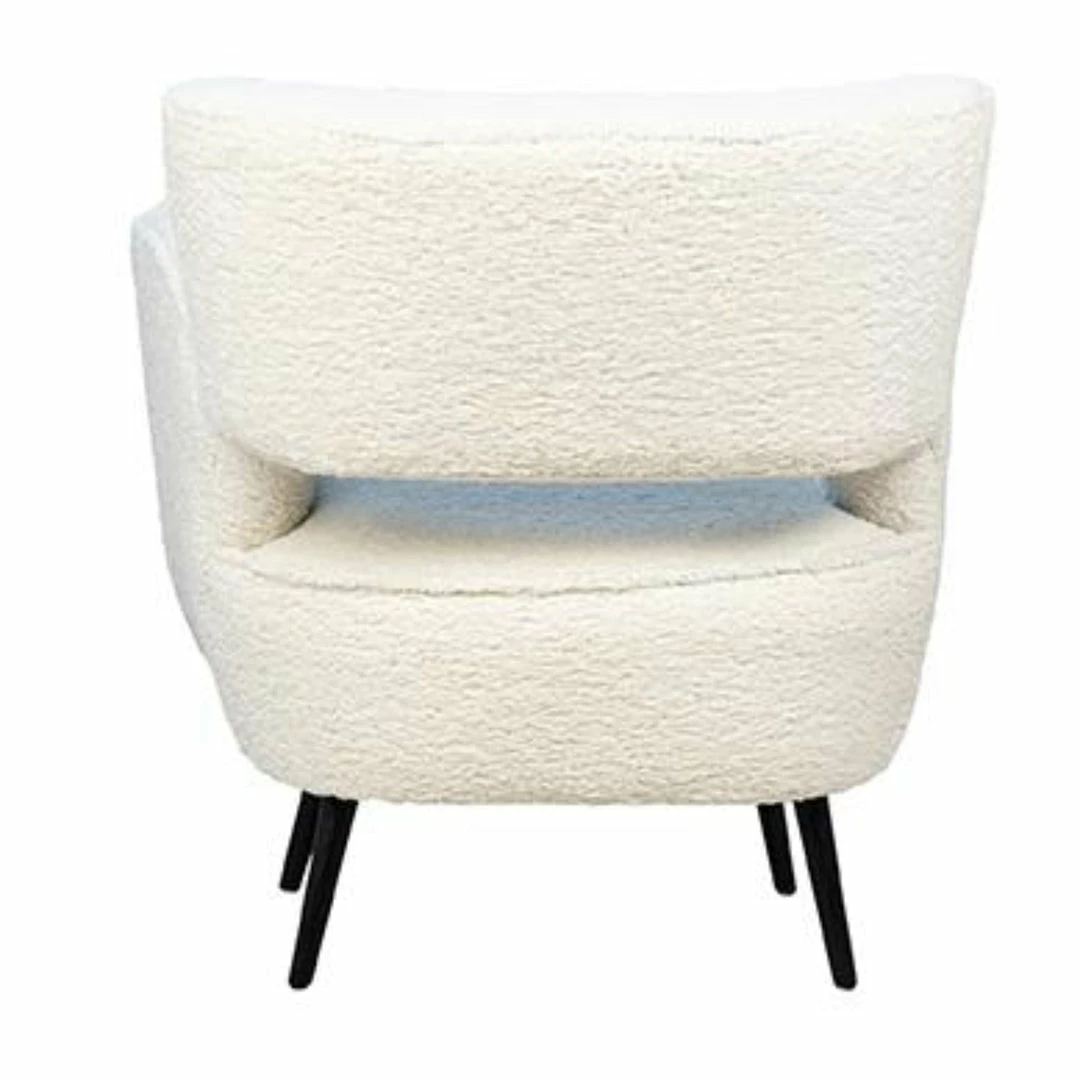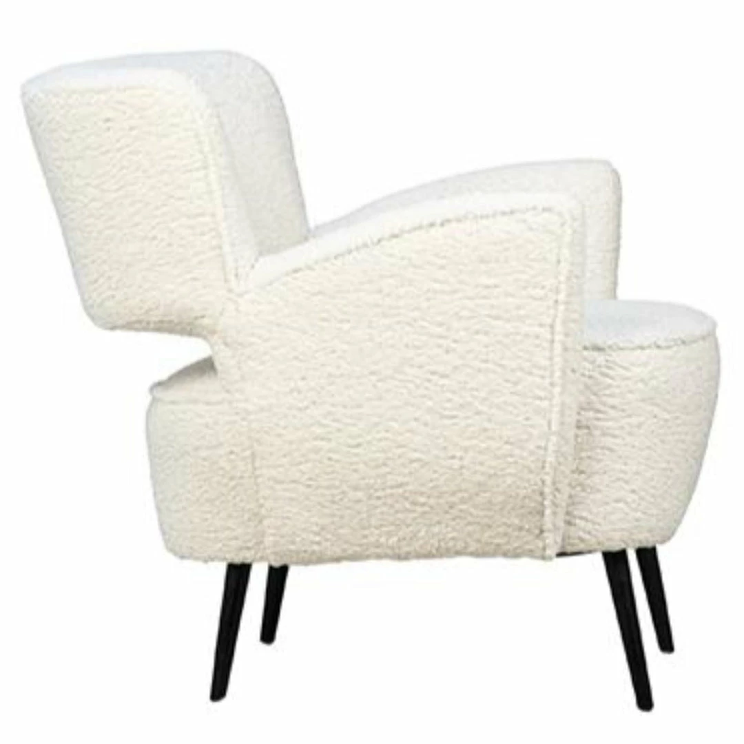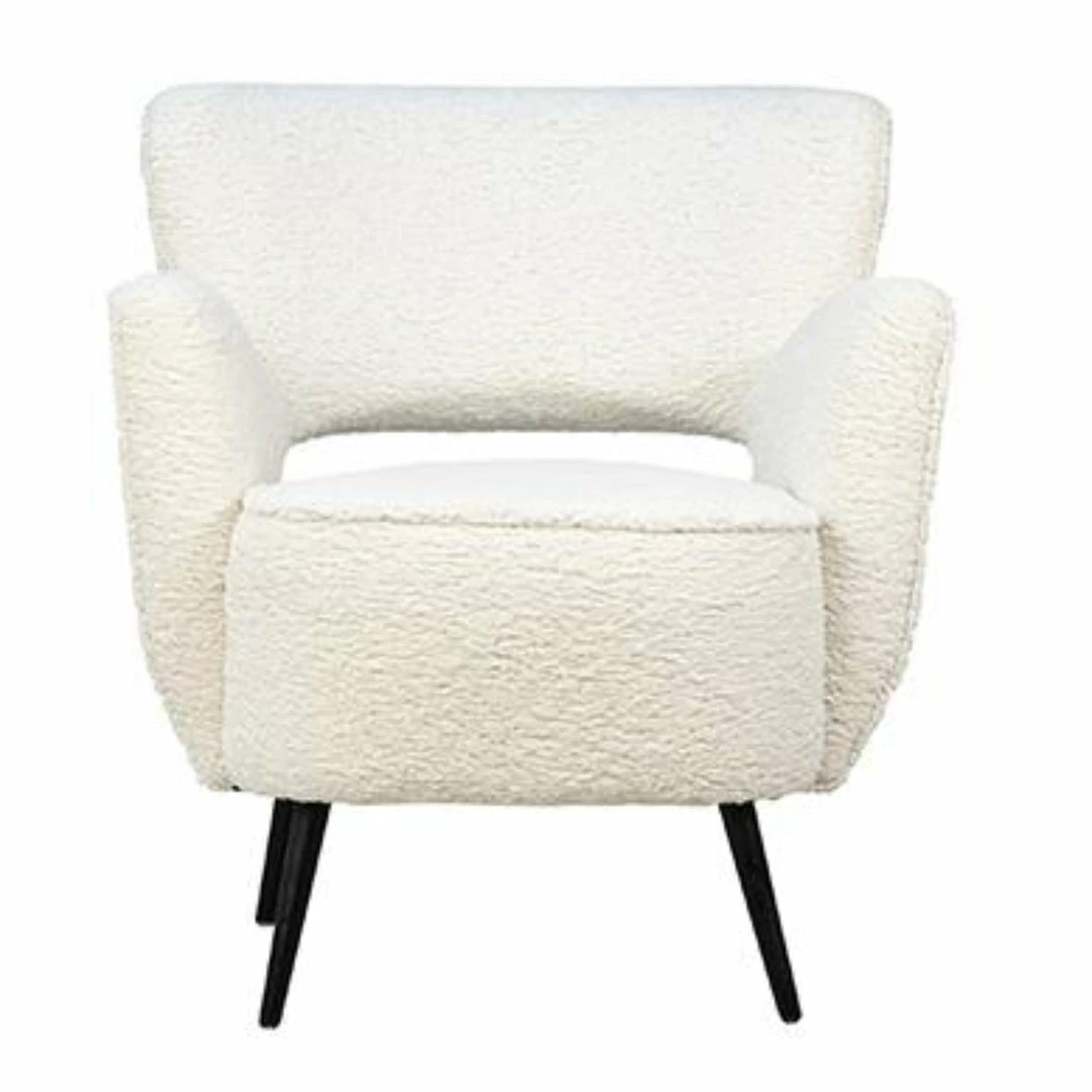 Solid wood frame with poly fabric. Off white faux sheepskin and dark iron legs.