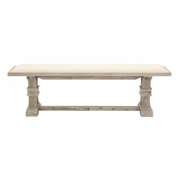Furnish your dining or living space with this transitional upholstered dining bench. Made of solid acacia wood and acacia veneer, the bench has as a natural gray finish with natural grooves and saw marks, which give it a slightly distressed look. The seat is upholstered with a beautiful stone linen material and accented with a silver nail head trim. The base also features a support beam for extra stability and durability. Versatile for many rooms, this bench can be used for seating at the dinner table, a bench for an entry way and additional seating in a living room. Pairs well with traditional, transitional, and farmhouse style dining tables and interior styles.