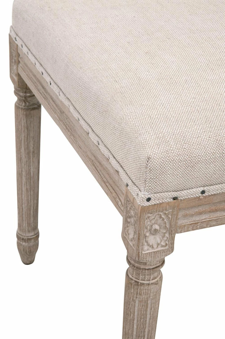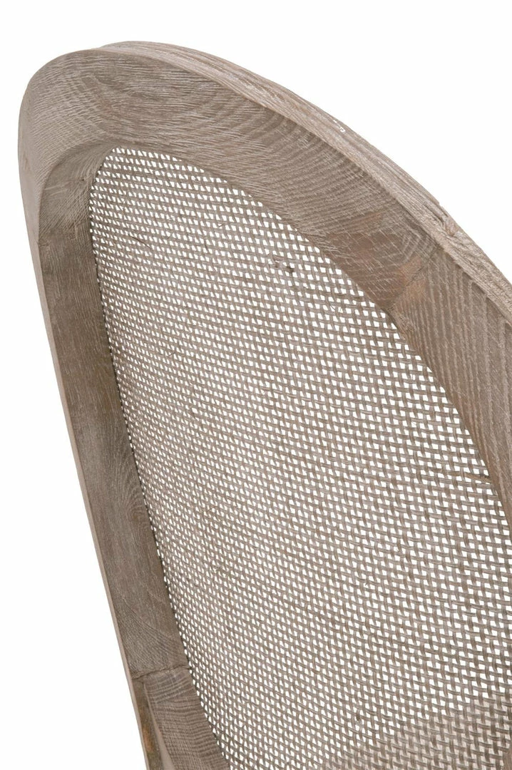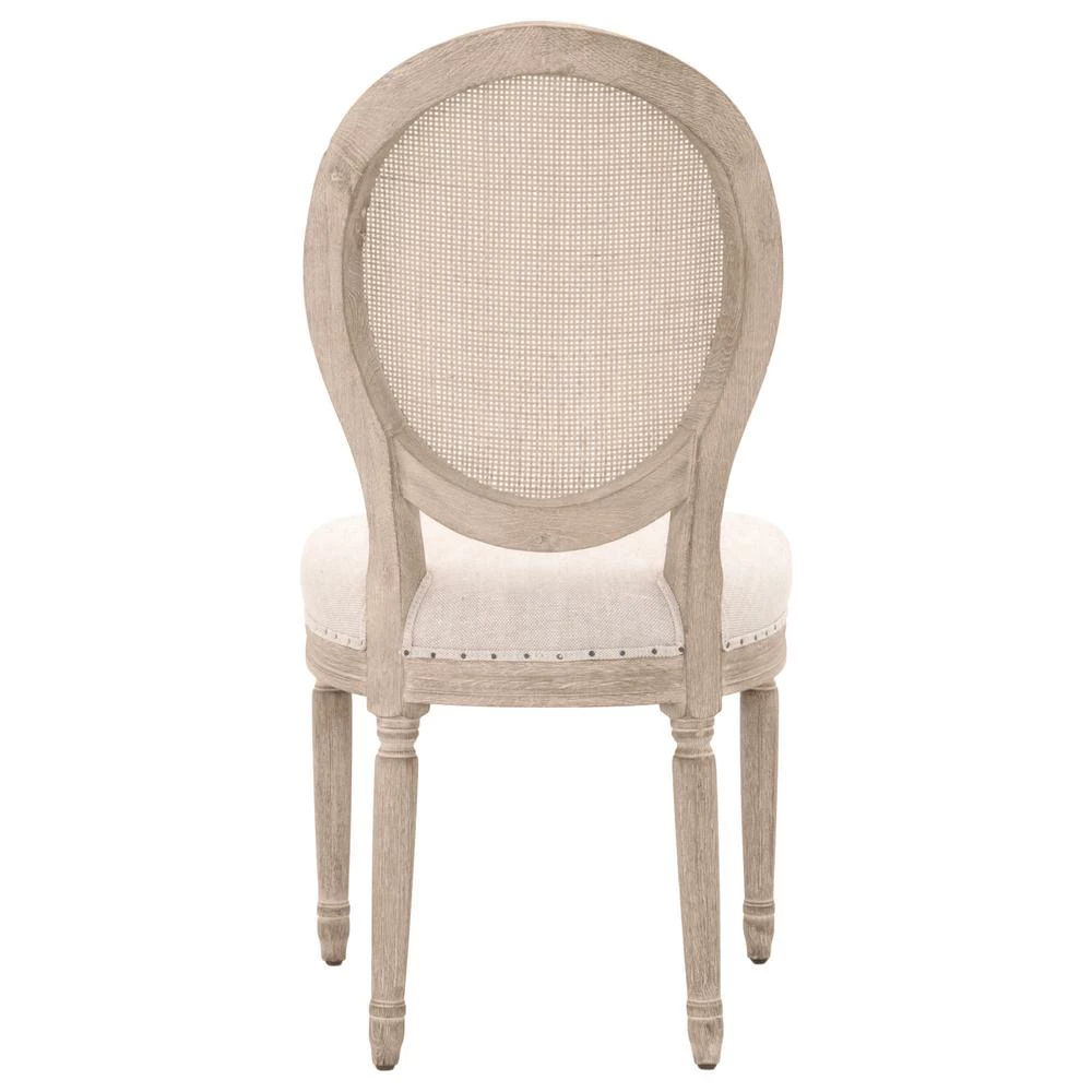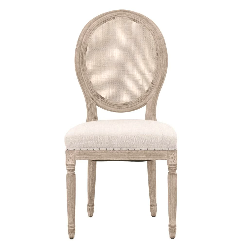 Furnish your dining room or kitchen with these gorgeous cane-backed dining chairs. The chairs are upholstered with a beautiful Bisque-colored French linen and accented with Black tack nail heads. The oval chair back is made of a thin cane material with a mesh-like appearance. The base is constructed with a solid Ash wood in a Natural Gray finish and features beautiful carvings on the rounded legs. Entertain, wine and dine guests with these transitional dining side chairs.