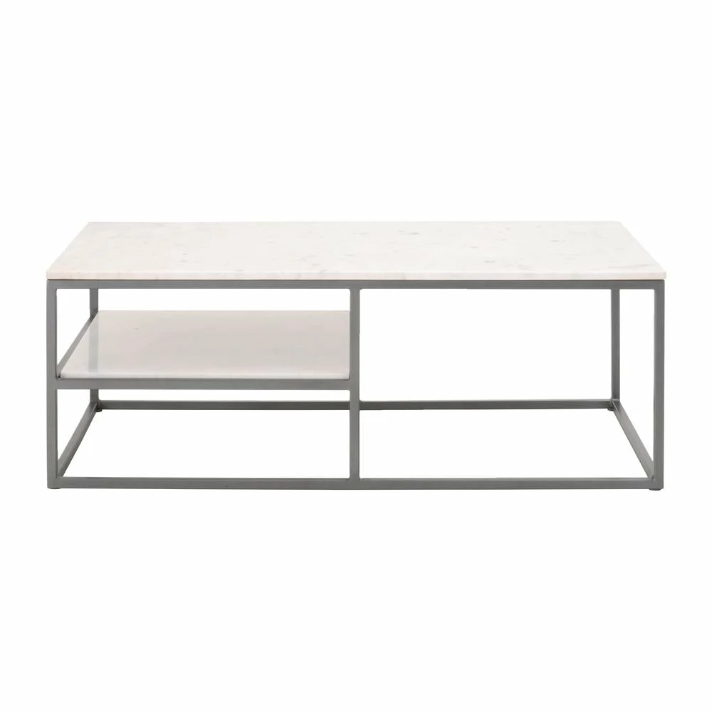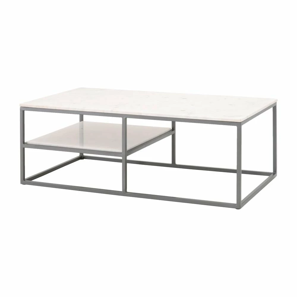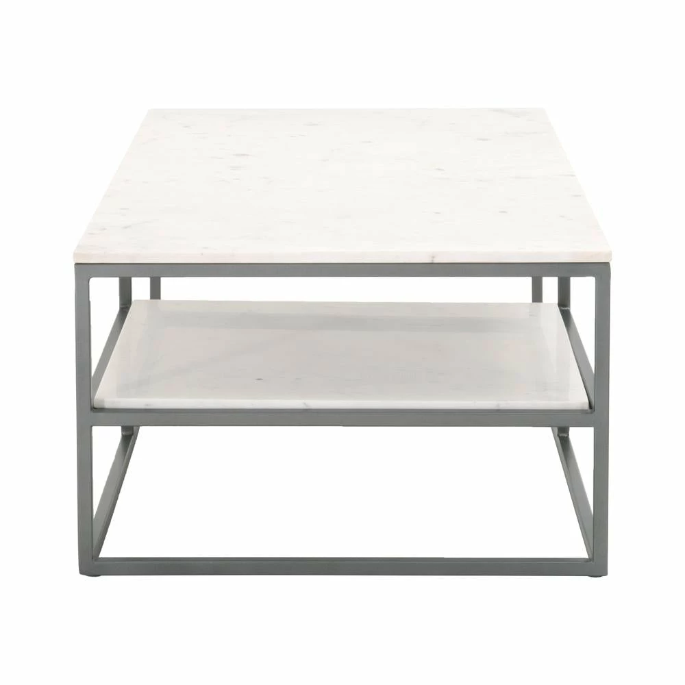 Transitional style rectangle coffee table featuring 16mm solid marble fixed top and loose inset marble shelf.