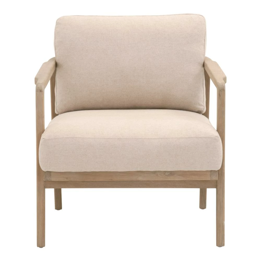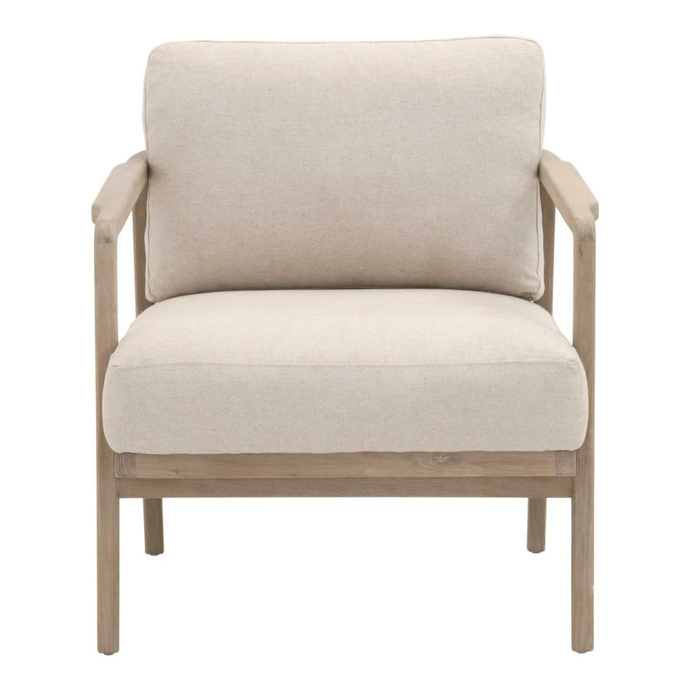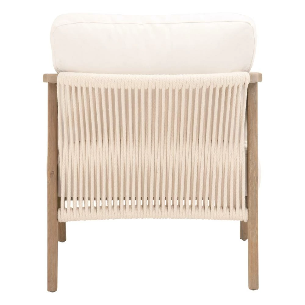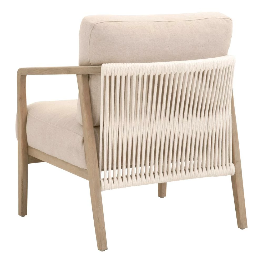 This casual and beachy club chair evokes a relaxed and inviting atmosphere in any room it furnishes. It features a nautical-inspired rope seat back made of a beautiful white rope woven in an intricate design. The back cushion is removable and reversible, while the seat cushion is fixed to the frame. The gorgeous soft beige linen cushions pair nicely with the smoke gray tones of the reclaimed oak wood frame. The back frame and arm rests are purposely carved in a curved and slanted shape, adding a subtle and unique design to the chair. The warm and calming tones of this chair make it an inviting place to sit and enjoy your time. This club chair will be the perfect accent seating in an airy room filled with light and neutral tones.