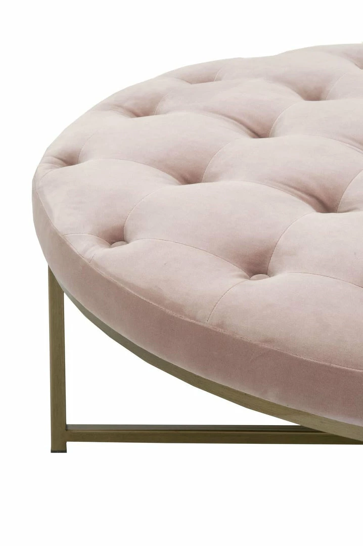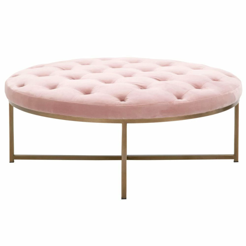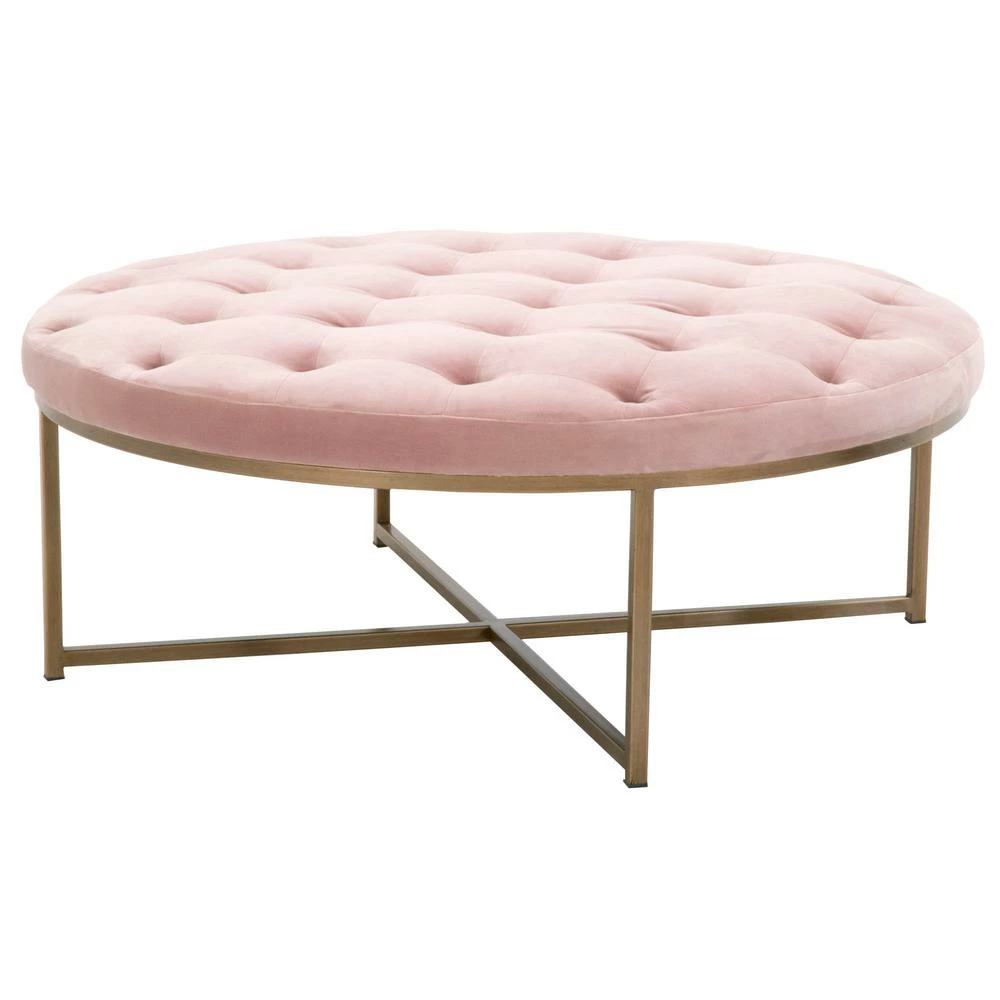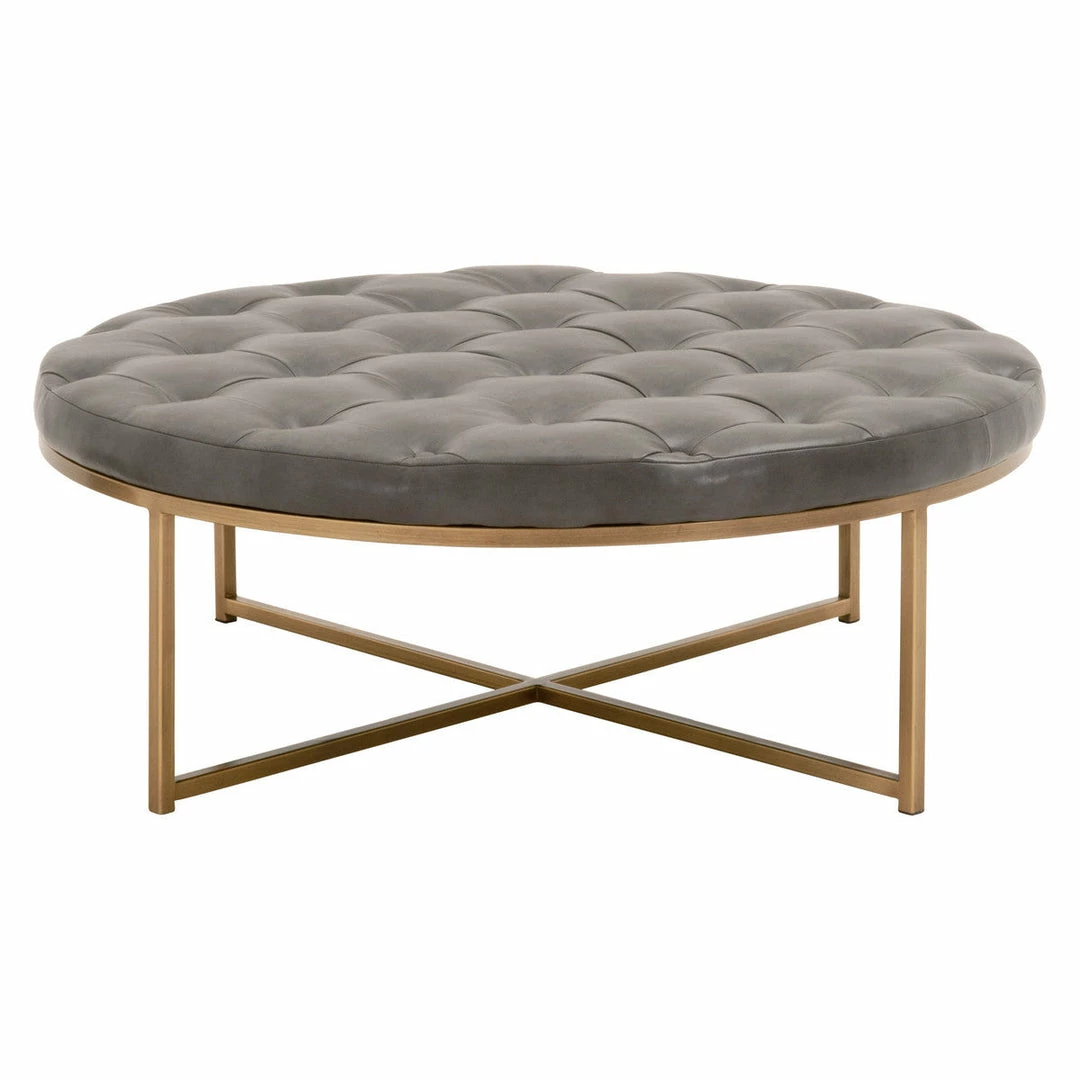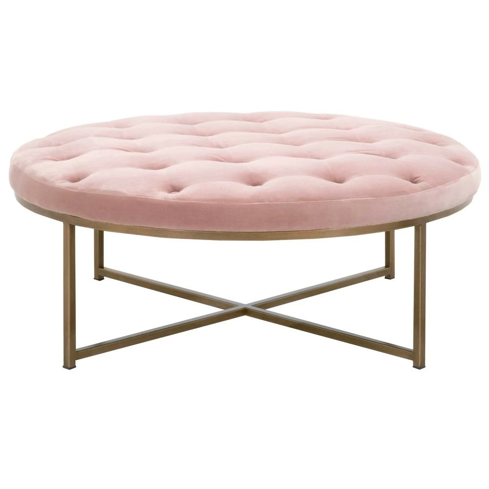 Transitional style upholstered coffee table with button-tufting detail and a metal base.