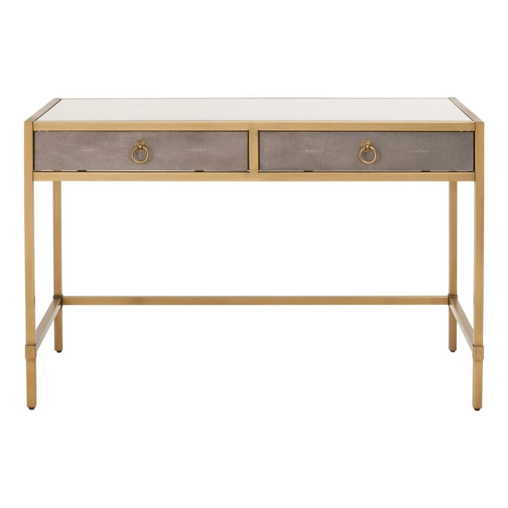 You are sure to liven up your office space with this gorgeous and one-of-a-kind writing desk. This unique desk mimics that of natural shagreen skin. Its textured finish is made of a gray faux shagreen resin that includes seams for a very natural look. The top is covered with glass for smooth writing and functionality. The base is constructed of steel with an elegant, brushed gold finish. It features two storage drawers with matching brushed gold ring pulls for ample storage space for all your office necessities.