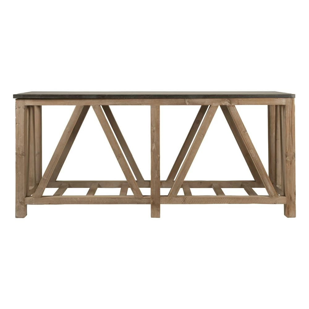 Transitional style console table featuring Reclaimed Pine wood trestle base and natural blue stone slab top.