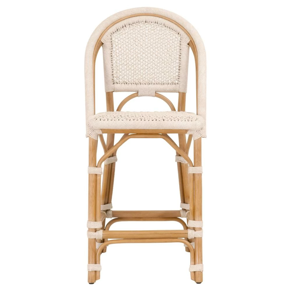 These unique counter stools are designed after European-style cafรฉ stools. However, they have a new coastal-inspired look with a rope seat back and rattan frame. The stools are also 20% larger in scale in comparison to the average cafรฉ stool. The rope is woven with a white and natural-colored threading, which appear to be an off-white or beige color from a distance. The four-way leg stretchers have rope wrapped around each corner of the leg, which adds dimension to the legs. These roomier stools with a new look will fit in nicely with any coastal, transitional or French dining or bar area.