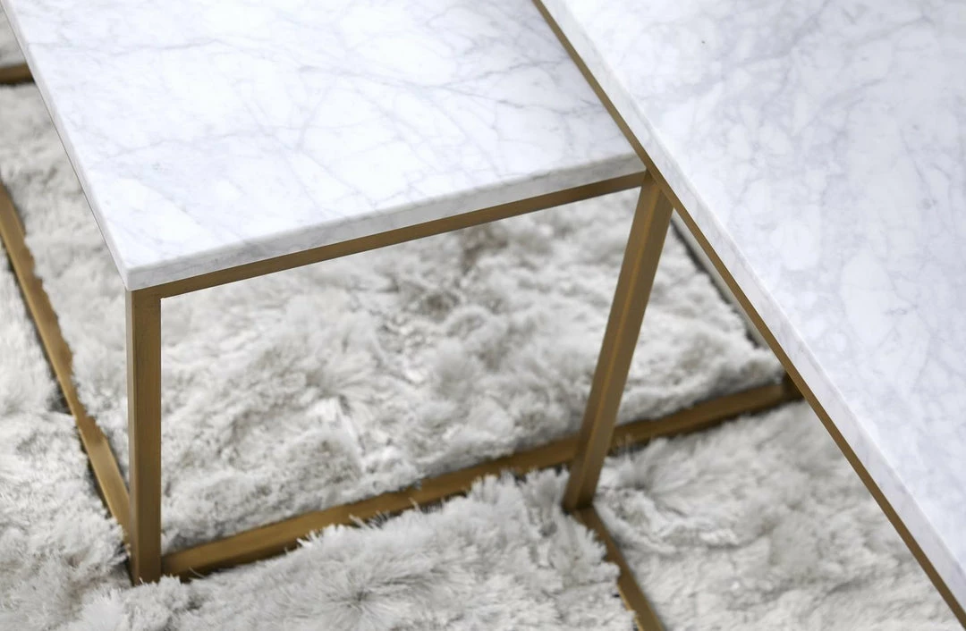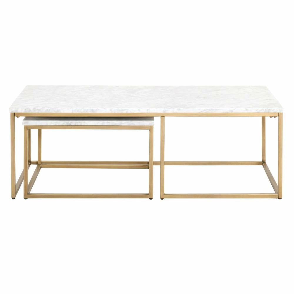 Transitional style coffee table featuring Brushed Gold base and White Marble top.