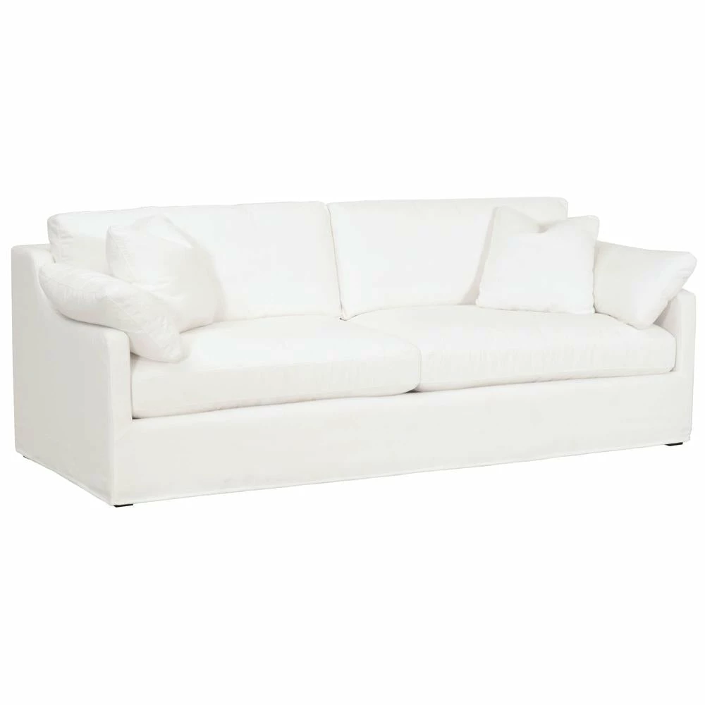 This transitional sofa is a perfect mix of casual and classy. It was thoughtfully designed and features a removable slipcover, seat covers and pillowcases, which allow for easy cleaning. The seat and back cushions are also reversible for convenient re-fluffing and flipping over. Both the seat and back cushions are filled with a down and polyester blend for ultimate comfort. The sofa also includes two square and two rectangular throw pillows with down feather filling. The luxurious linen blend upholstery is a soft and pretty light beige, which makes this sofa a perfect fit for many interior designs and color schemes. The sofa was also constructed with sloping arms and exposed wood feet. These classic features add a timeless look to this beautiful sofa.