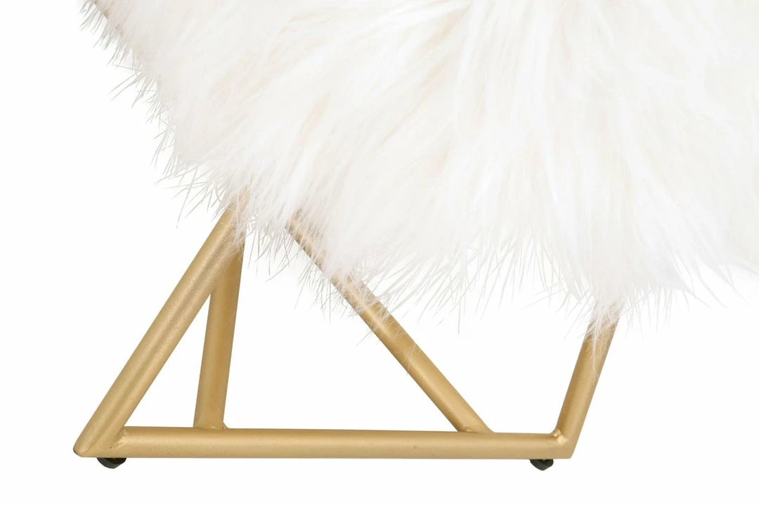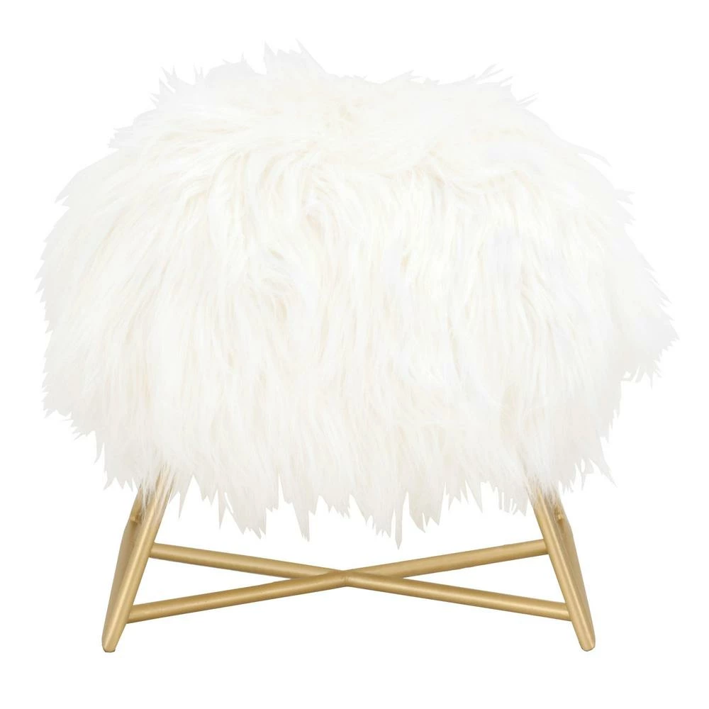 Transitional style ottoman featuring Brushed Gold finish and White Fur seat cushion.