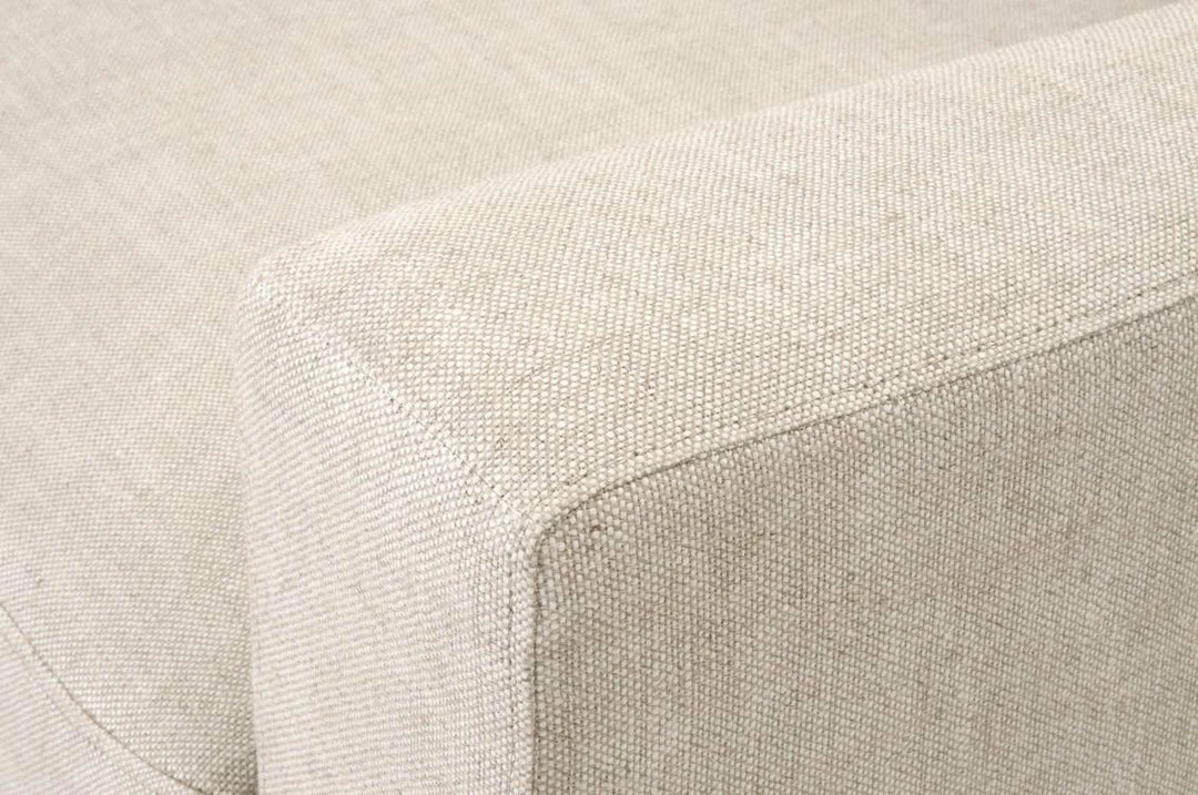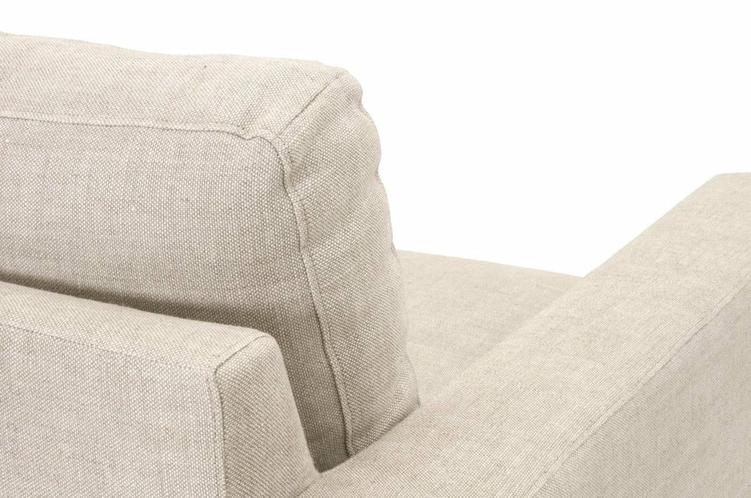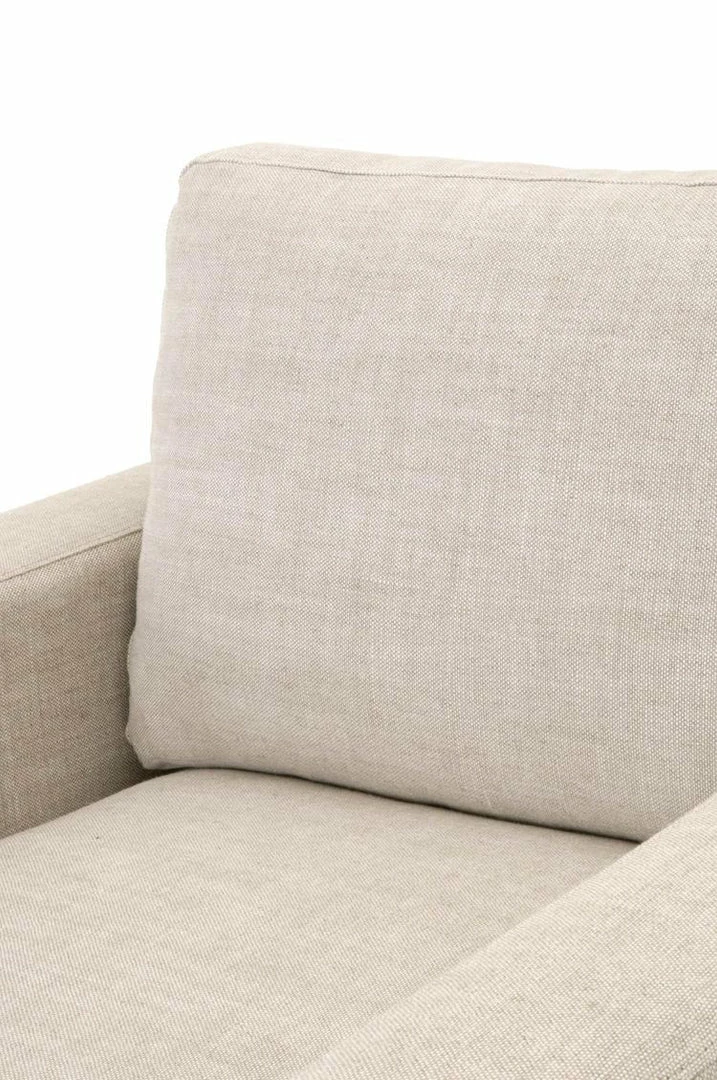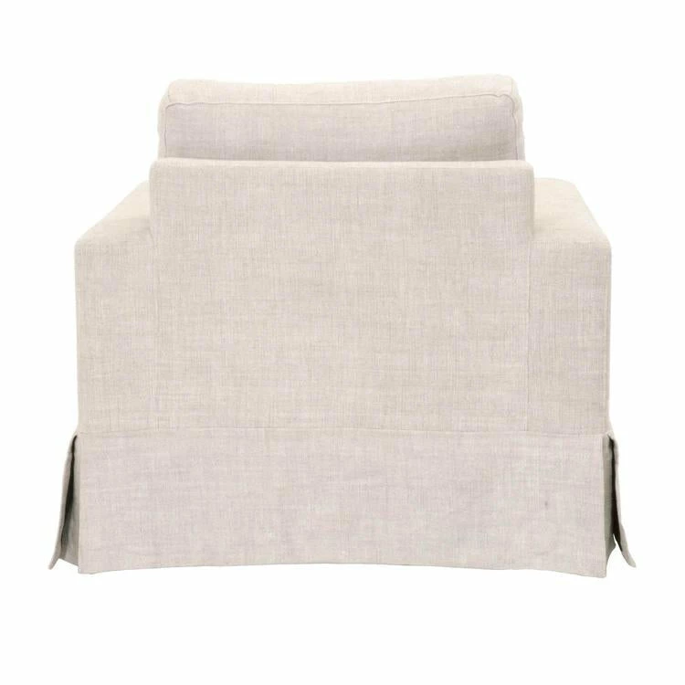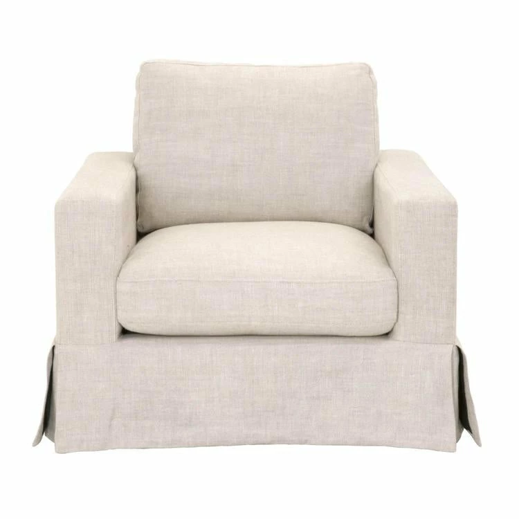 This sofa chair is a classic-looking piece that will remain a timeless staple in your living room. Its plush design makes this chair a warm and comforting place to sit. It features a thick seat cushion that is reversible and filled with high density foam and a down feather blend. The back cushion is also reversible and filled with a Dacron down blend that holds its shape and adds comfort and support. It is built with a traditional silhouette with a skirted base. The chair is also upholstered with a beautiful light beige French linen material, which exudes a very clean and airy aesthetic. Furnish your living space with this neutral and cozy sofa chair.