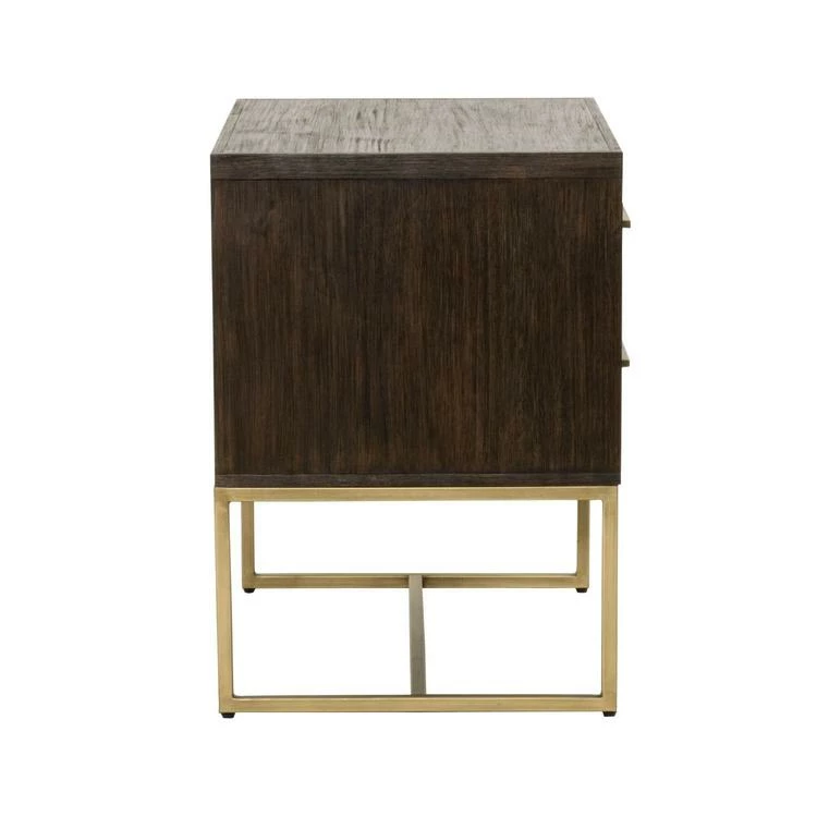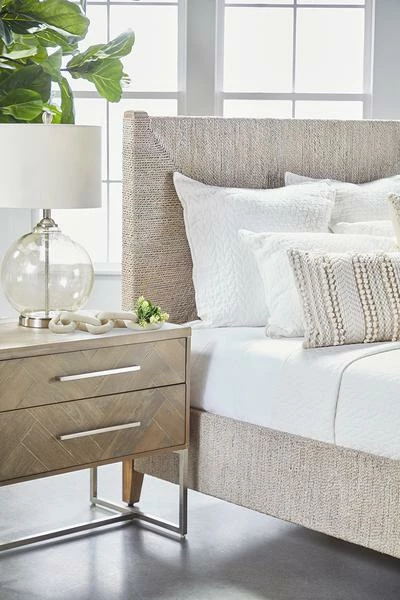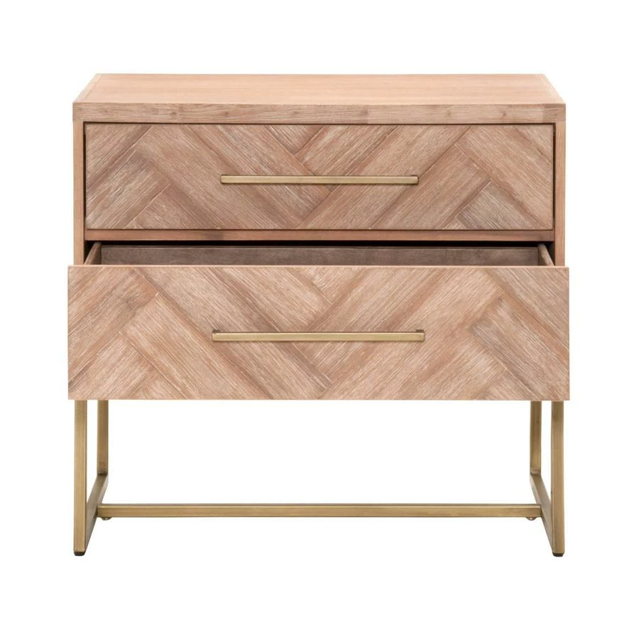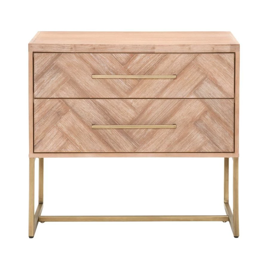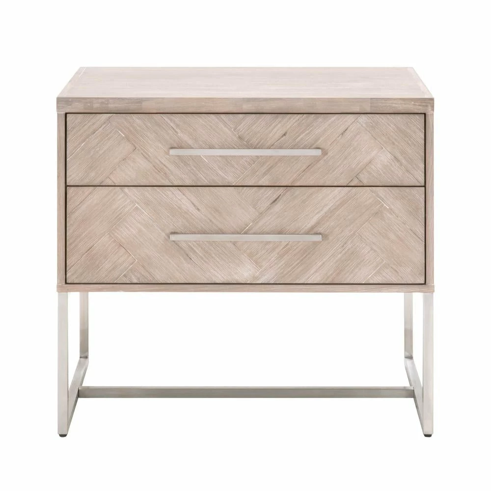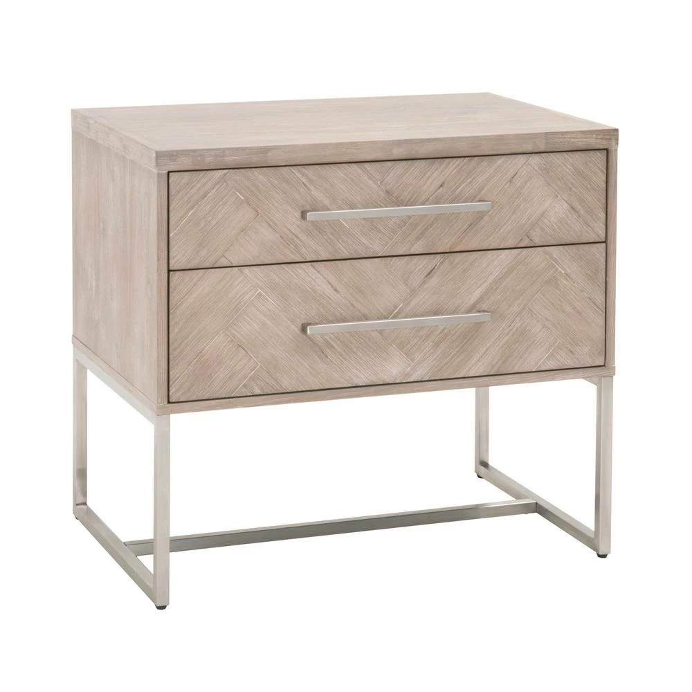 This nightstand features clean lines with a sleek brushed stainless steel base and long, slender matching handles. Its tall and wide stature provide plenty of storage space and works well with high beds. It has two large storage drawers with a beautiful herringbone design. This design is crafted with a natural gray acacia veneer parquet pattern, adding dimension to this uniquely designed stand. Complete your bedroom space with this transitional nightstand.