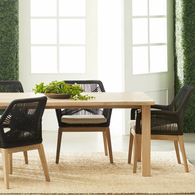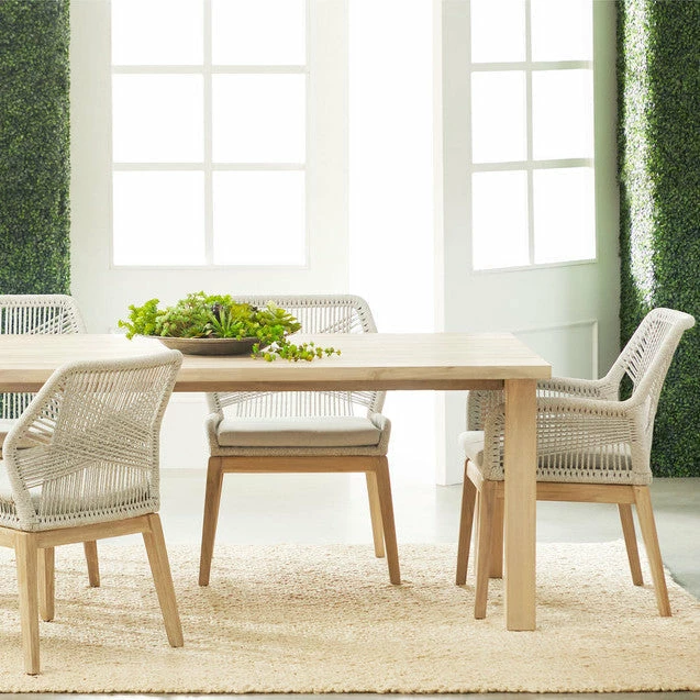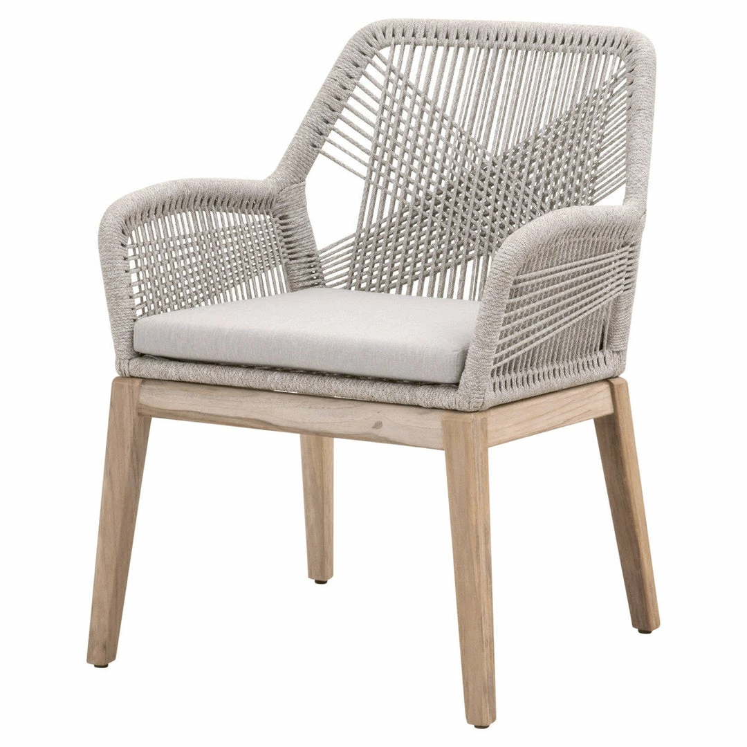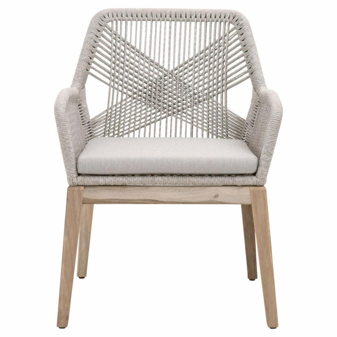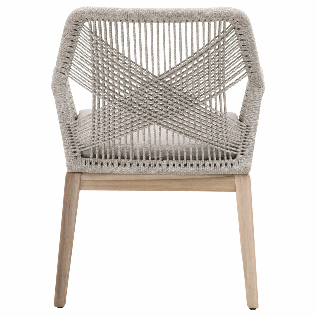 These woven outdoor side chairs will add a touch of coastal style to your backyard or patio. Constructed with a reinforced aluminum frame and solid gray teak legs, these dining chairs are not only sturdy, but durable for outdoor use. A rich platinum-colored rope is tightly woven to create a unique loom design, while the gray teak legs have a beautiful wood grain finish. Paired with a removable smoke gray all-weather seat cushion, the chairs provide comfort with style and will be the perfect addition to any outdoor space.