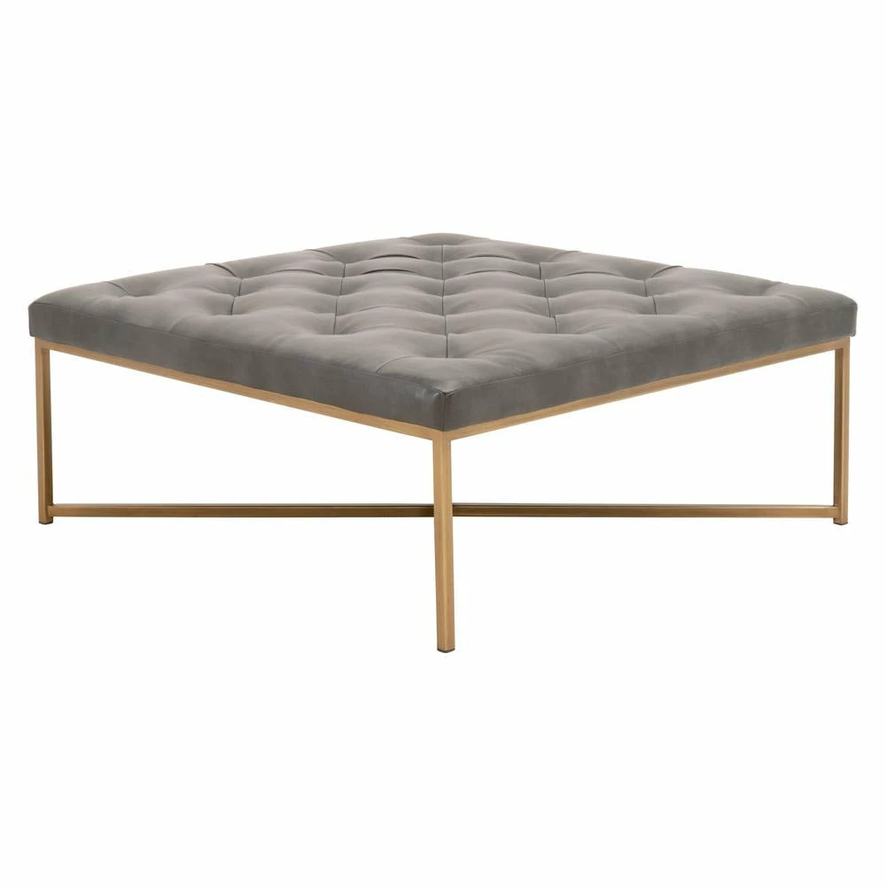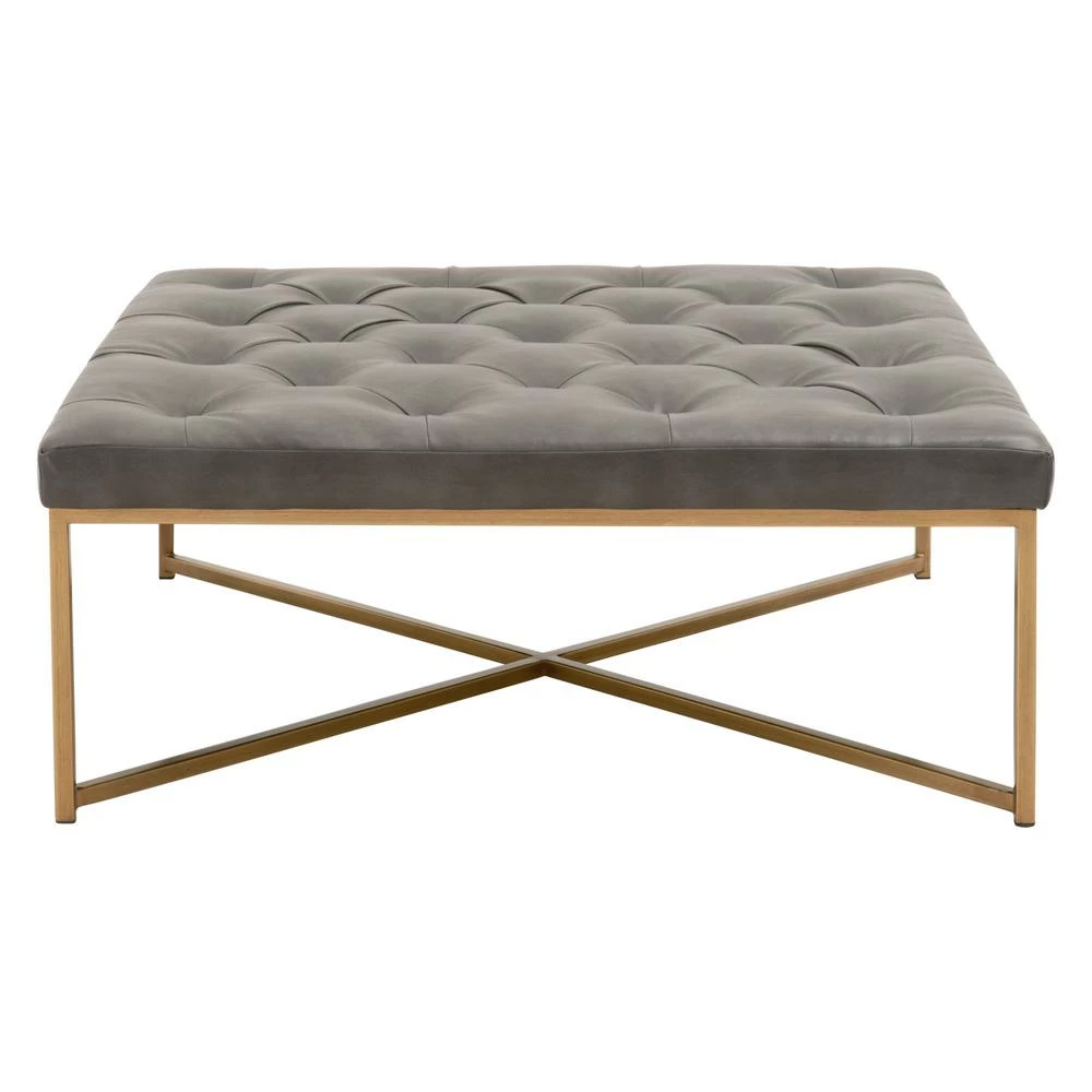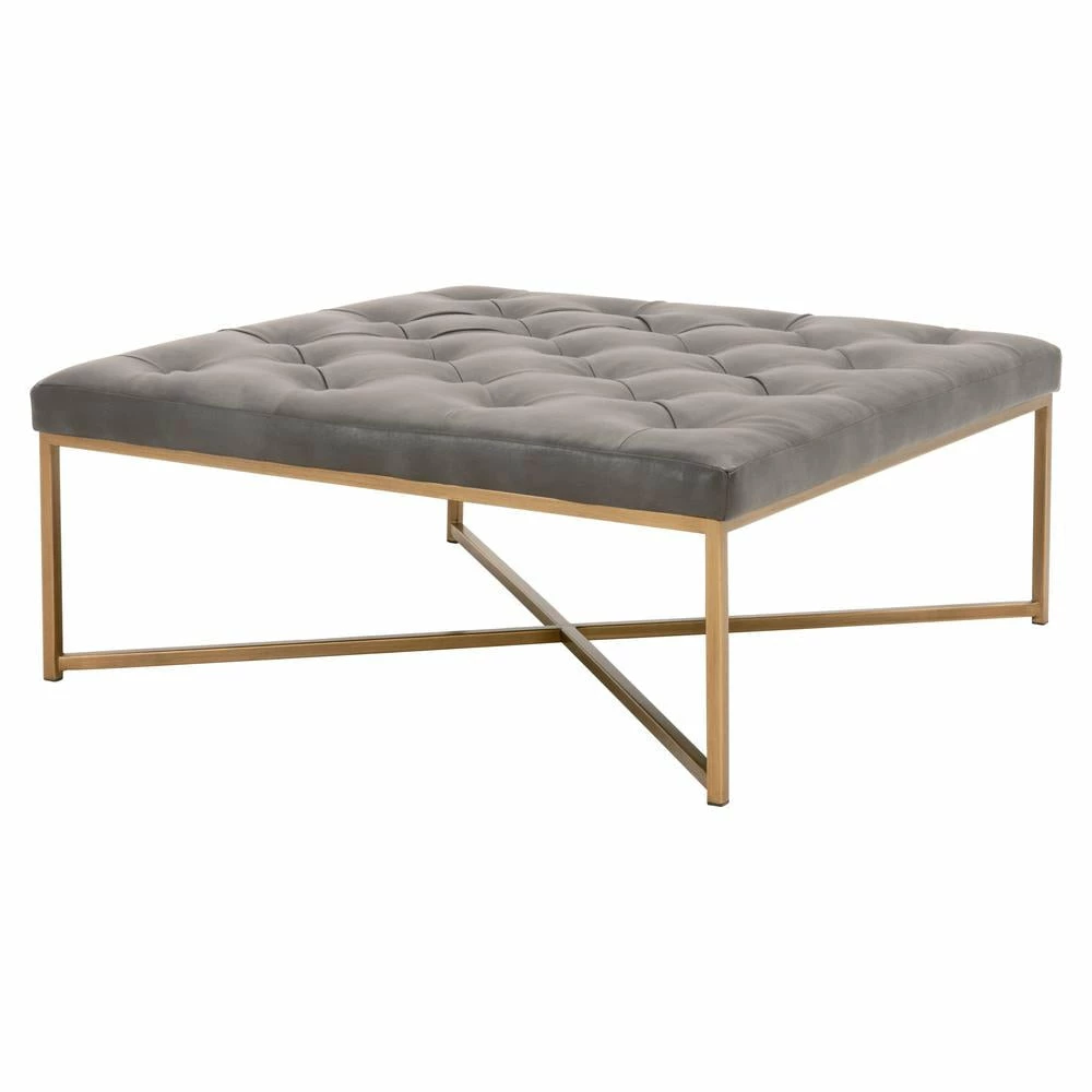 Transitional style upholstered coffee table with button-tufting detail and a metal base.