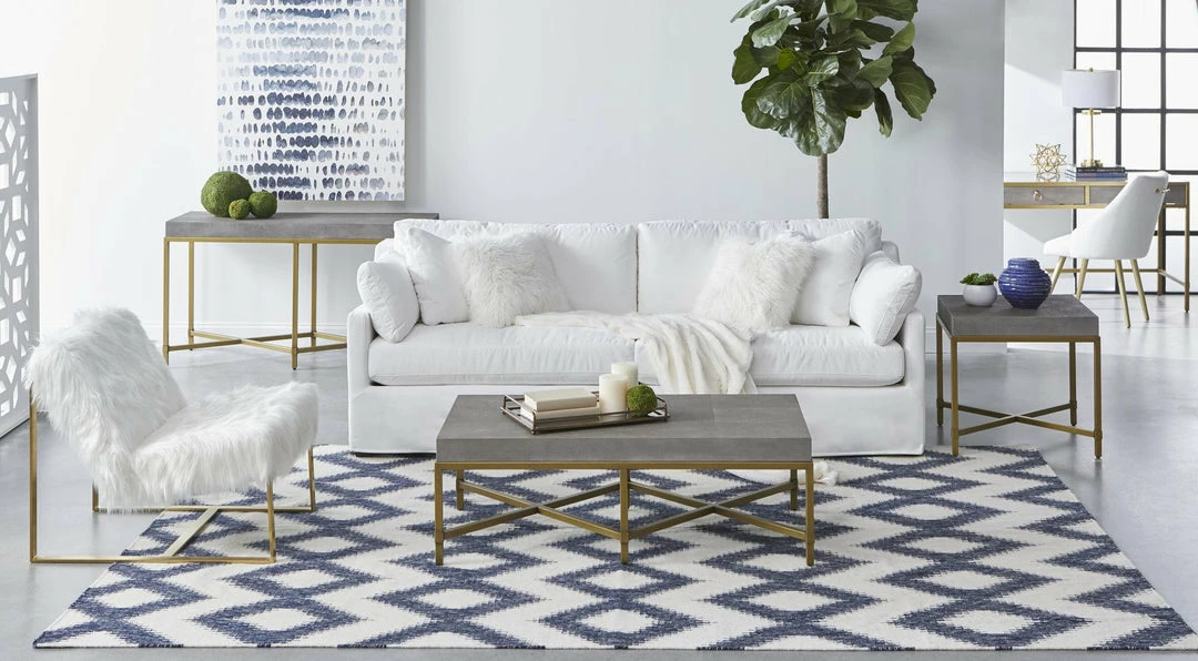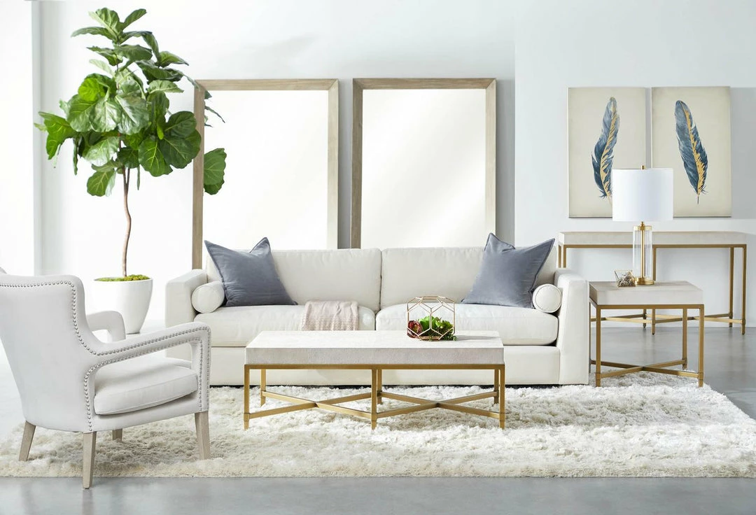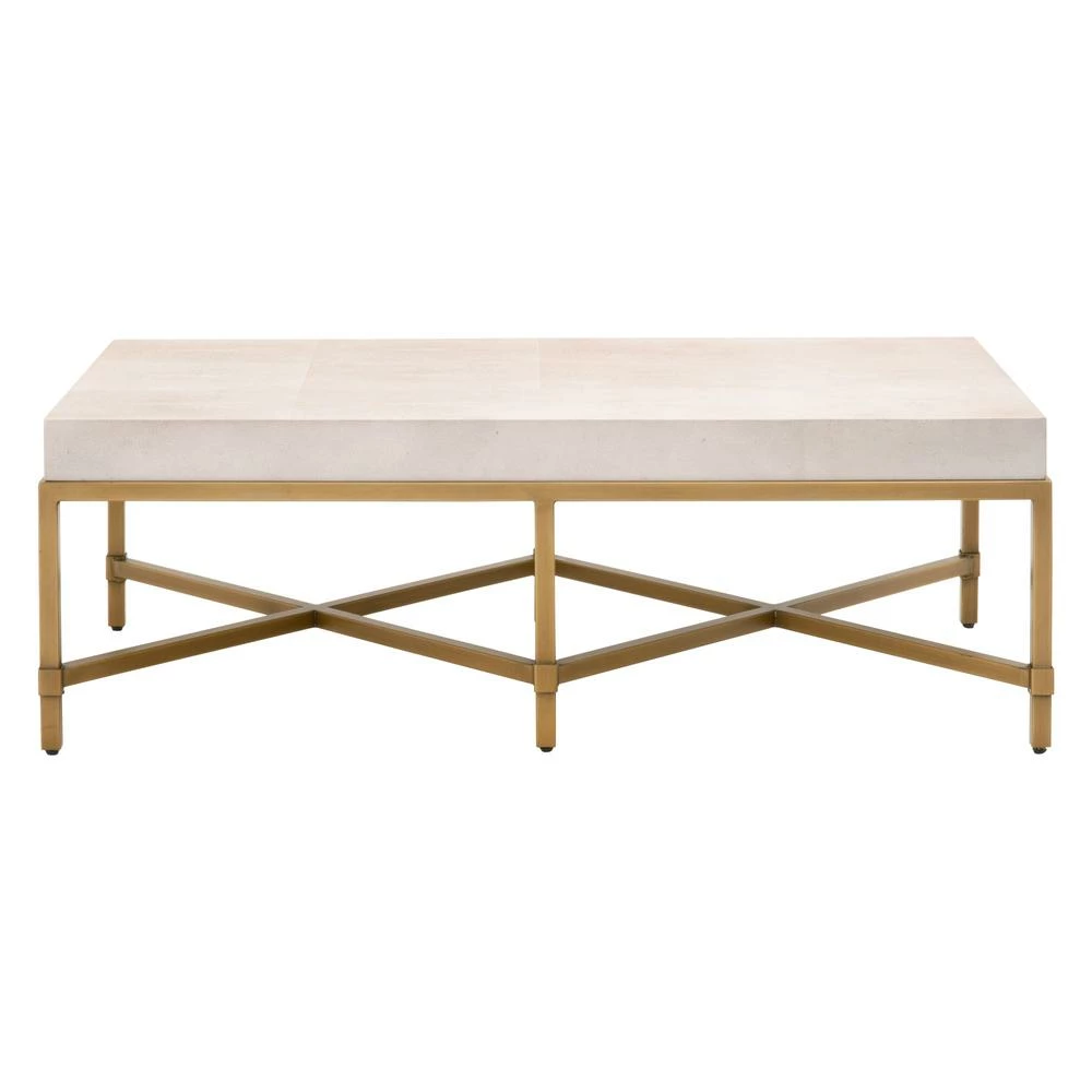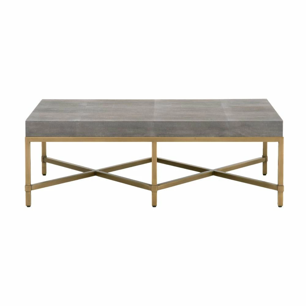You are sure to liven up your bedroom with this gorgeous and one-of-a-kind coffee table. This unique table mimics that of natural shagreen skin. Its textured top is made of a gray faux shagreen resin that includes seams for a very natural look. The base is constructed of steel shaped in a “X” design with an elegant, brushed gold finish. The “X” design adds modern appeal to the transitional-style coffee table.