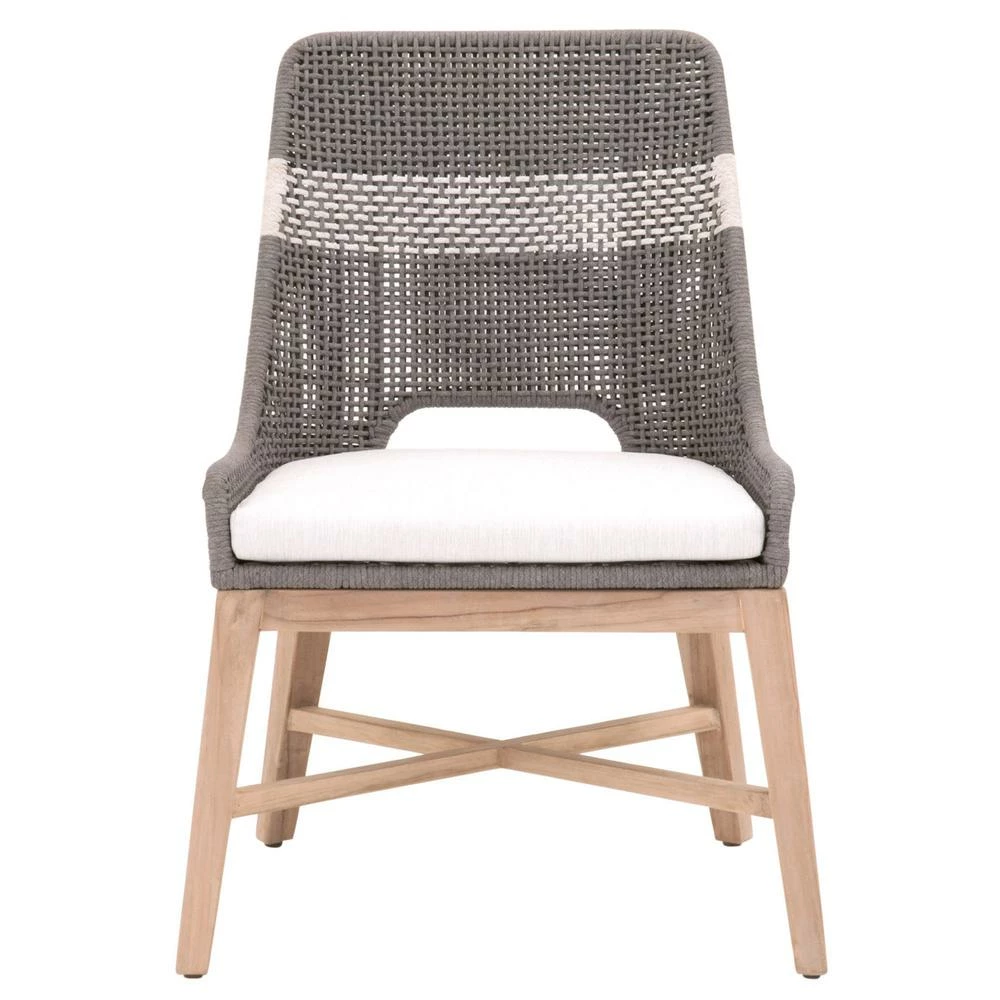These woven outdoor dining chairs will add a touch of coastal style to your backyard or patio. Constructed with a stainless steel frame and solid gray teak legs, these side chairs are not only sturdy, but durable for outdoor use. A rich dove colored rope is tightly woven with an eye-catching solid white speckle stripe interwoven at the center of the seat back. The gray teak legs feature crossed leg stretchers and a beautiful wood grain finish. Paired with a removable all-weather seat cushion, the chairs provide comfort with style and will be the perfect addition to any outdoor space.