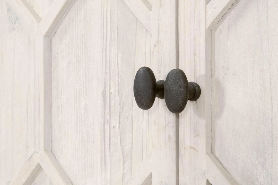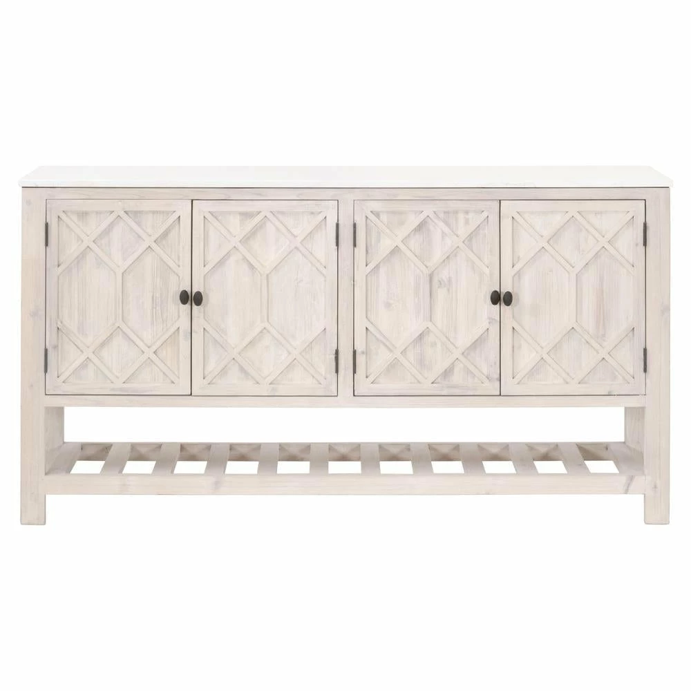 This exquisite quartz-topped media sideboard can also function as a dining sideboard or entryway cabinet. It is constructed with a solid quartz top designed to resemble white and gray marble and a solid wood base with a white-wash finish. It features two large storage cabinets with a diamond design on the doors. Each cabinet has a single shelf and a cord management hole, allowing ample storage space and a convenient way to hide unsightly wires and devices. The trestle base ties in a touch of farmhouse style as well. This would make a beautiful addition to any living room, bedroom or foyer.