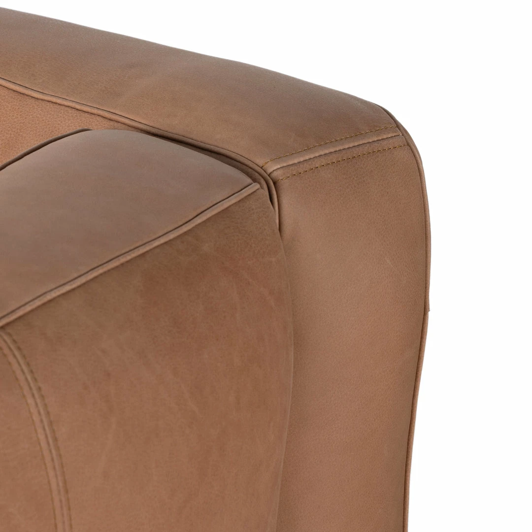 Modern transitional gone sophisticated. Camel top-grain leather covers a sleek silhouette with chunky proportions. Black-finished iron legs look light and slim for a dramatic play on scale. Sourced from one of the oldest family-owned tanneries in Italy’s Bassano del Grappa, our heirloom leather is salvaged and processed from upcycled hides featuring an abundance of natural markings, scars and color variations. The result? Supple, buttery-soft hides with an unmatched depth of color and authentic lived-in look.