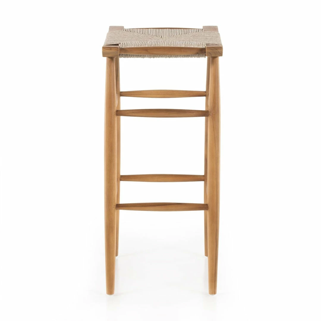 An outdoor stool that’s beautiful enough to bring indoors. French primitive inspired with tapered legs and stacked stretchers reminiscent of Shaker-crafted pieces. Crafted of solid teak with all-weather wicker seating. Cover or store indoors during inclement weather and when not in use.