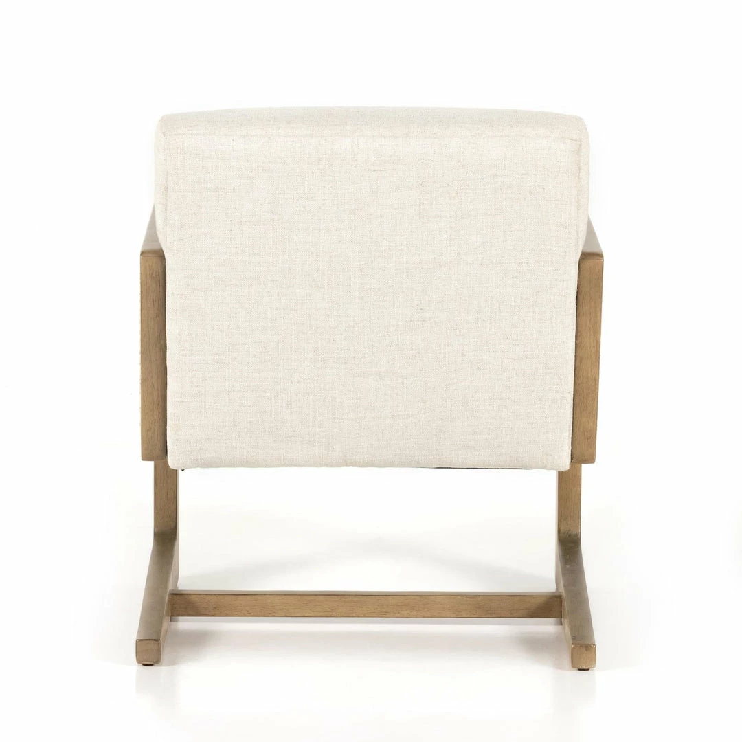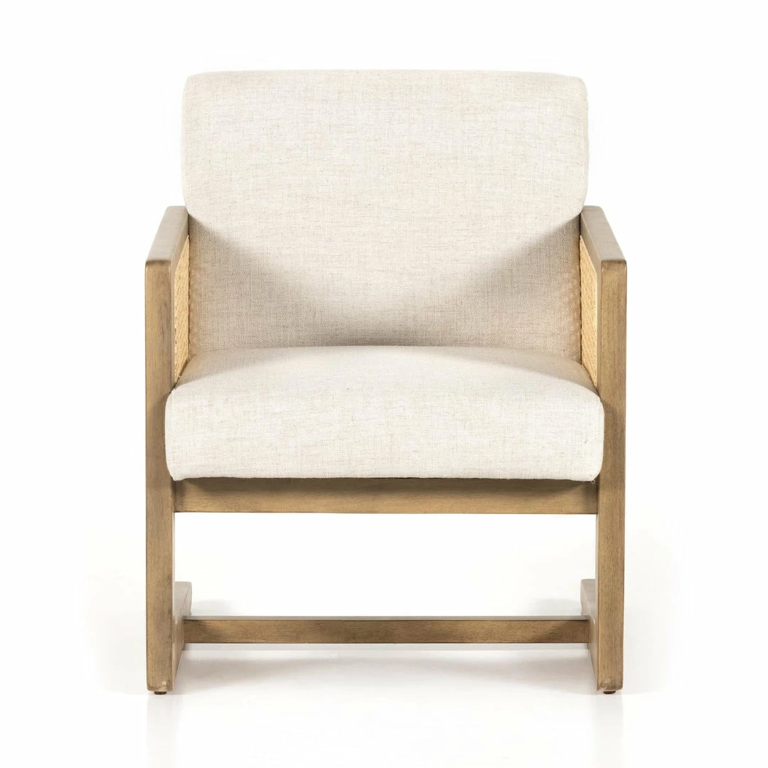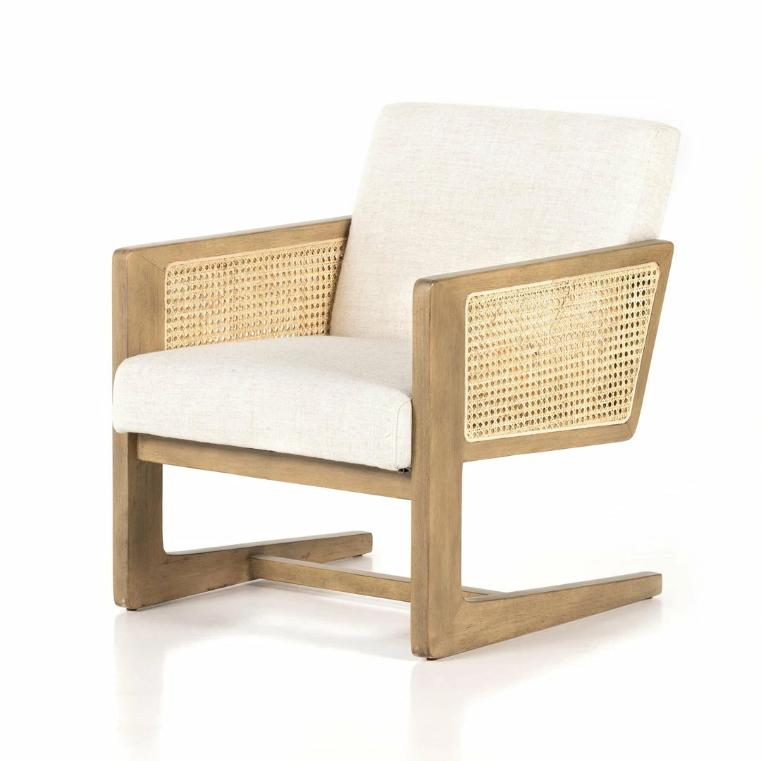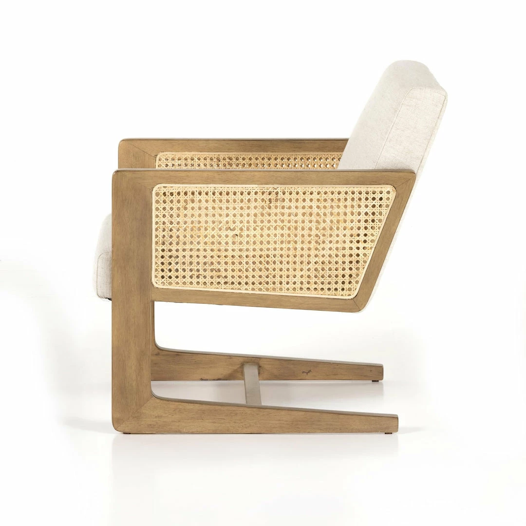 Strike a pose. Solid parawood forms a cantilever-shaped frame for linen-like high-performance fabric seating in a versatile cream. Cane arm panels add a trendy, textural touch.