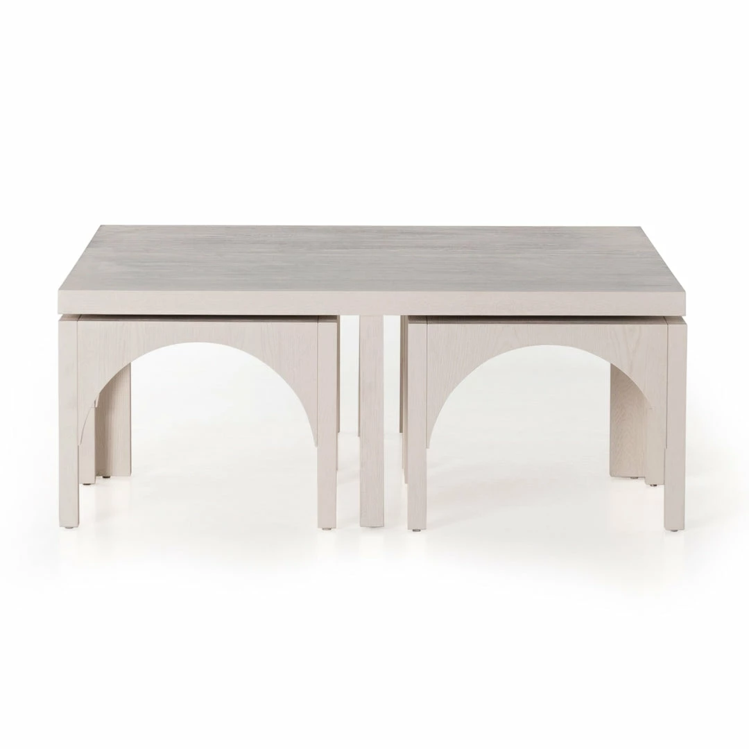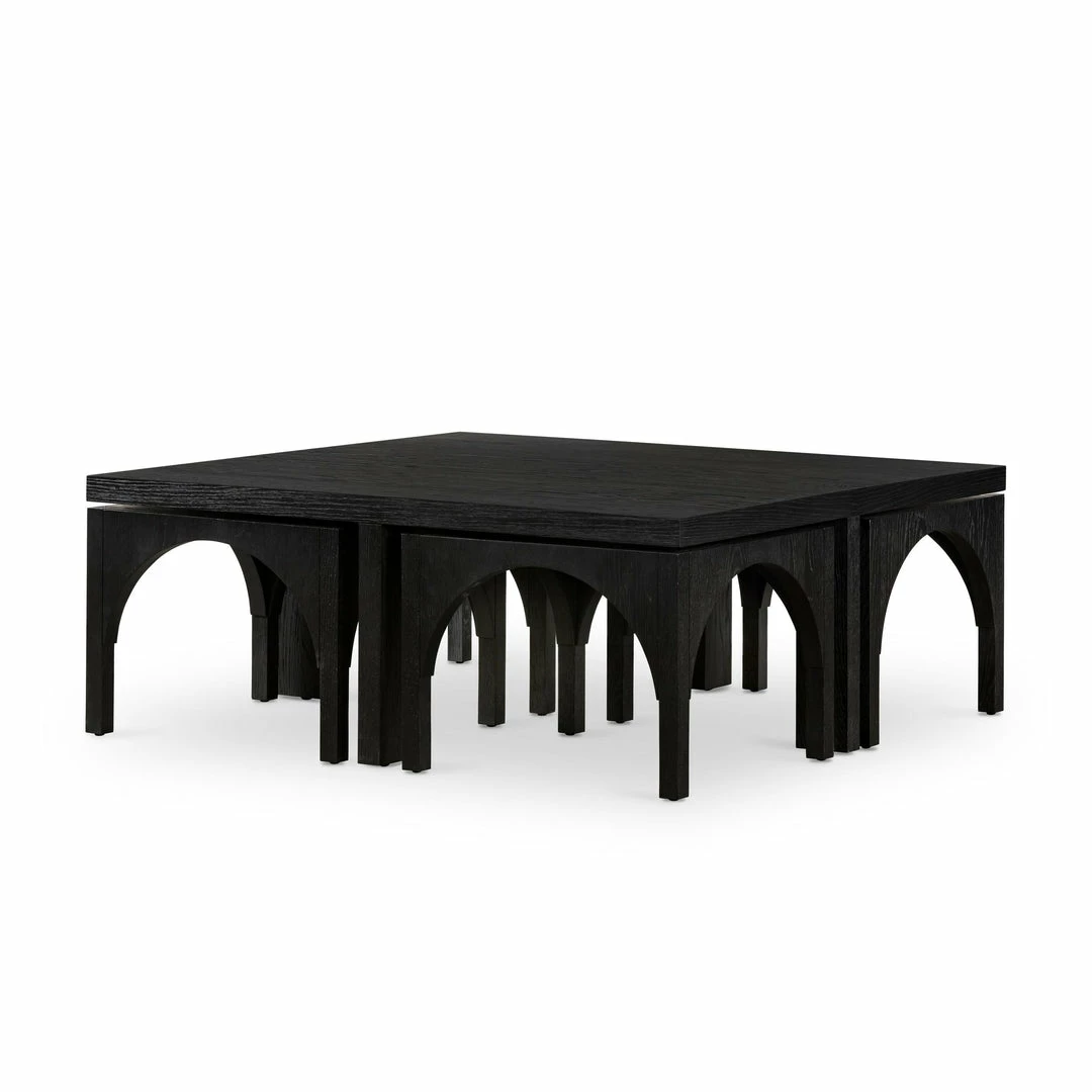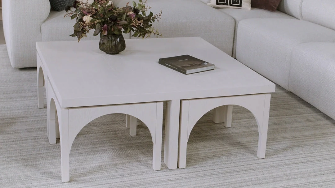 Meet a forward-thinking oak coffee table as stylish as it is functional. With beautifully arched sides, four separate nesting tables cleverly slide out to create ample extra surfaces as needed, tucking back under with ease.