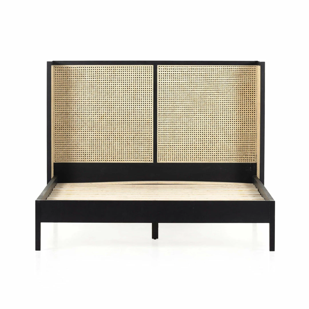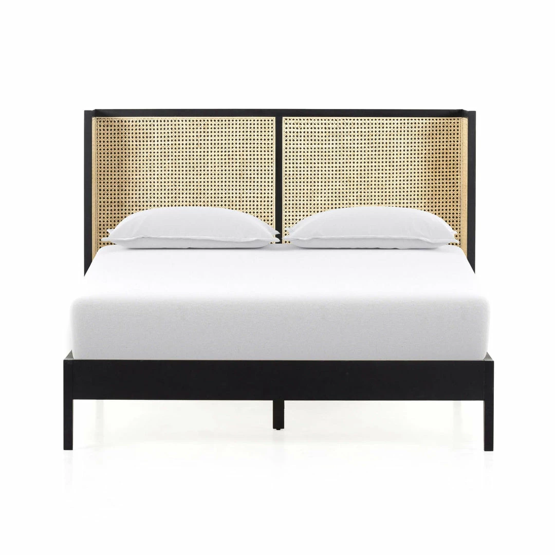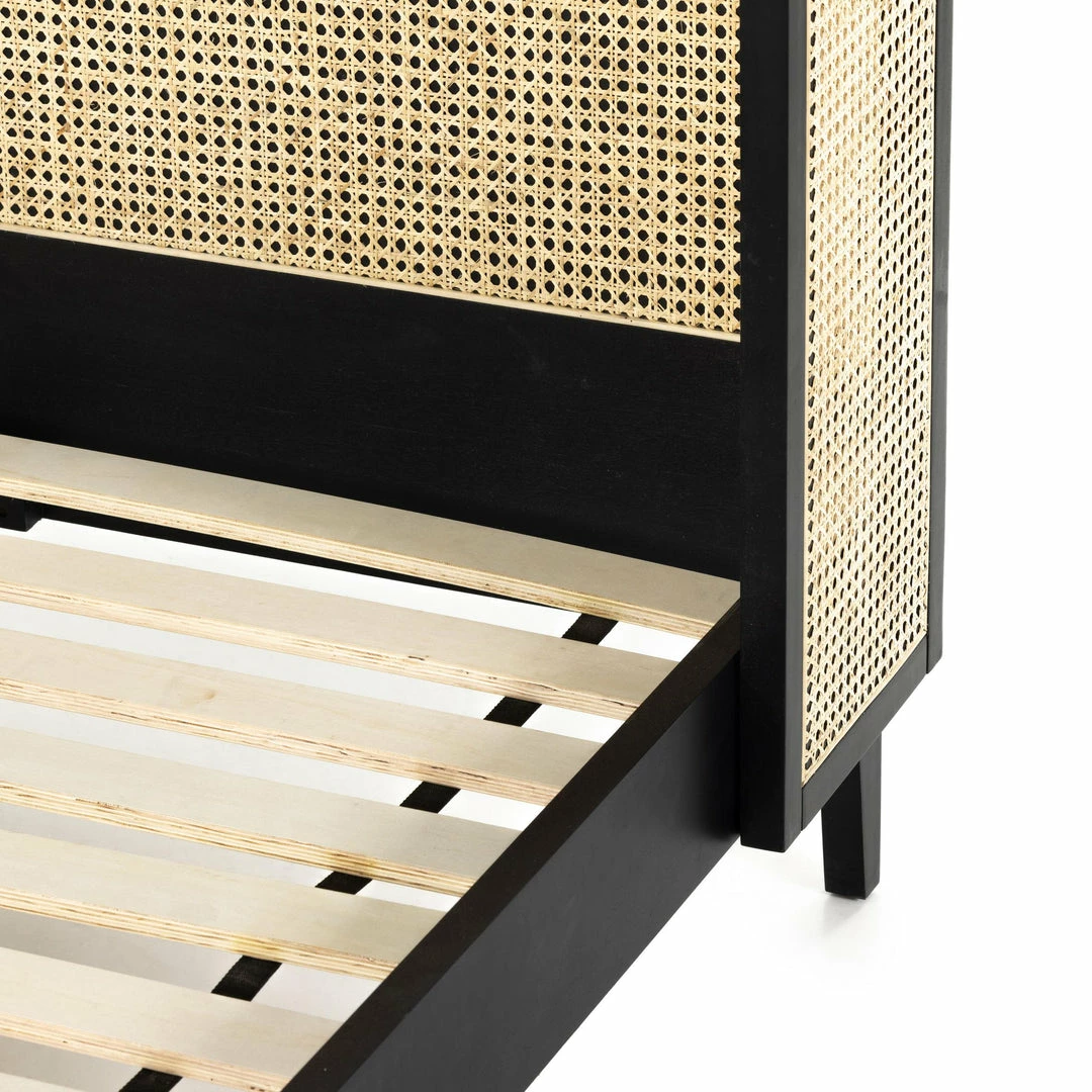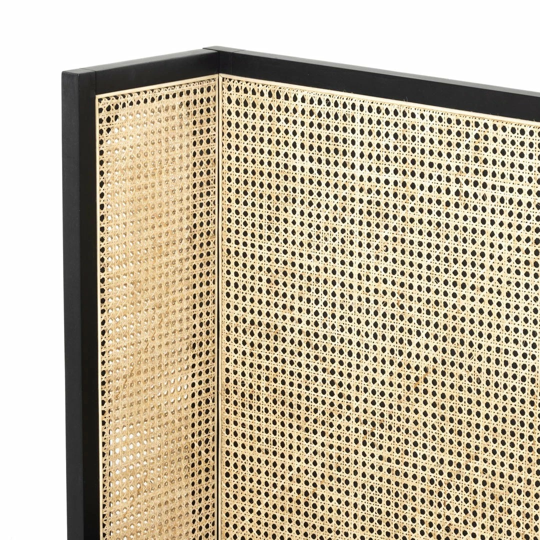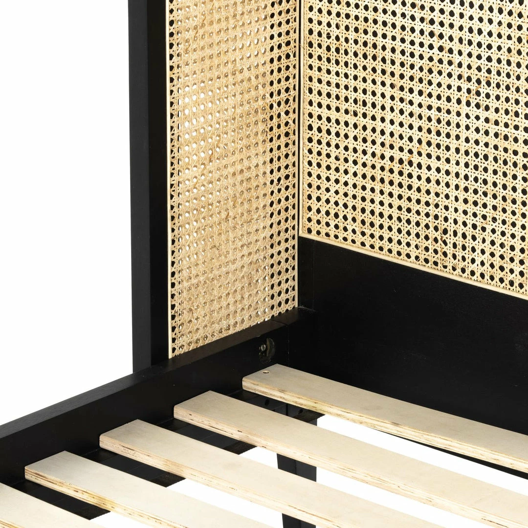 Mixed materials refresh retro styling. A curved headboard of ebony-brushed rubberwood frames a textural inlay of natural cane, for a light, monochromatic look.
