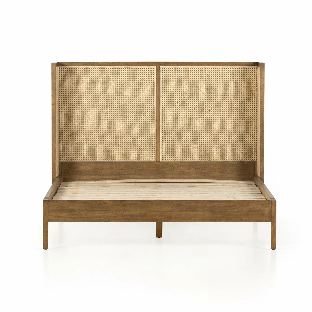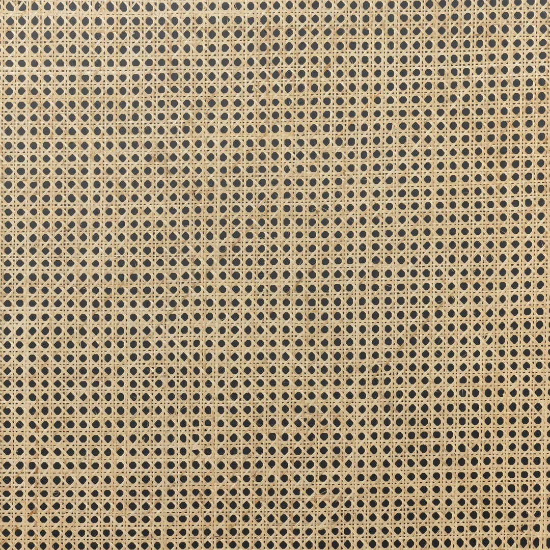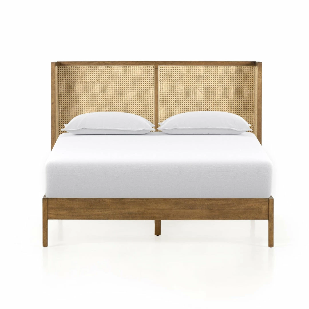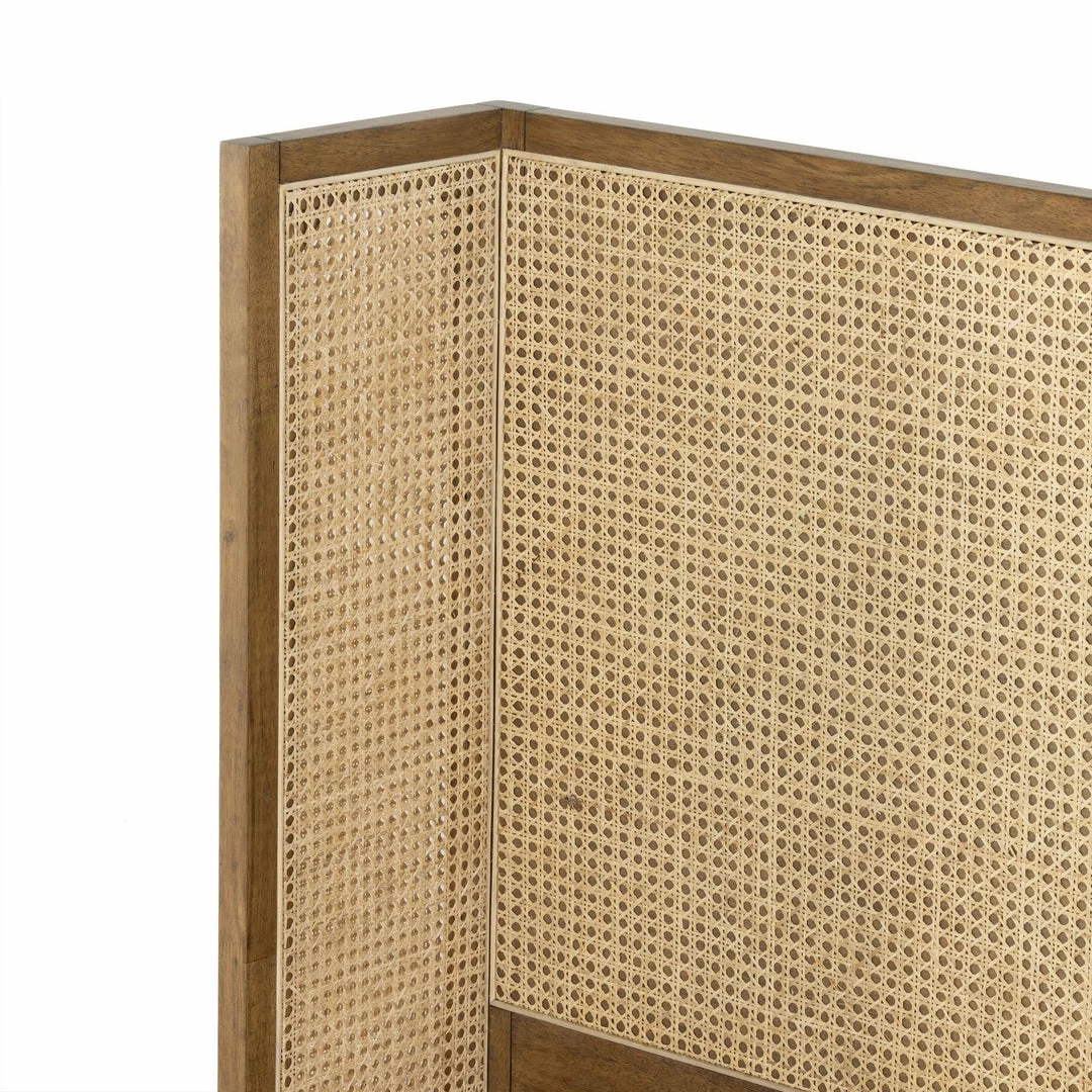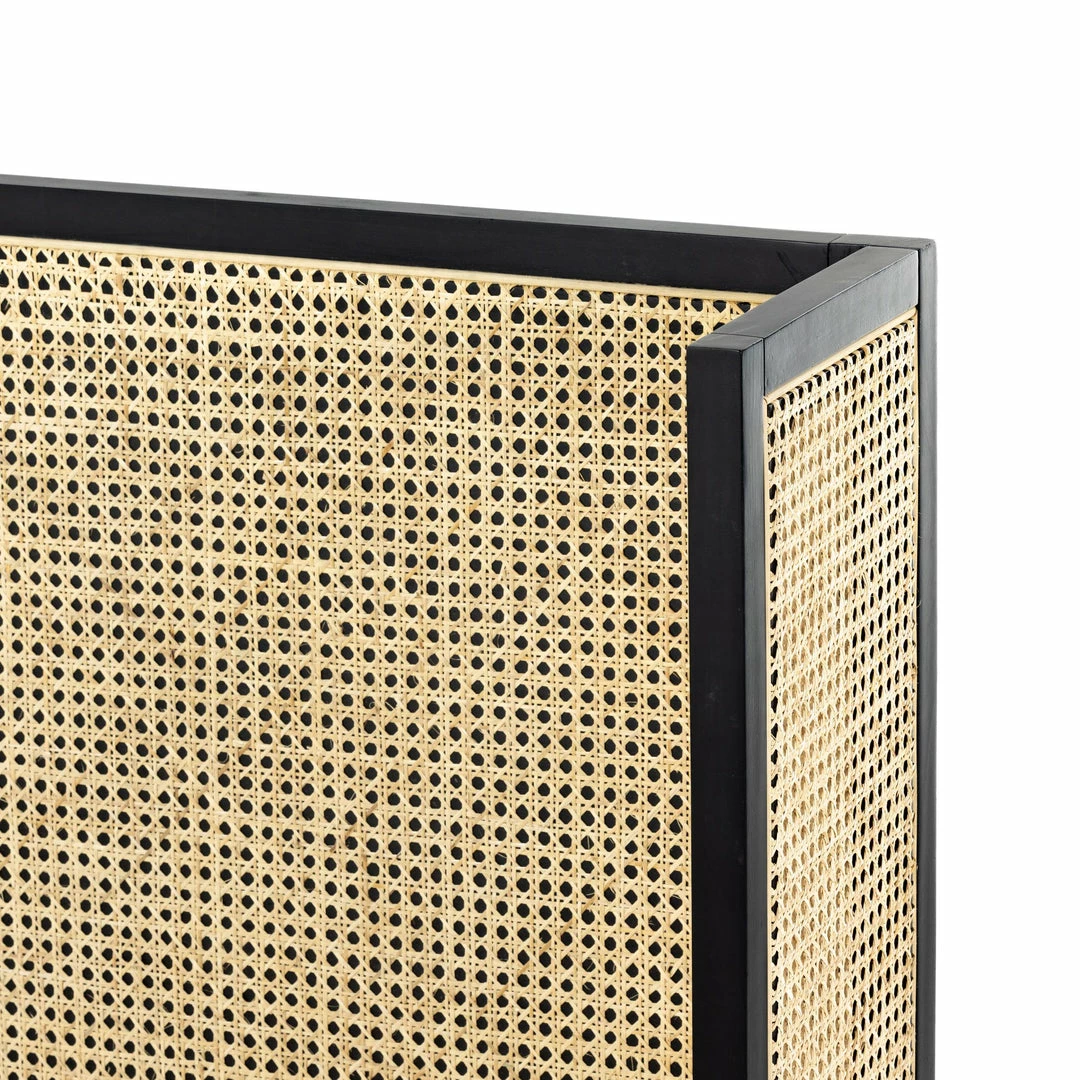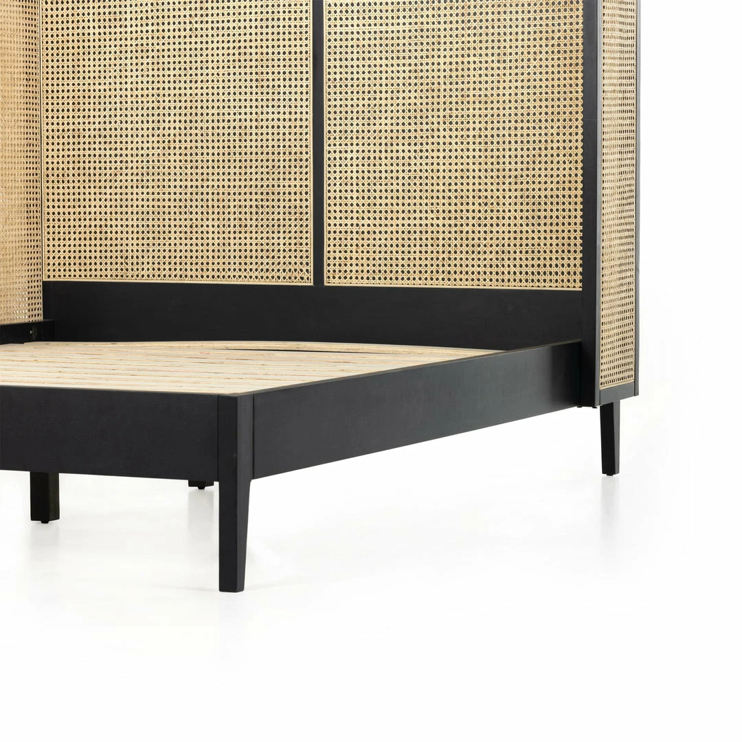 Mixed materials refresh retro styling. A curved headboard of ebony-brushed rubberwood frames a textural inlay of natural cane, for a light, monochromatic look.