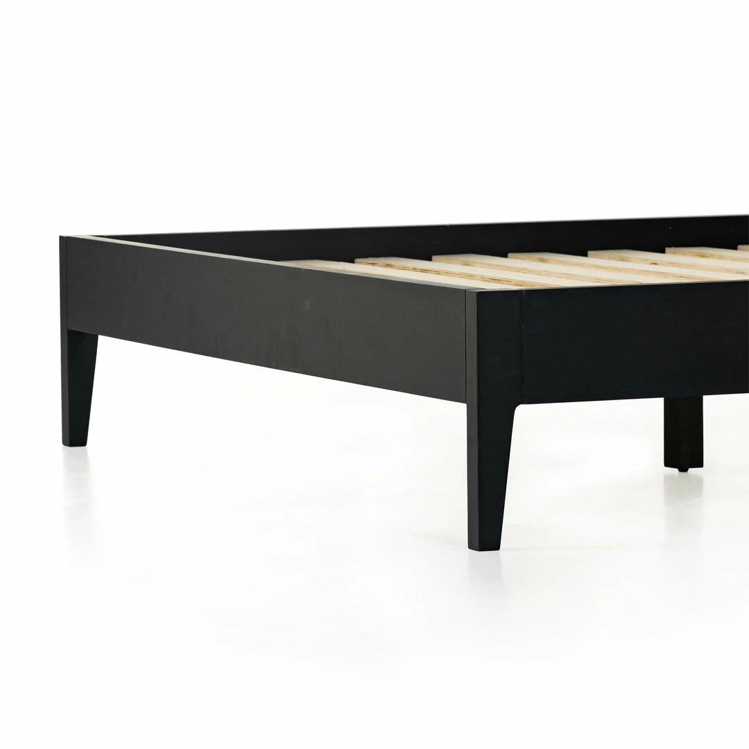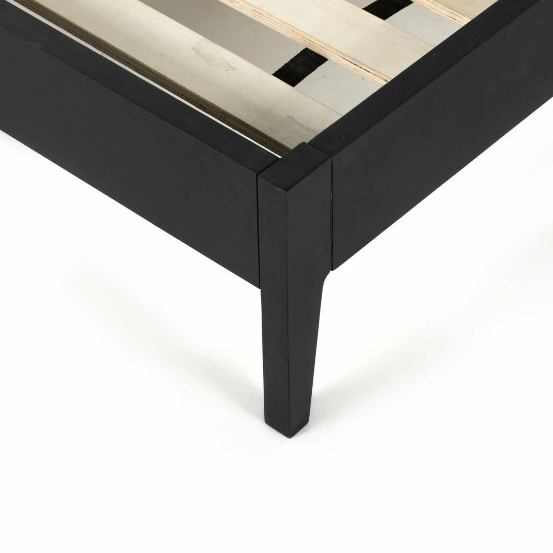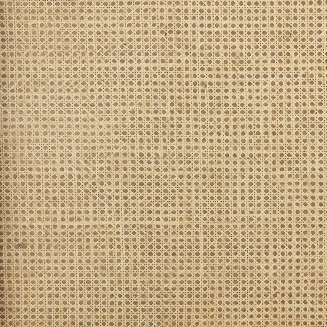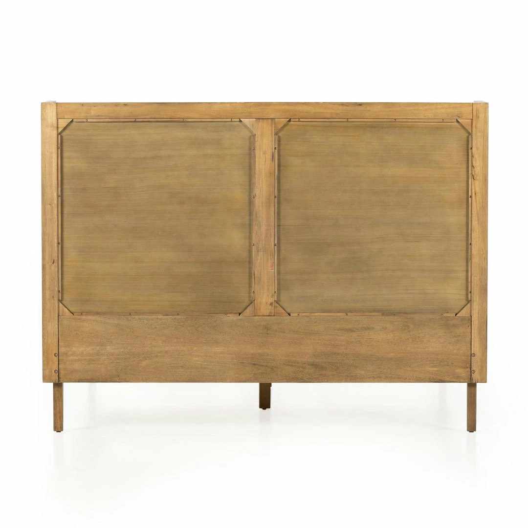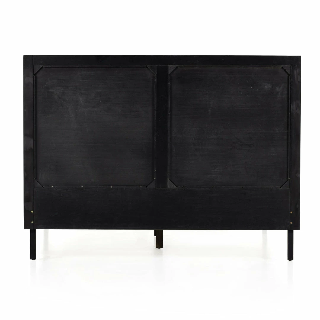 Mixed materials refresh retro styling. A curved headboard of ebony-brushed rubberwood frames a textural inlay of natural cane, for a light, monochromatic look.