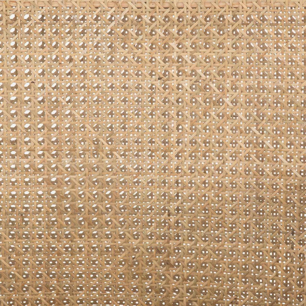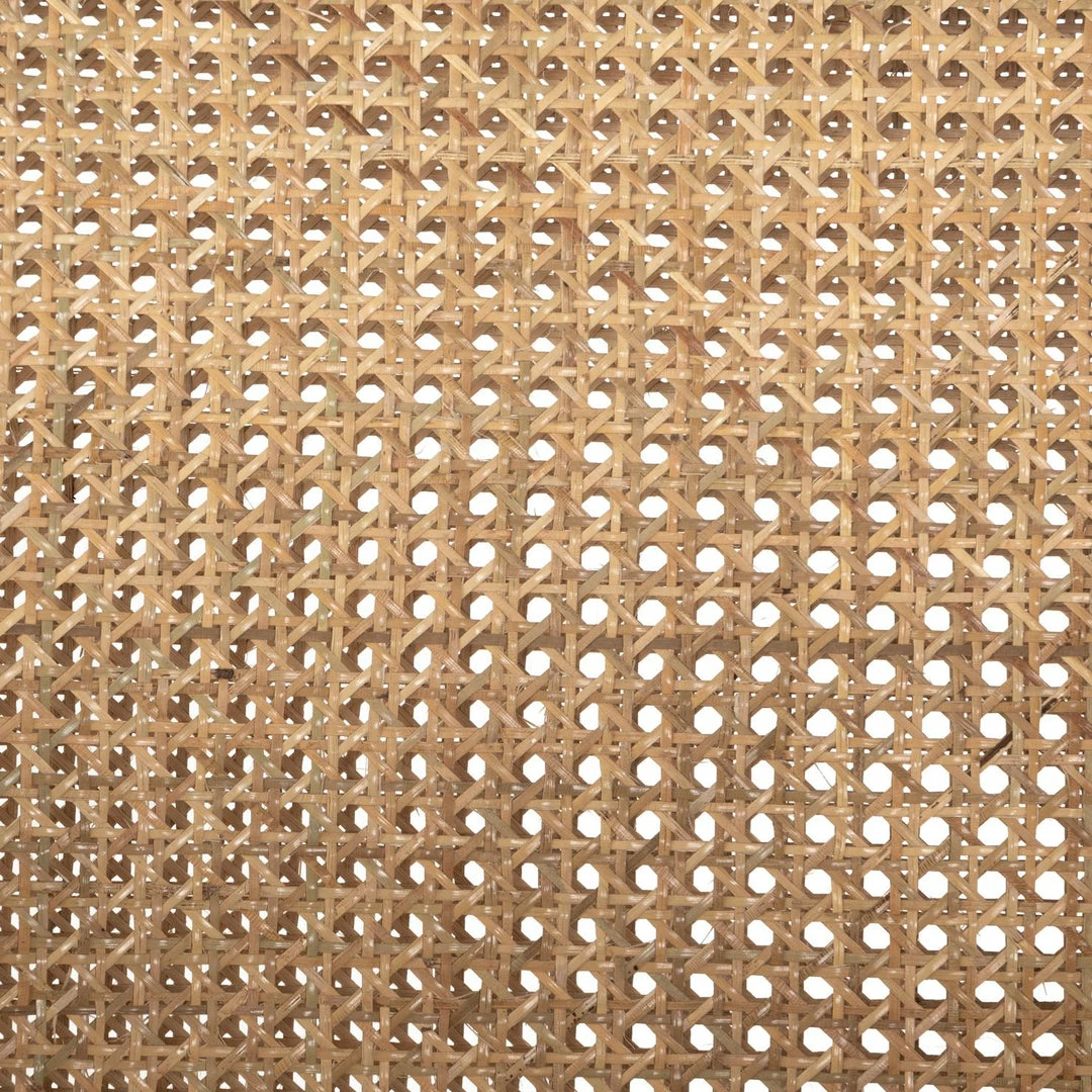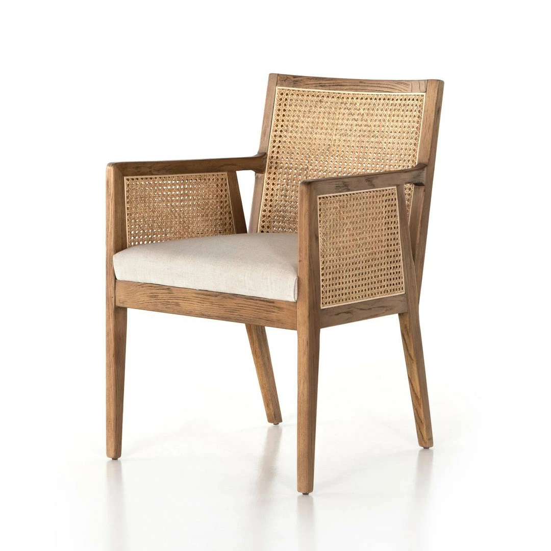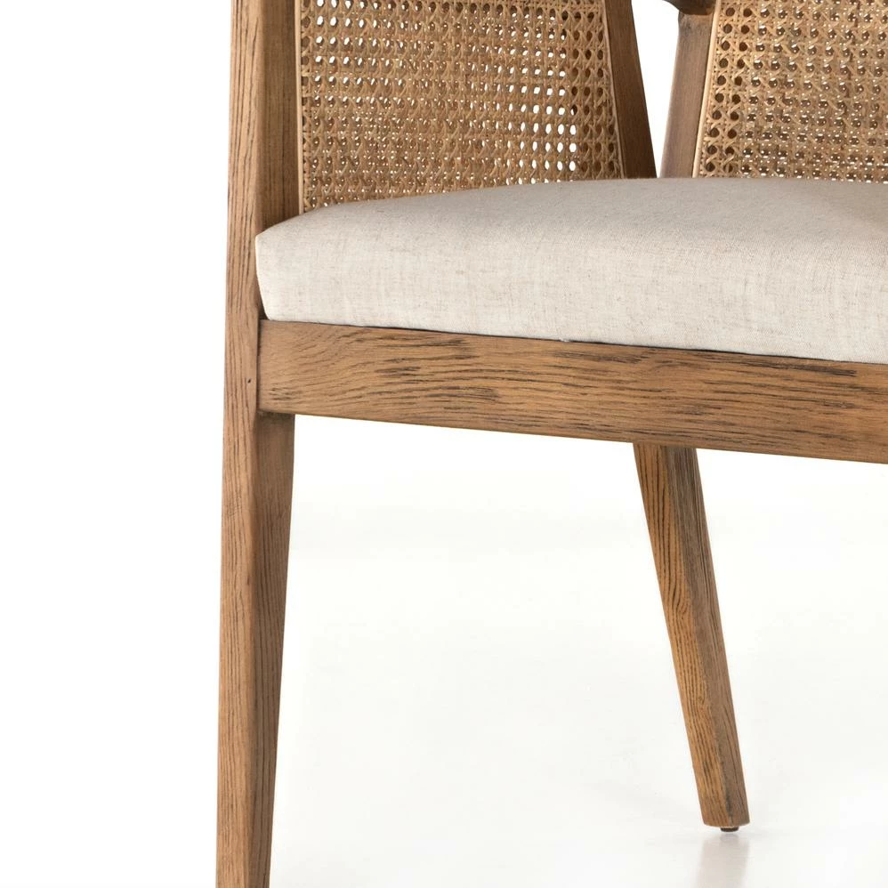 Mixed materials refresh retro dining style. Brushed ebony nettlewood frames a textural inlay of natural cane, for perfect contrast. Neutral linen-blend seating of high-performance fabric for modern sensibility.