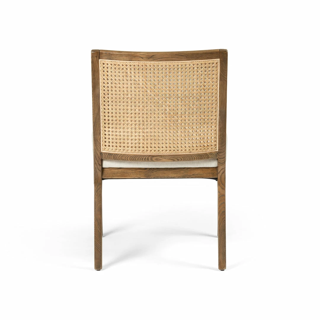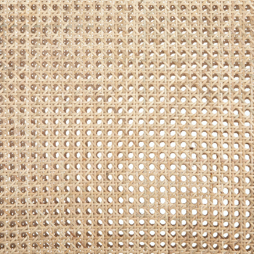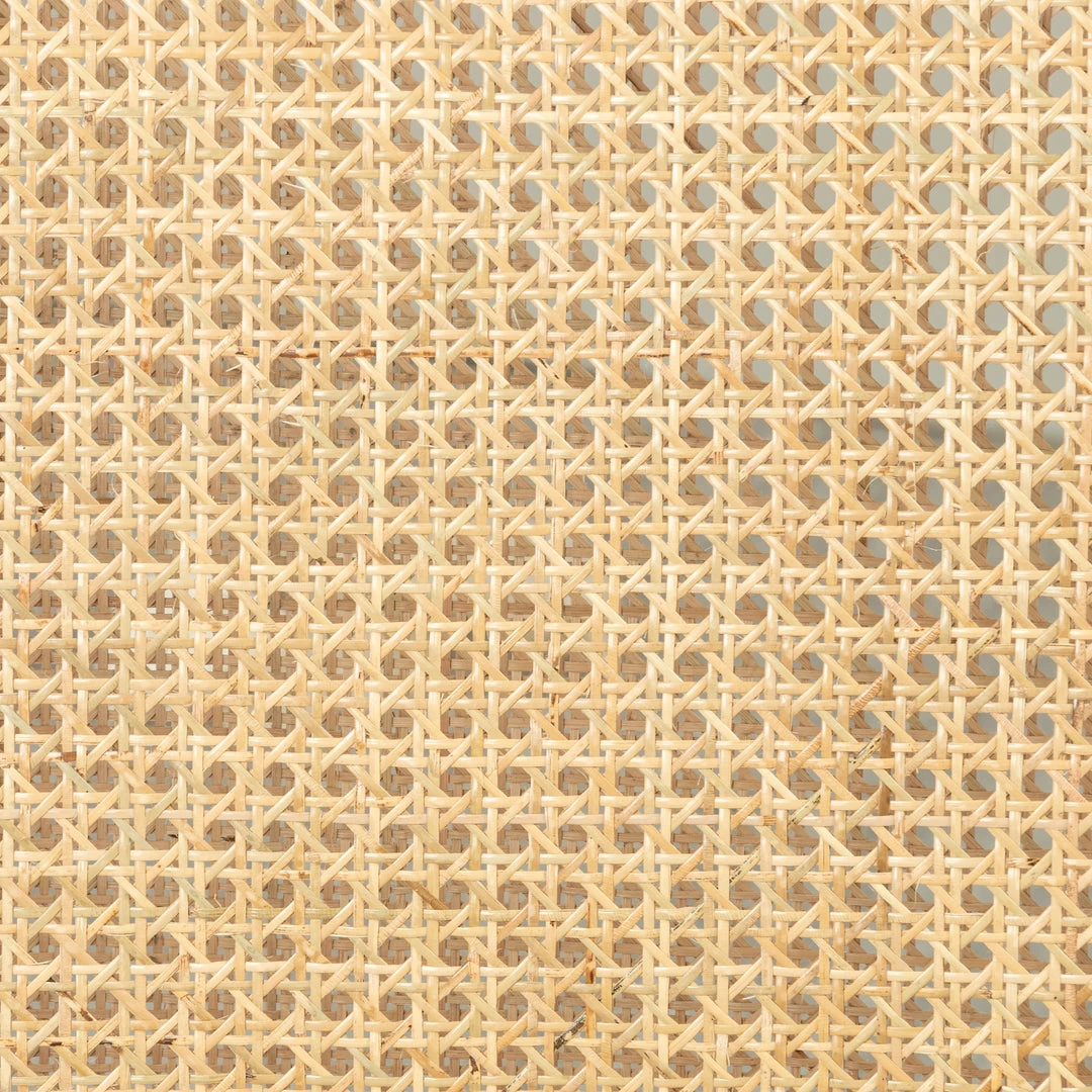 Mixed materials refresh a retro style. Toasted nettlewood frames a textural inlay of natural cane, for a light, monochromatic look. Neutral linen-blend seating of high-performance fabric mix in modern sensibility.