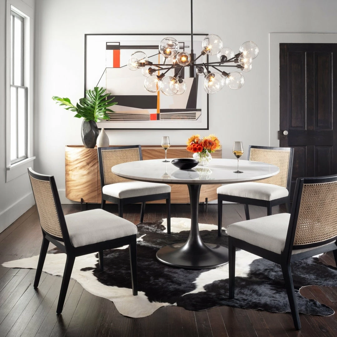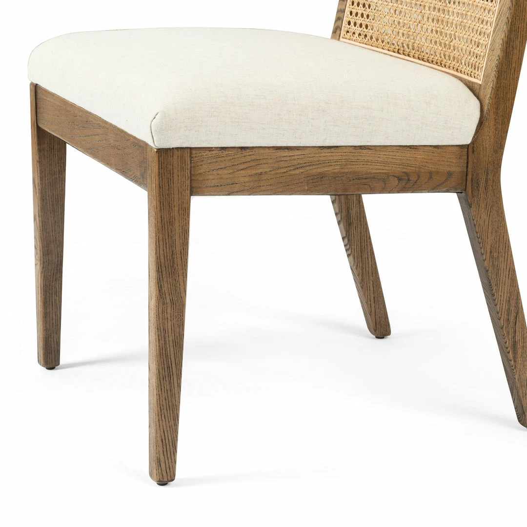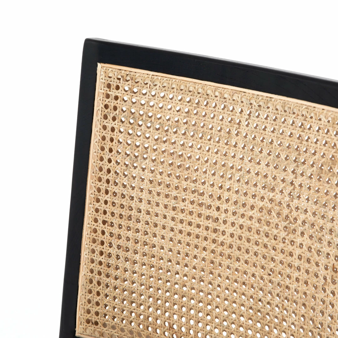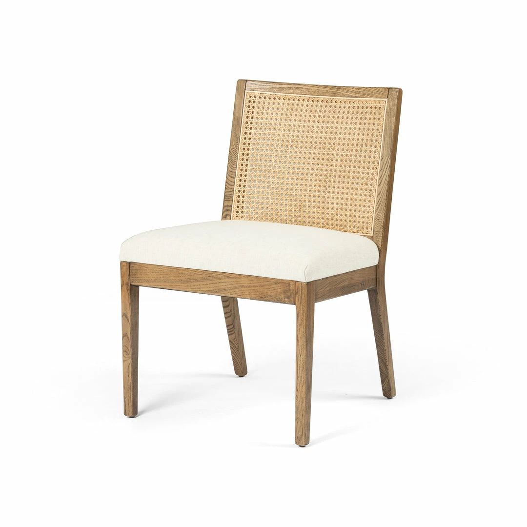 Mixed materials refresh a retro style. Toasted nettlewood frames a textural inlay of natural cane, for a light, monochromatic look. Neutral linen-blend seating of high-performance fabric mix in modern sensibility.