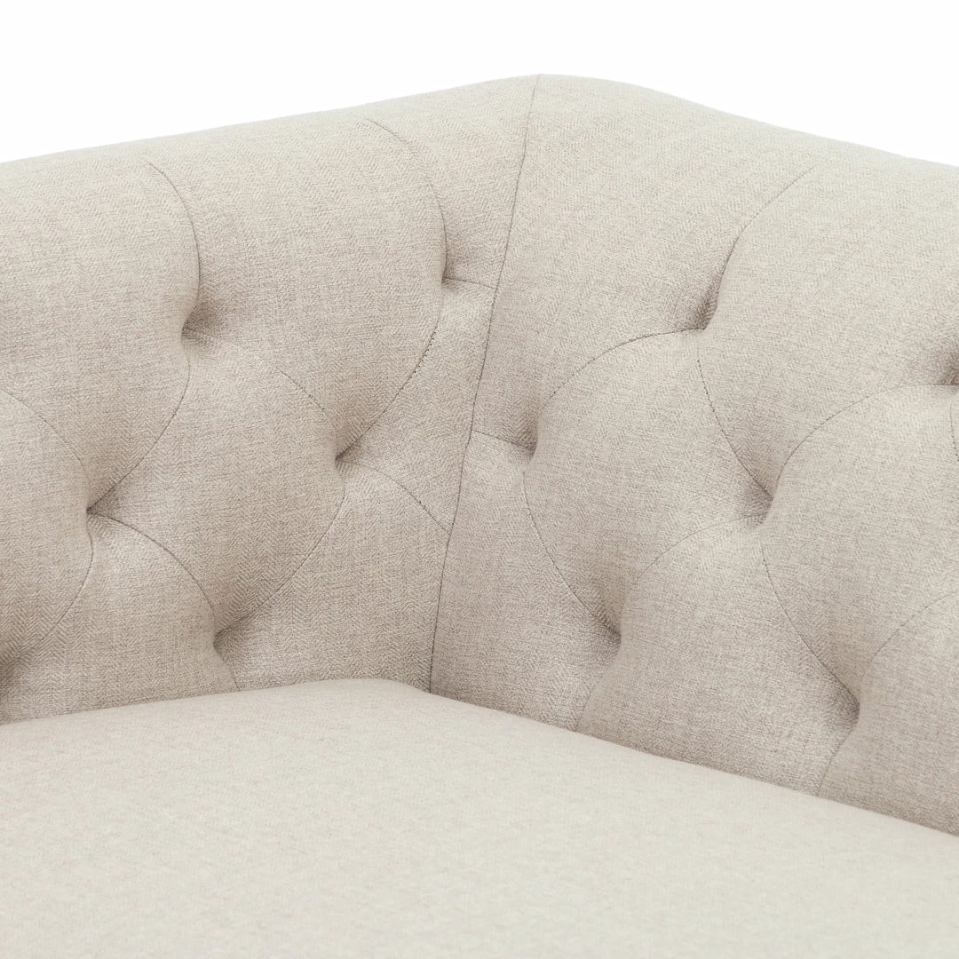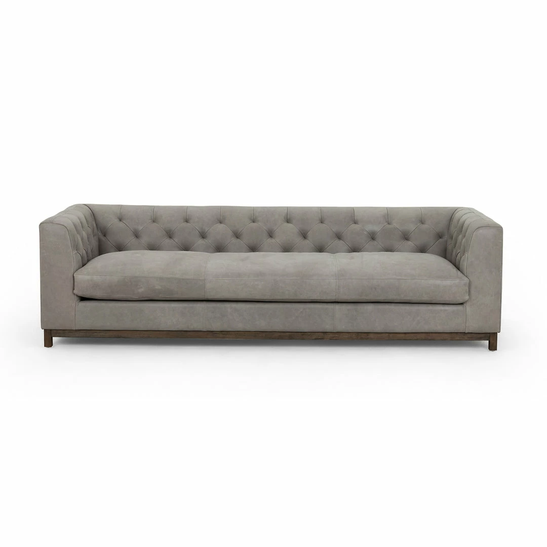 Up updated take on the classic Chesterfield features luxuriously thick-cut top-grain leather in a modern pewter hue. Buttonless tufting lends texture, while a brown wire-brushed parawood base mixes in natural warmth.