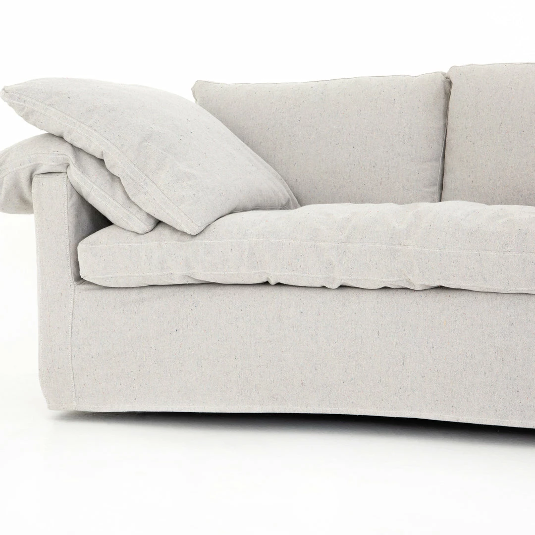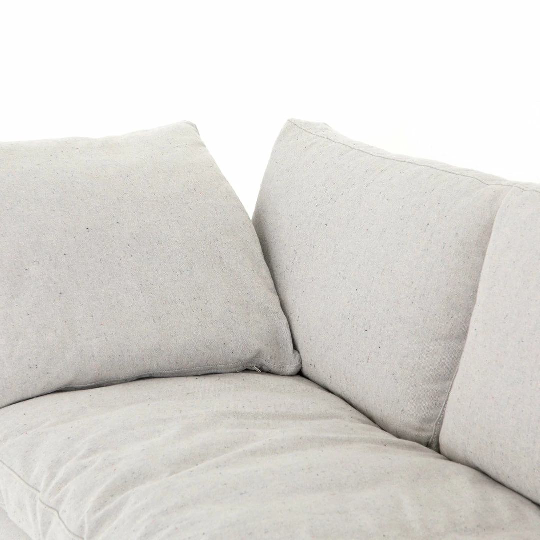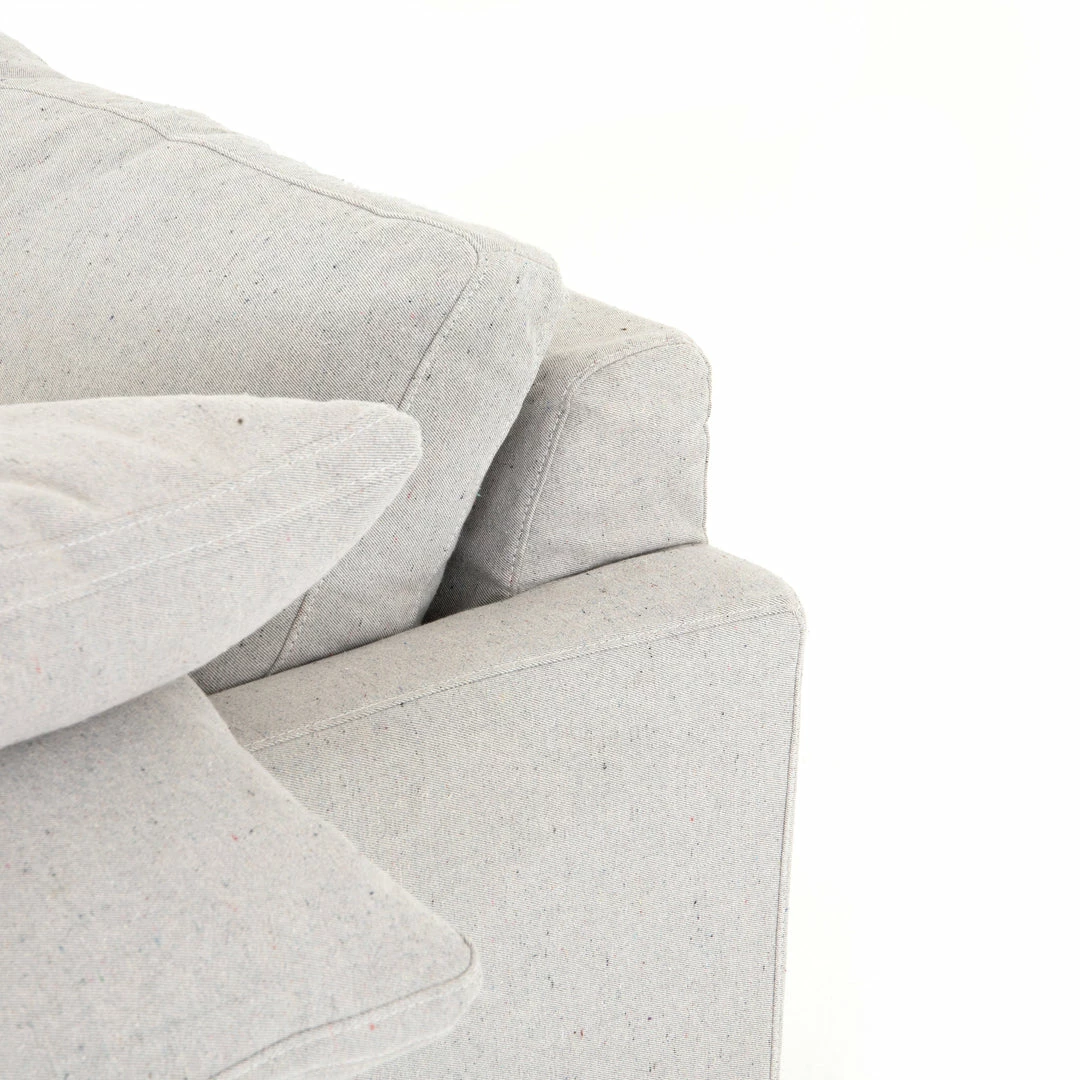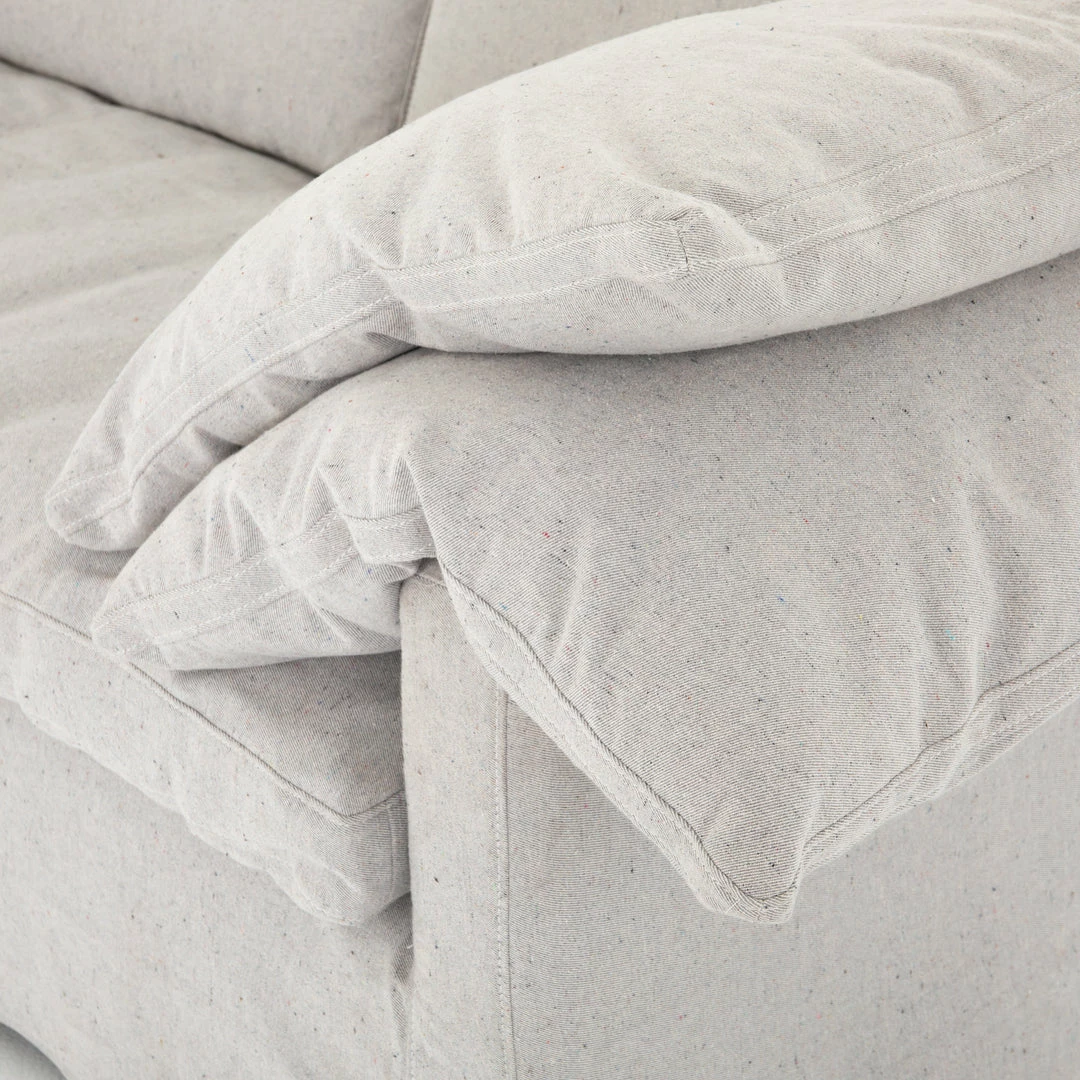 Sink right in. Made from upcycled denim, luxurious, light grey cotton seating features feathery cushioning and casual pillows for total comfort.