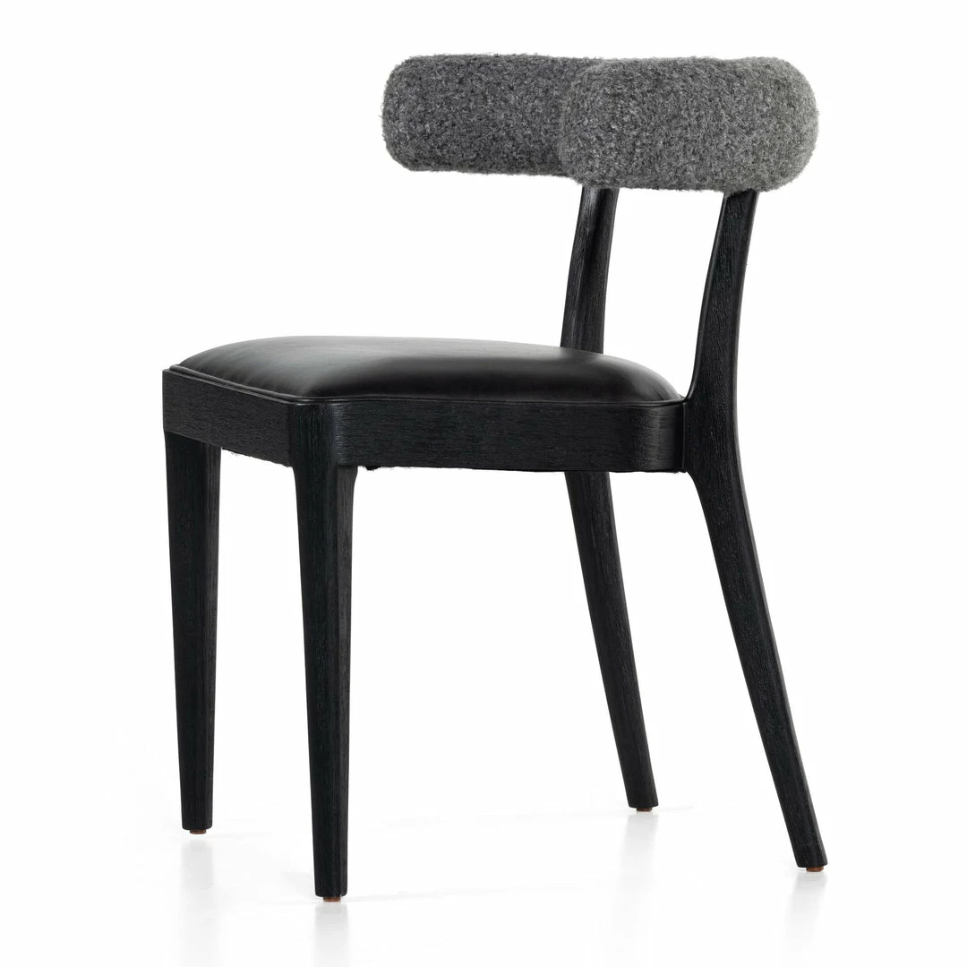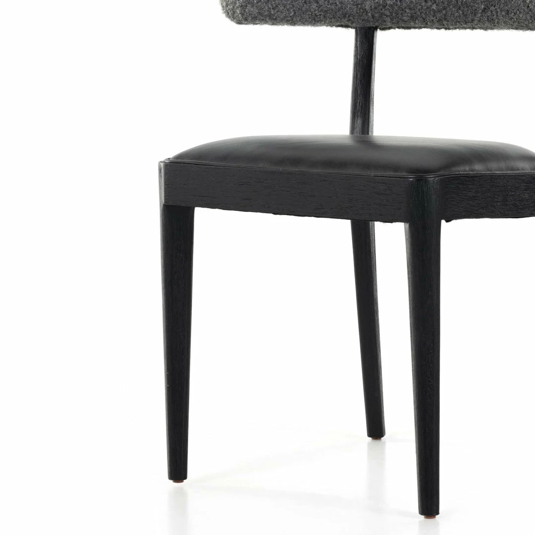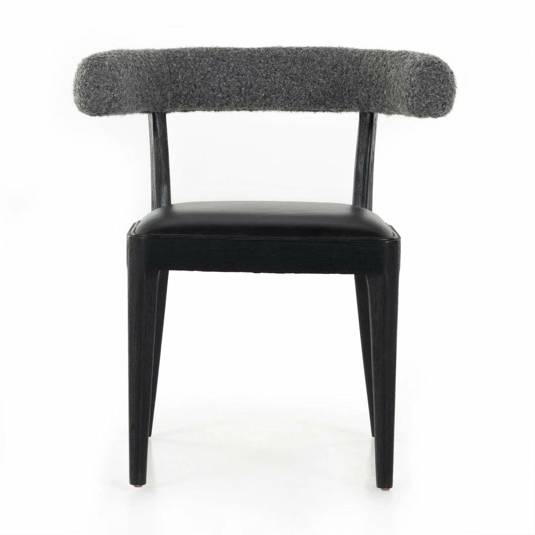 Style and comfort fuse in a slim-profile dining seat of tan top-grain leather, framed by toasted parawood with a sheepskin-wrapped back.