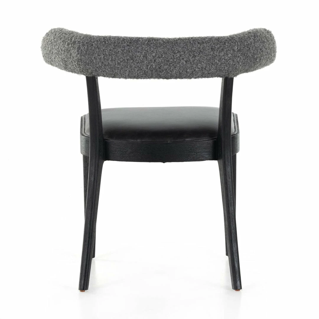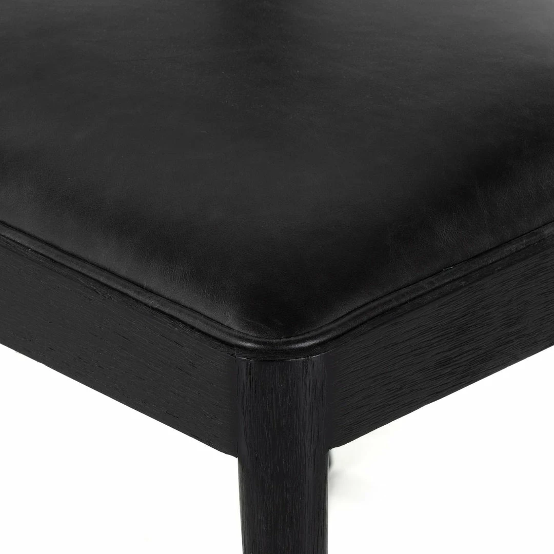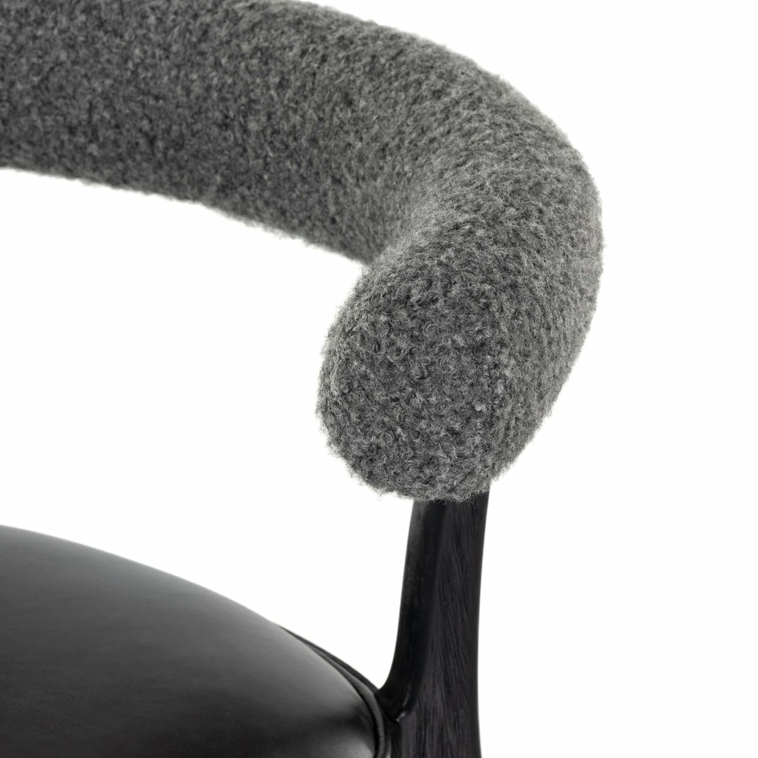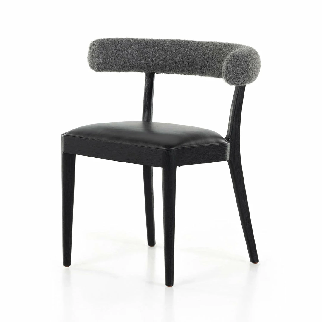 Style and comfort fuse in a slim-profile dining seat of tan top-grain leather, framed by toasted parawood with a sheepskin-wrapped back.
