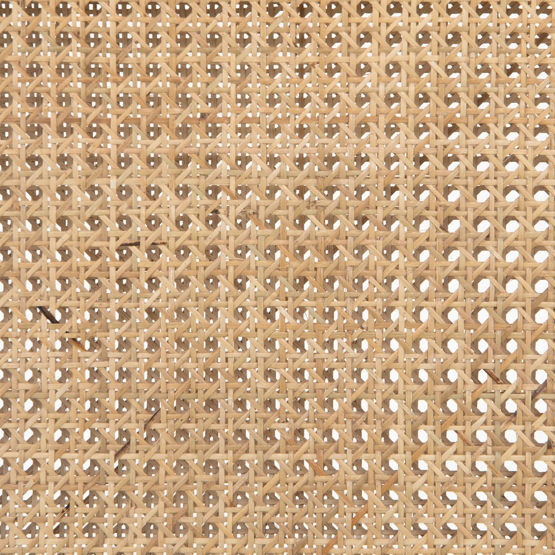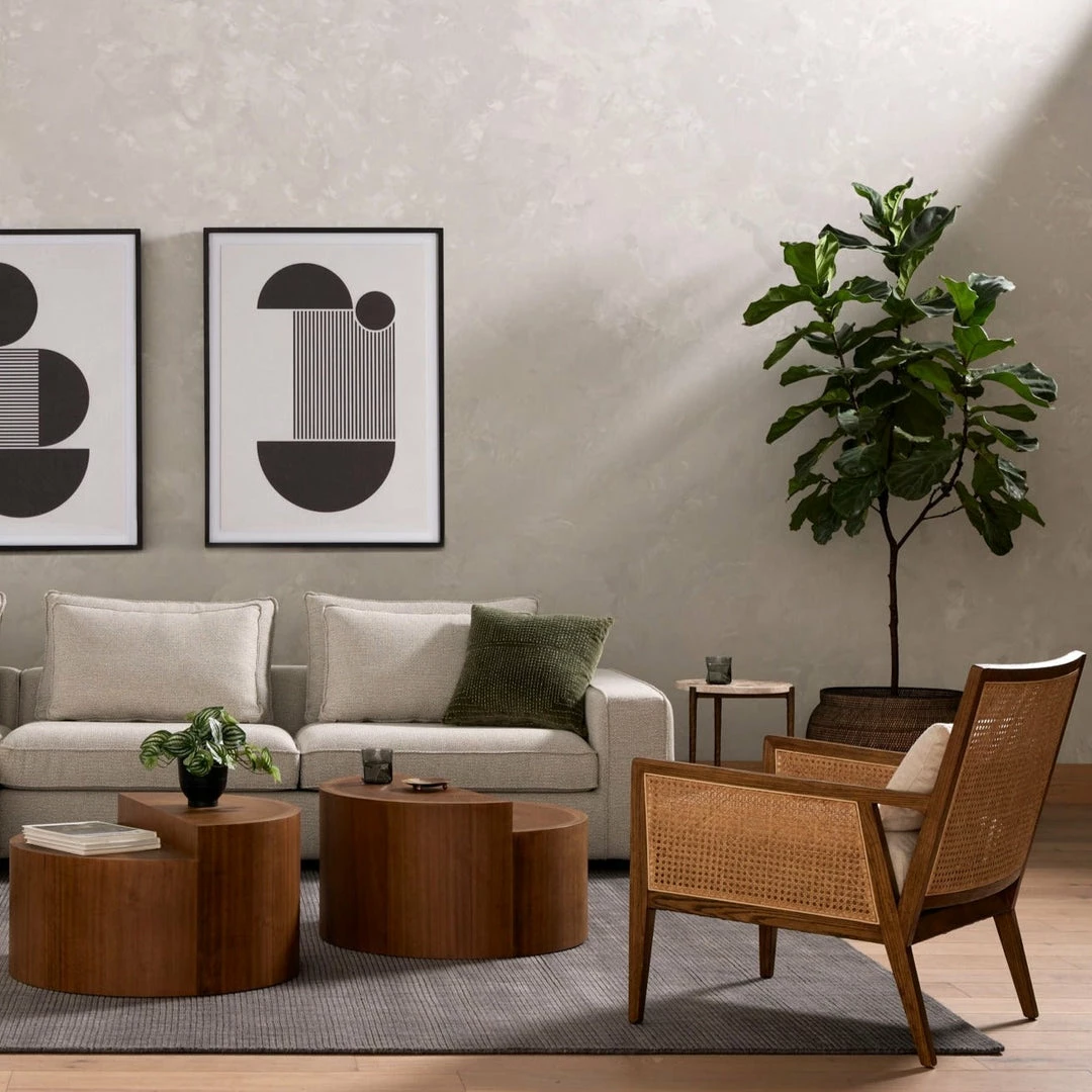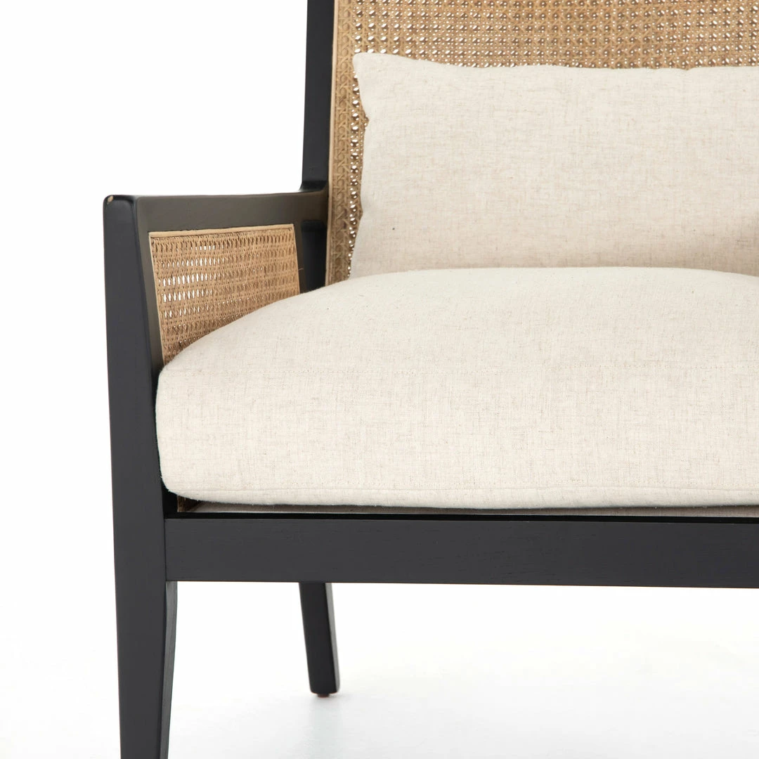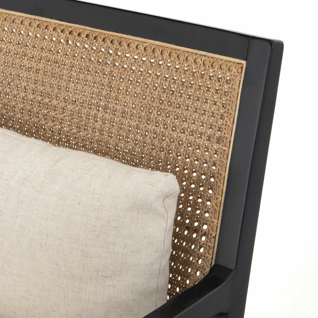 Mixed materials refresh retro seating style. Light-toasted nettlewood frames a textural inlay of natural cane for a clean, monochromatic look, while neutral linen-blend seating of high-performance fabric brings a sense of modern sensibility.