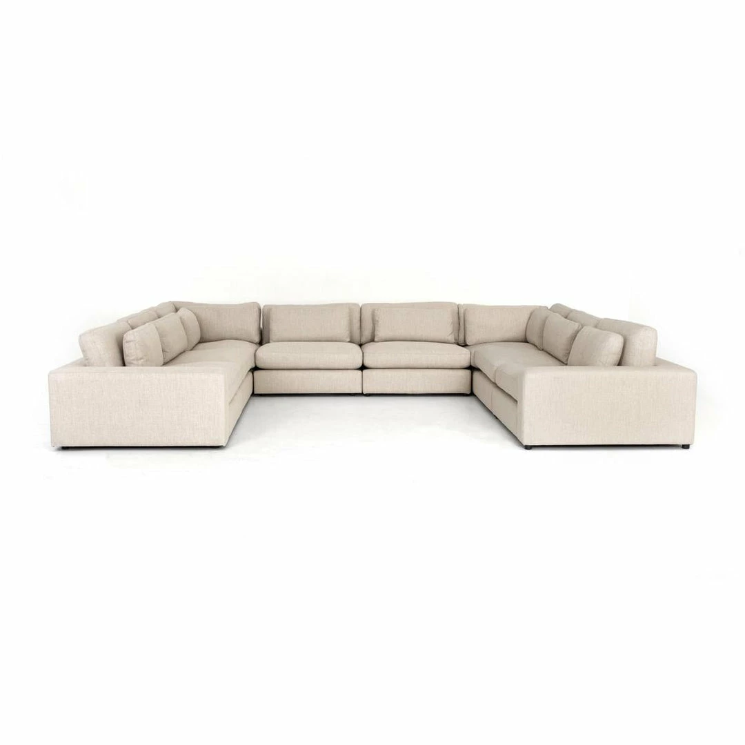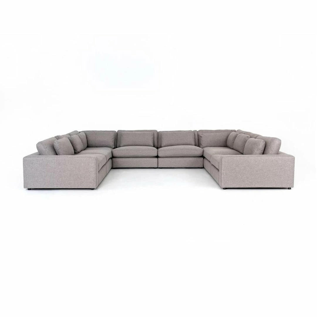 Deep, low seating says relax. An inviting sectional is covered in a soft, durable light grey woven fabric. Modular components allow the perfect combination for any space.
