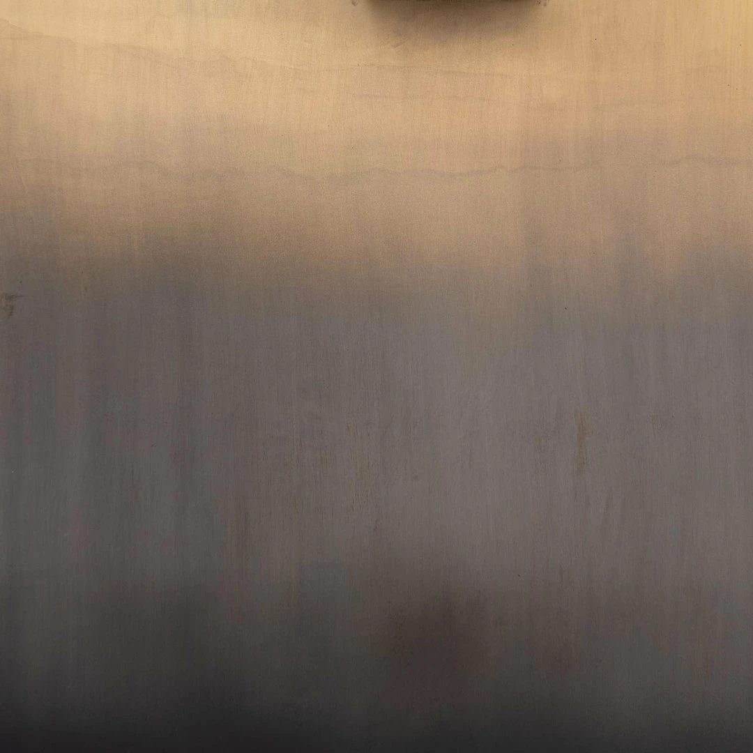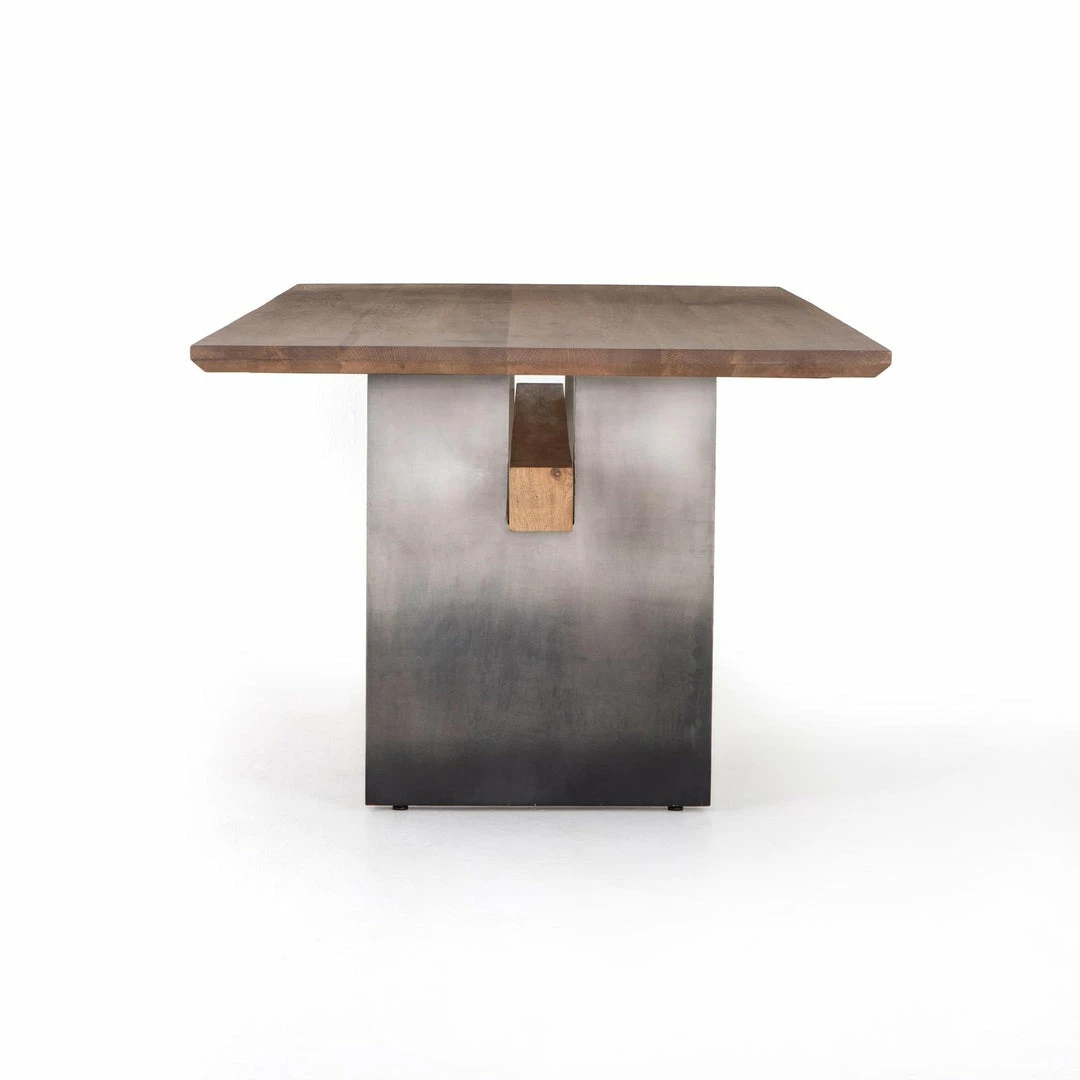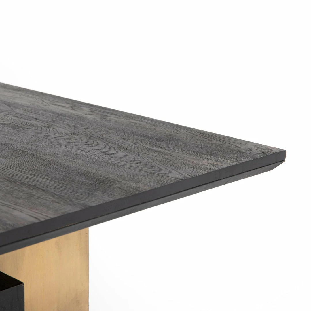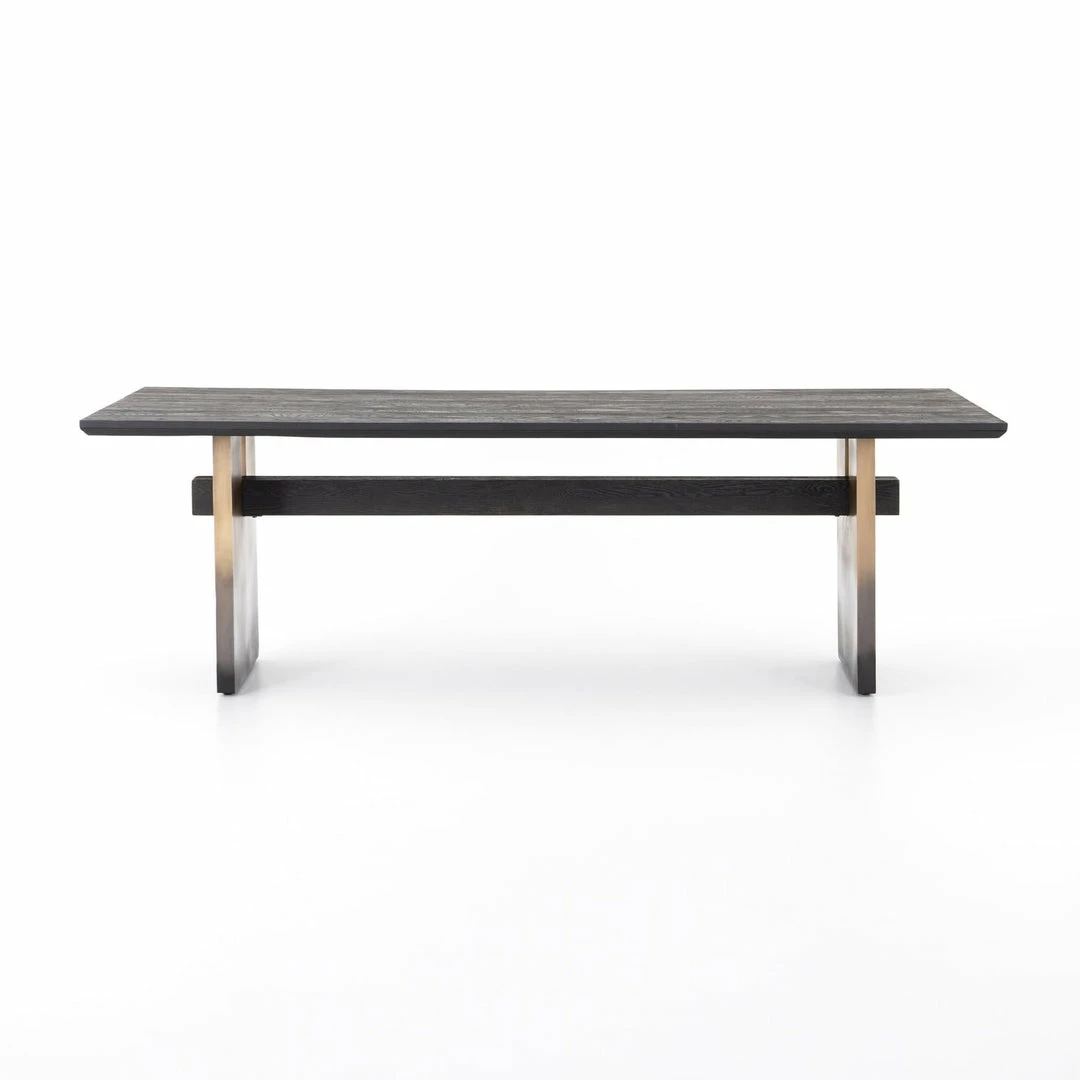 Wide, plank-style legs of brass-finished stainless steel feature an ombre pattern for eye-catching effect, with an intersecting beam adding intrigue. A rectangular black oak tabletop flaunts its materials’ natural graining, for a richly organic takeaway.