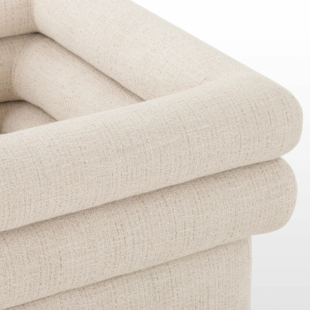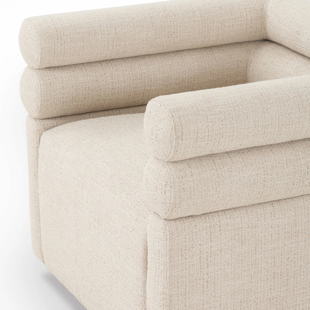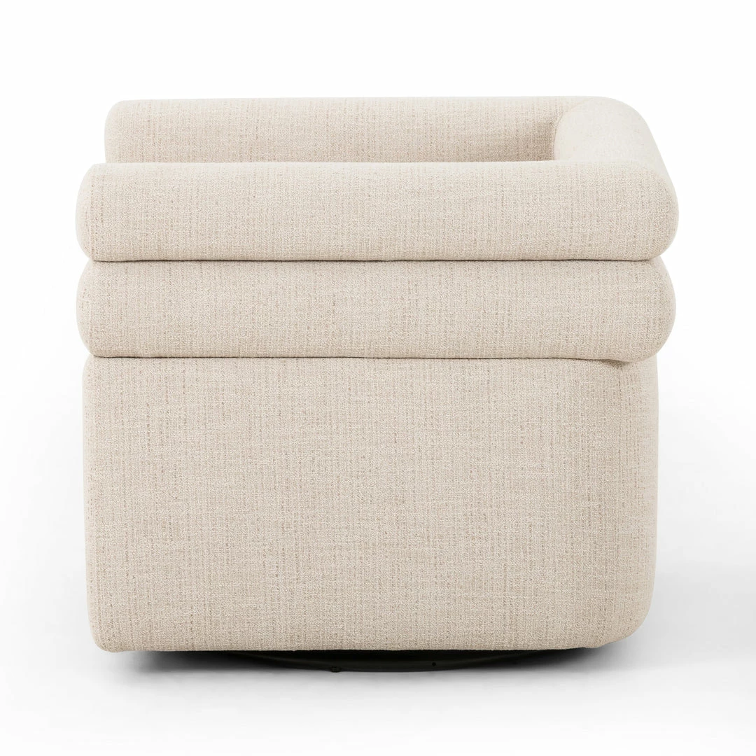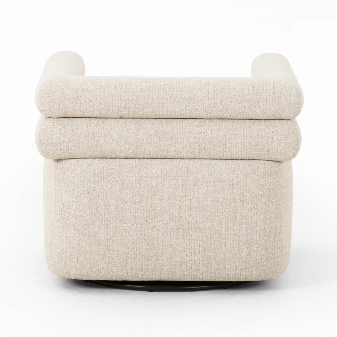 Atop a 360-degree swivel, cleanly shaped seating is upholstered in cream-colored high-performance fabric, for a sensible spin on modern styling.