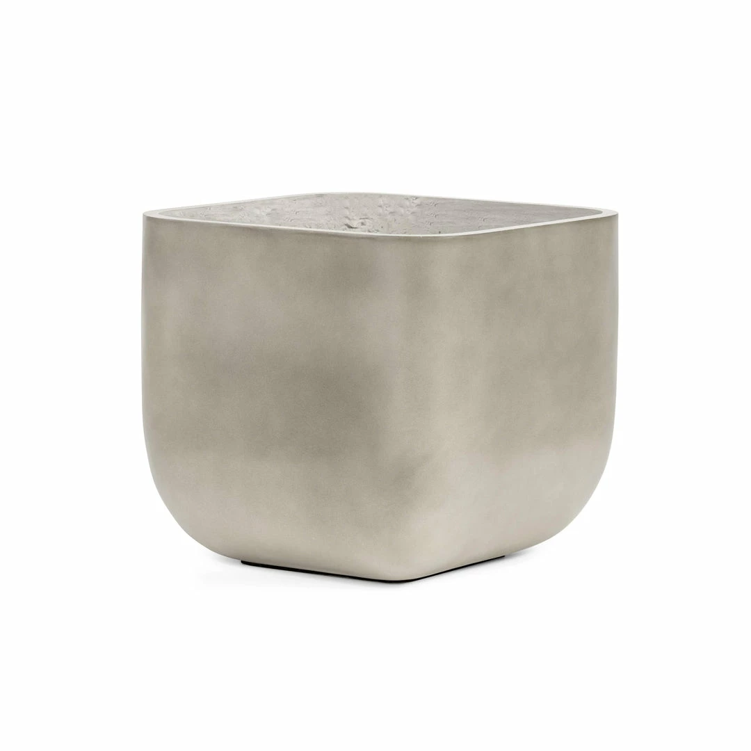 A squared planter of light grey concrete offers a stylish means of displaying favorite plants indoors or out. Cover or store inside during inclement weather.