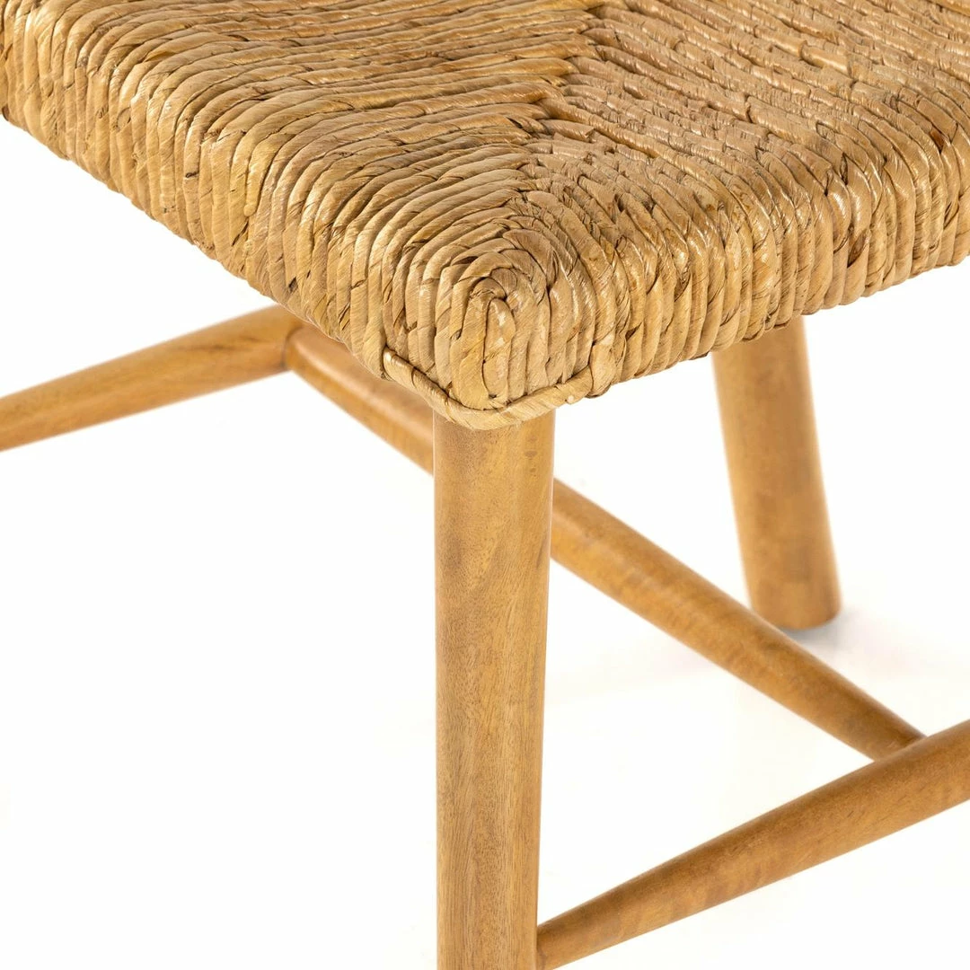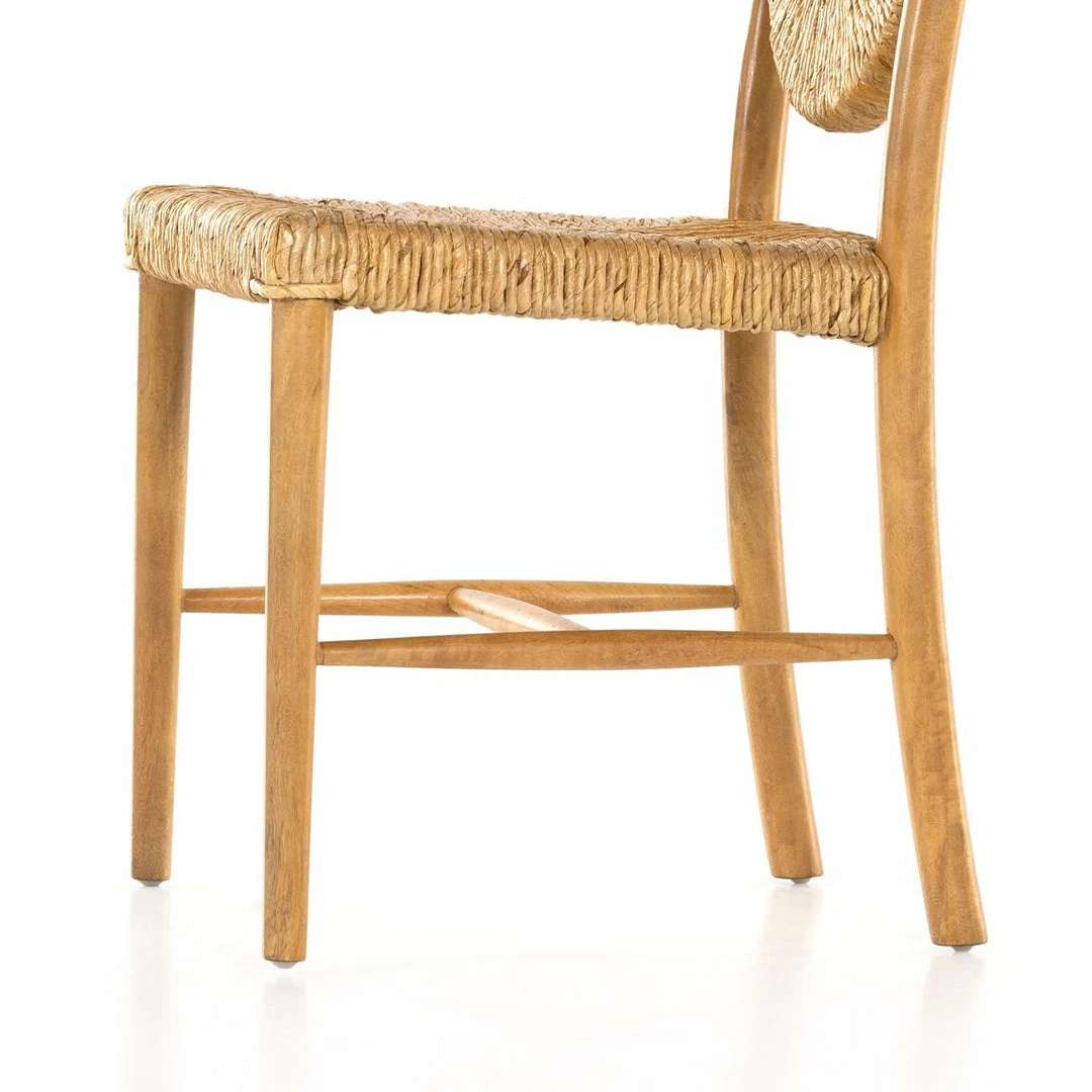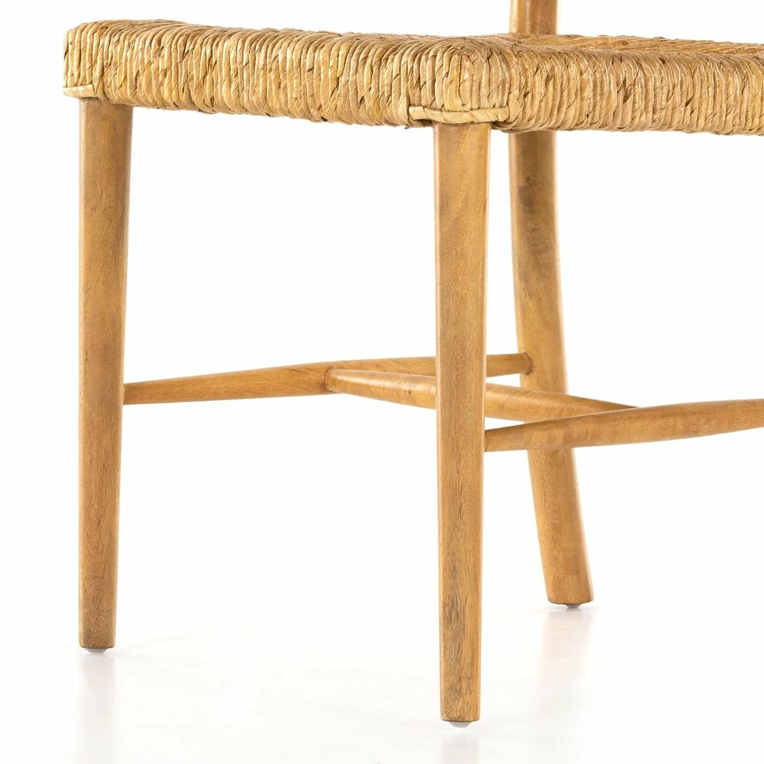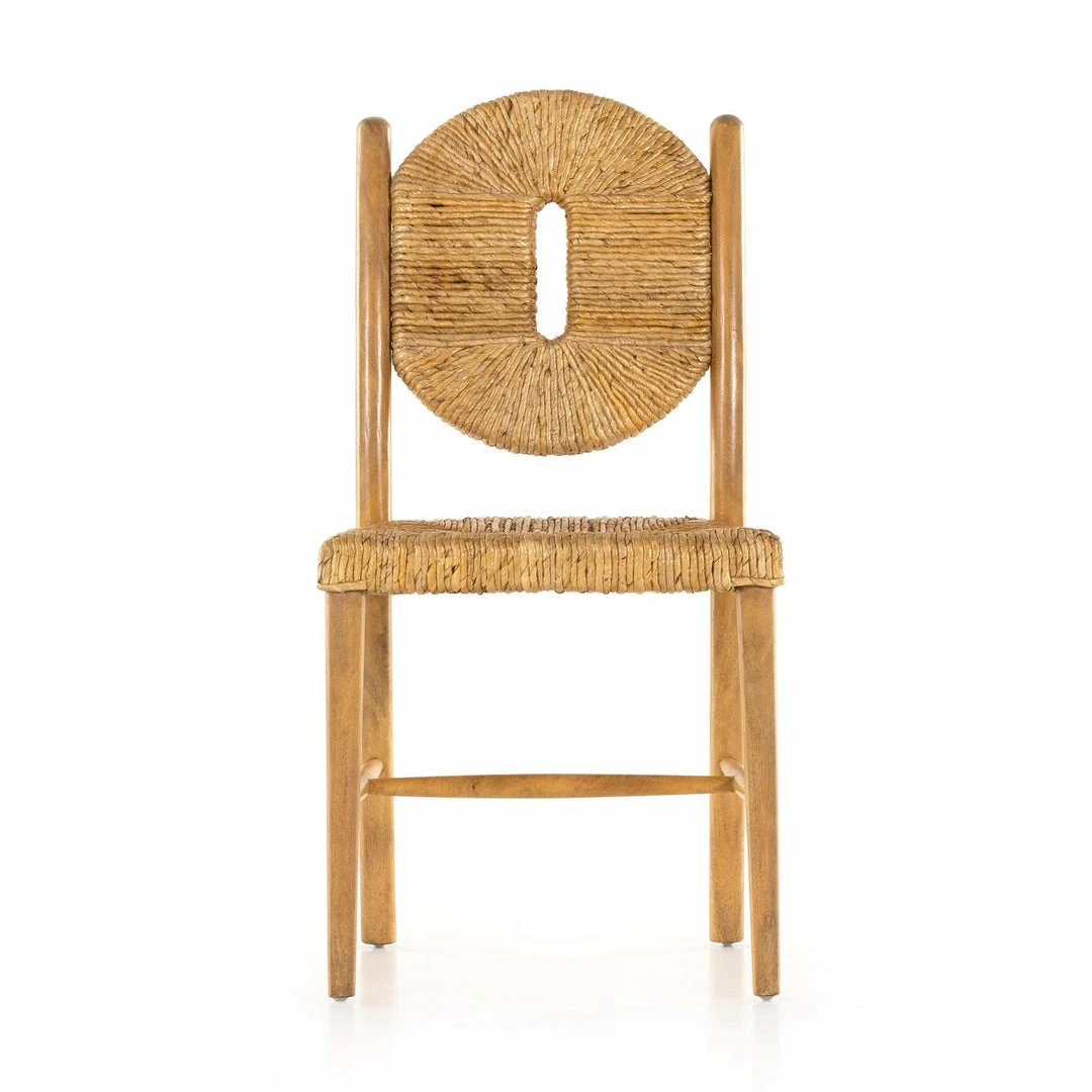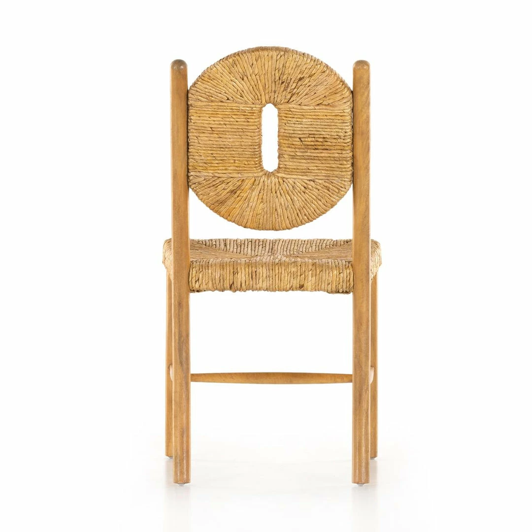 A texture-rich stunner. Solid light-washed mango forms a simple frame for woven, radial-style seating made from dark-bleached banana leaf.