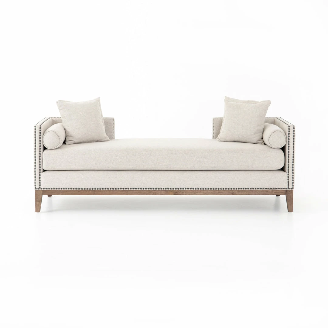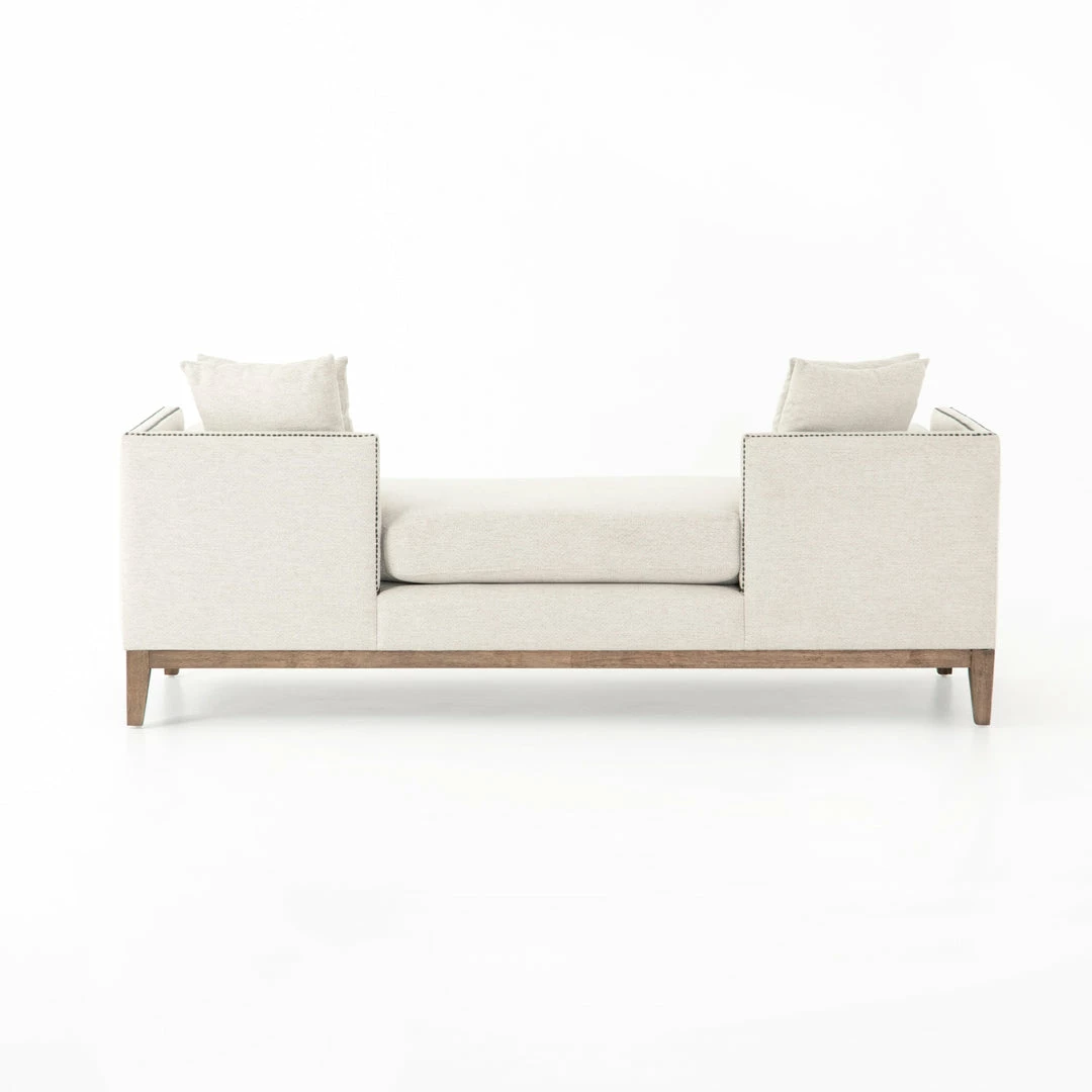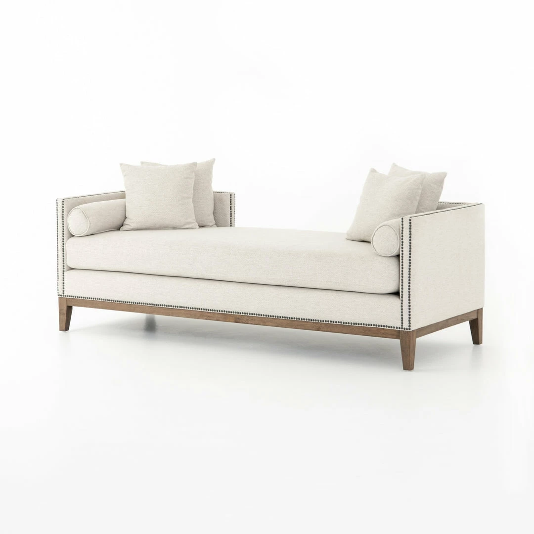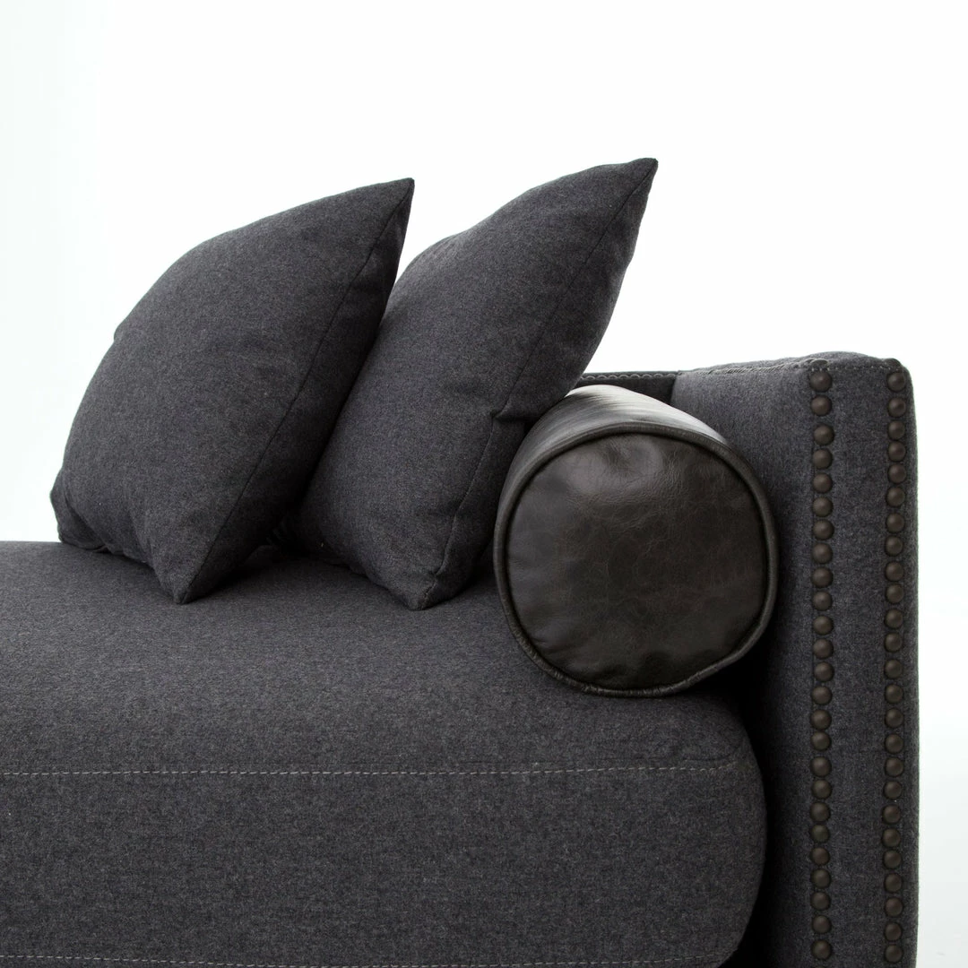 Mixed materials and an open chaise design make for dynamic, distinctive seating. Low, parawood legs with neutral stone covering, aged brass nailheads and plenty of pillows for comfort.